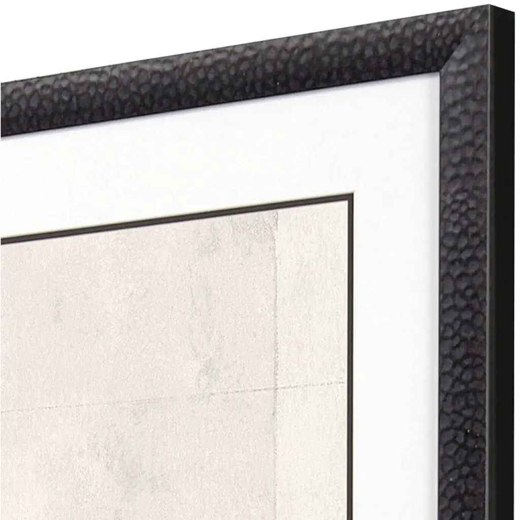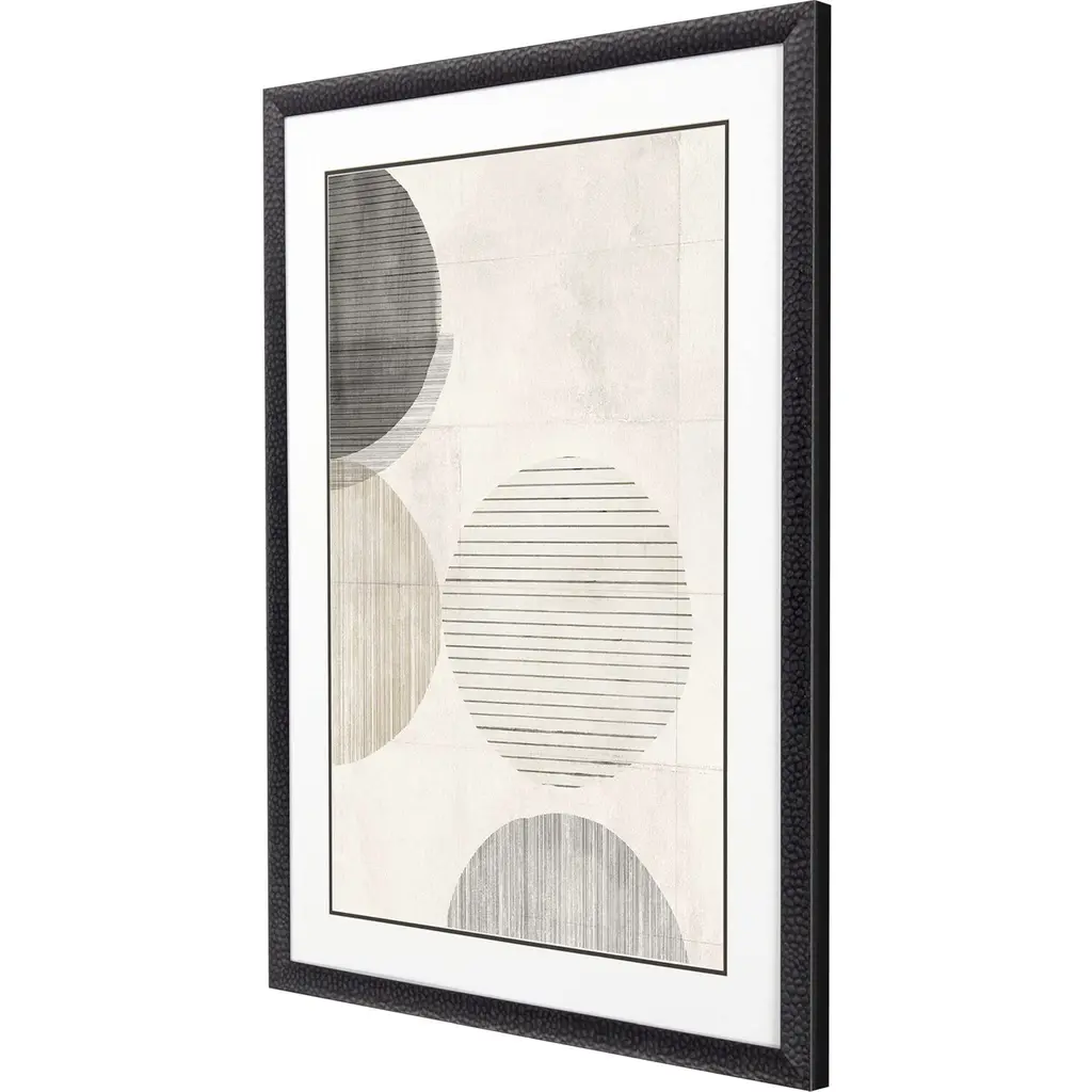 Striped spherical shapes are matted in white. Framed in a modern rubbed matte black wood with honeycomb embossing.