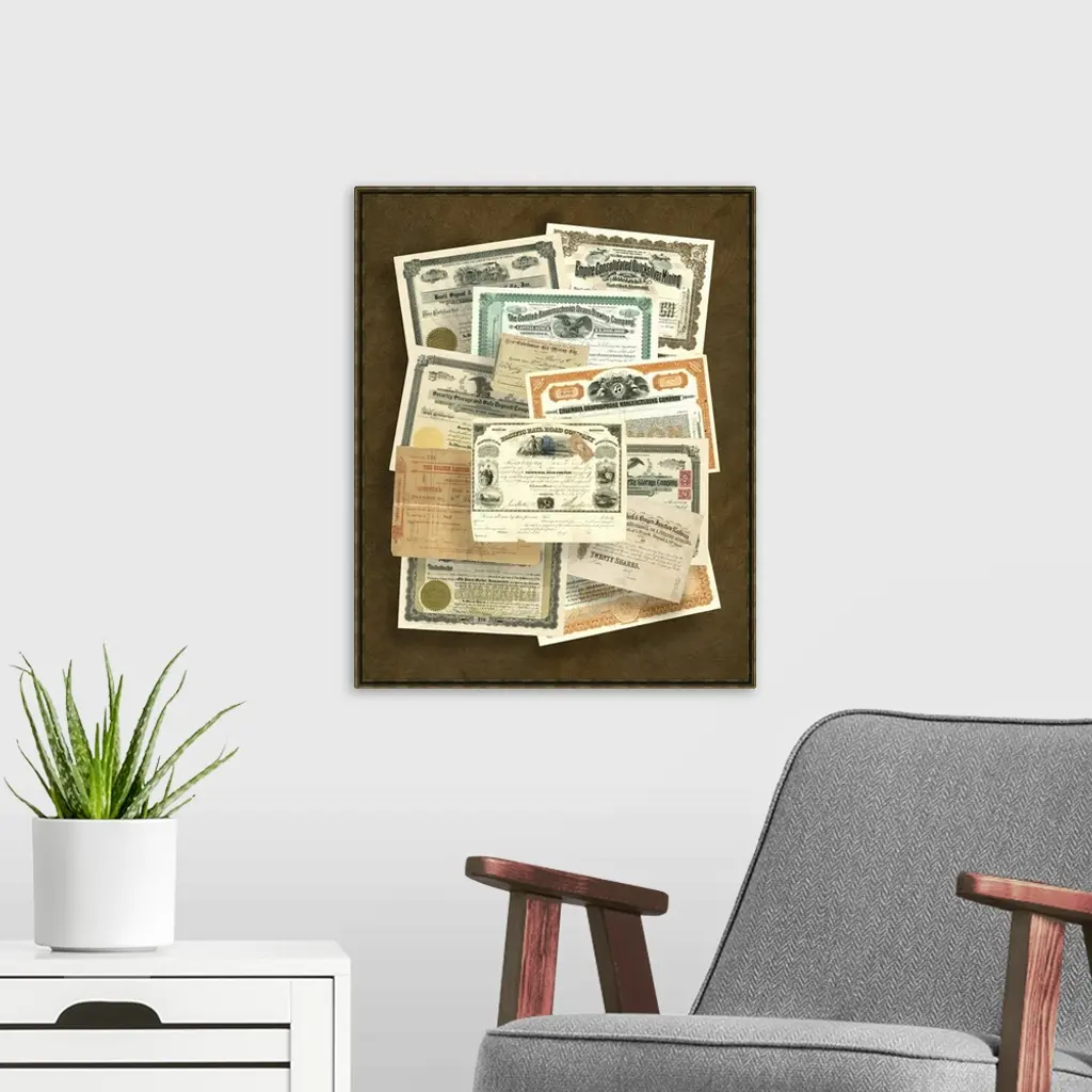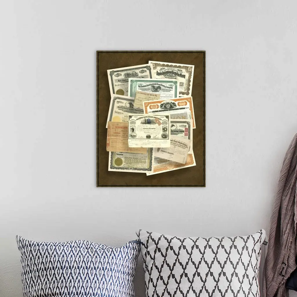 Stock Certificate Collection wall art for home and office decor. Discover canvas art prints, photos, mural, big canvas art and framed wall art in GreatBigCanvas.com's varied collections.