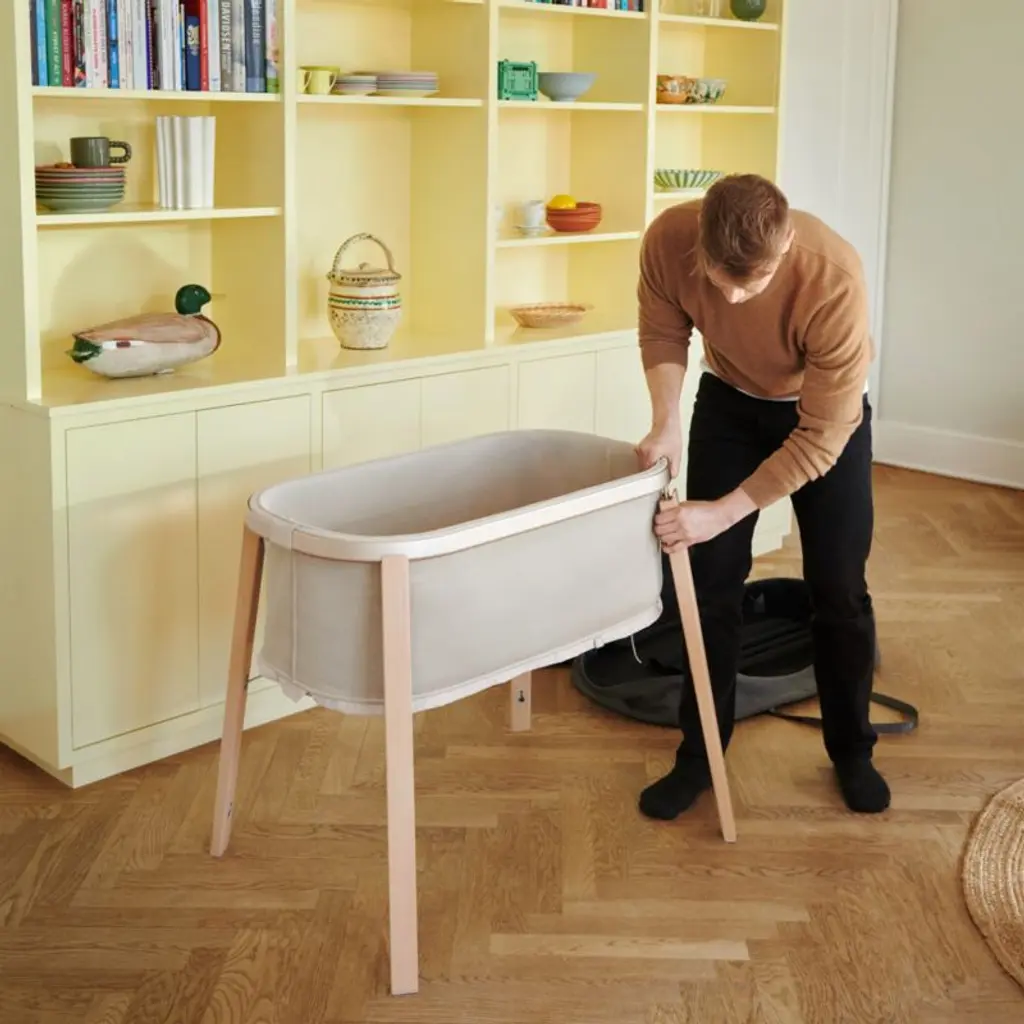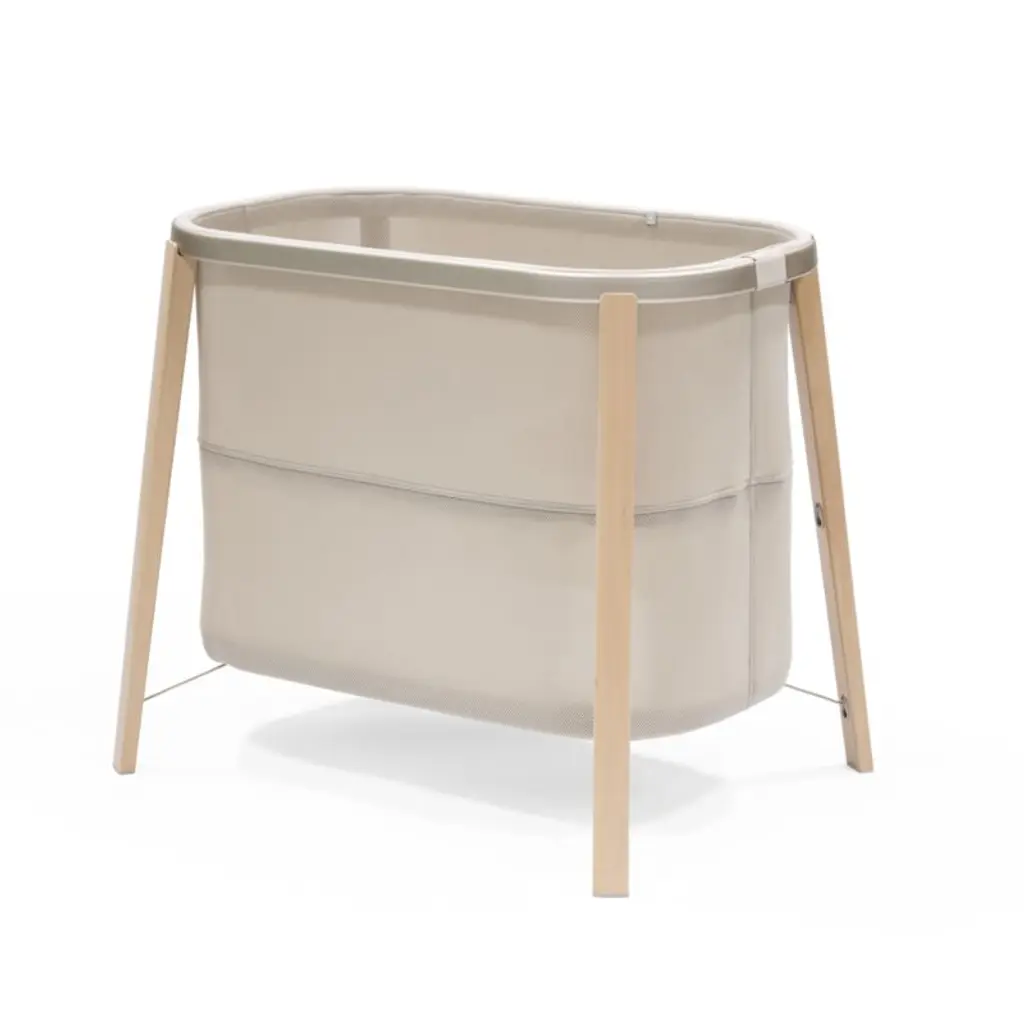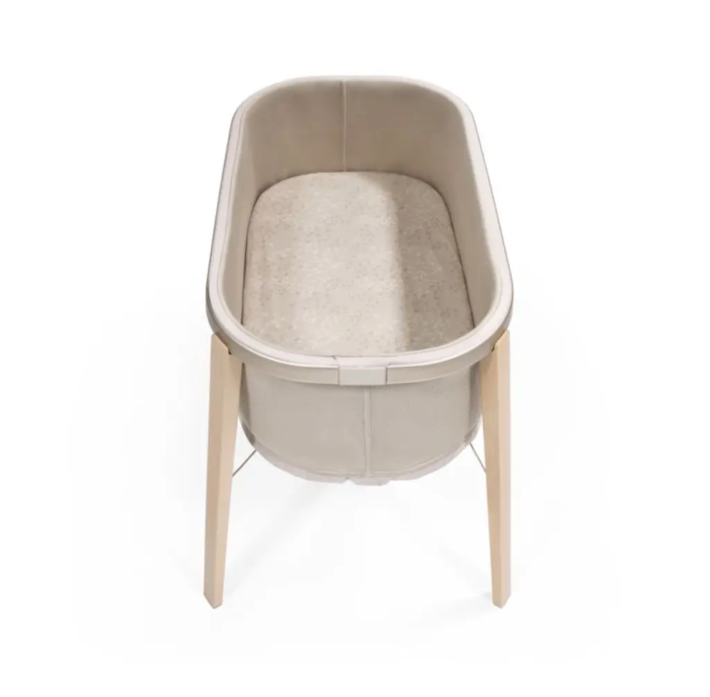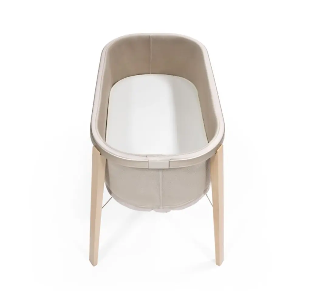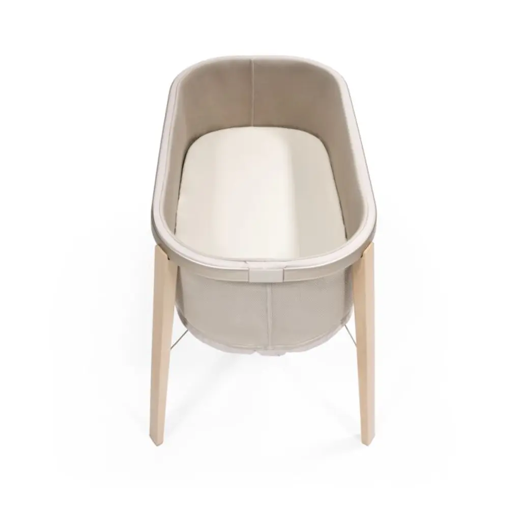 Airy and light with a design-forward oval shape, the sandy beige Stokke® Snoozi bassinet is a beautiful first sleeping space for babies, whether in the nursery or placed near a parent's bed. The firm, comfortable mattress and breathable 3D mesh fabrics make it the perfect place for your newborn to rest, sleep and nap in every room in your home. It adjusts as your little one growsuse the high newborn position for the first 6 months, then lower the mattress when your baby can pull themselves up for use up to 9 months. When it's time for an overnight trip, fold the bassinet flat and carry it in the included travel bagthen easily reassemble it to create a cozy sanctuary wherever your baby may be.