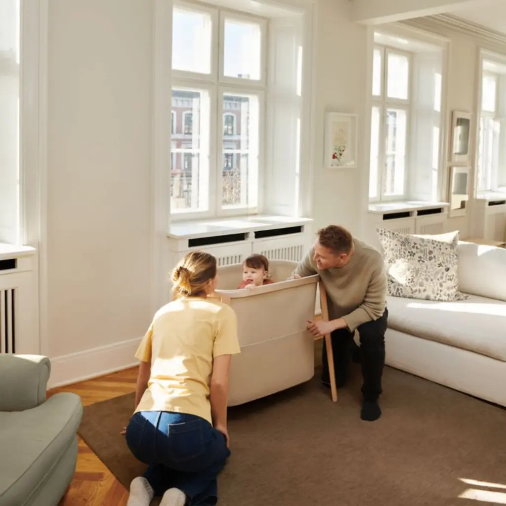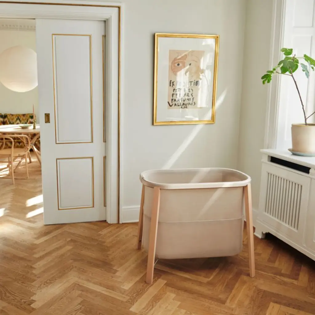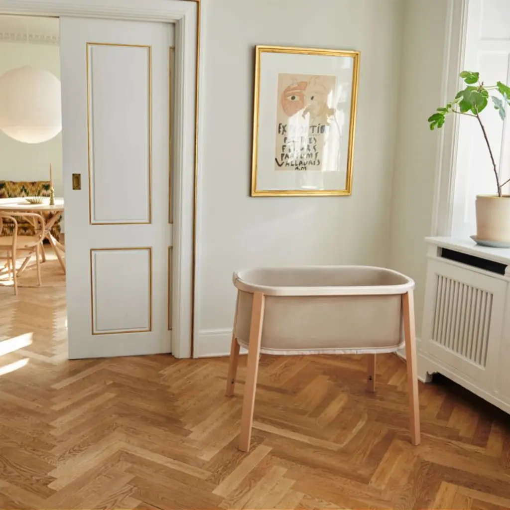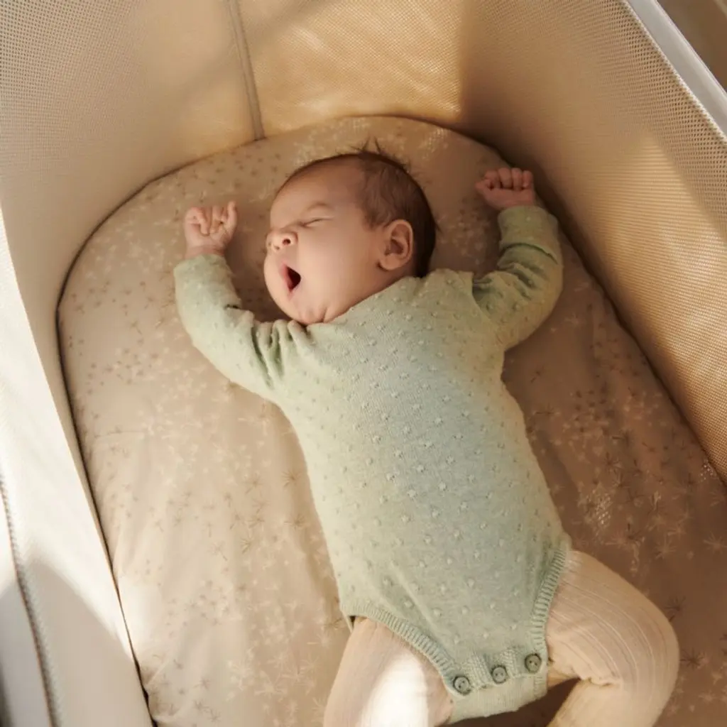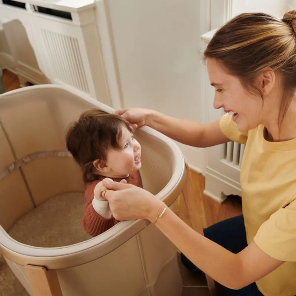 Airy and light with a design-forward oval shape, the sandy beige Stokke® Snoozi bassinet is a beautiful first sleeping space for babies, whether in the nursery or placed near a parent's bed. The firm, comfortable mattress and breathable 3D mesh fabrics make it the perfect place for your newborn to rest, sleep and nap in every room in your home. It adjusts as your little one growsuse the high newborn position for the first 6 months, then lower the mattress when your baby can pull themselves up for use up to 9 months. When it's time for an overnight trip, fold the bassinet flat and carry it in the included travel bagthen easily reassemble it to create a cozy sanctuary wherever your baby may be.