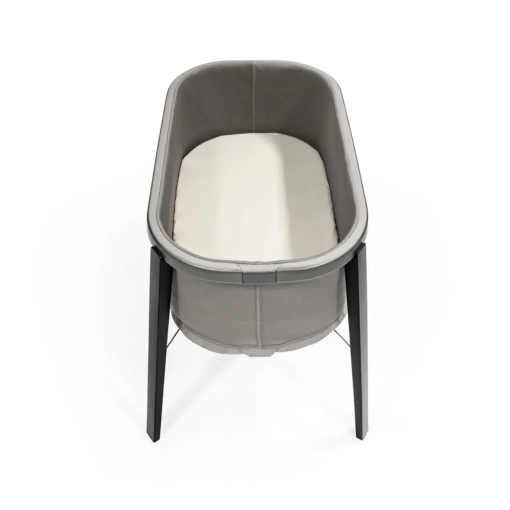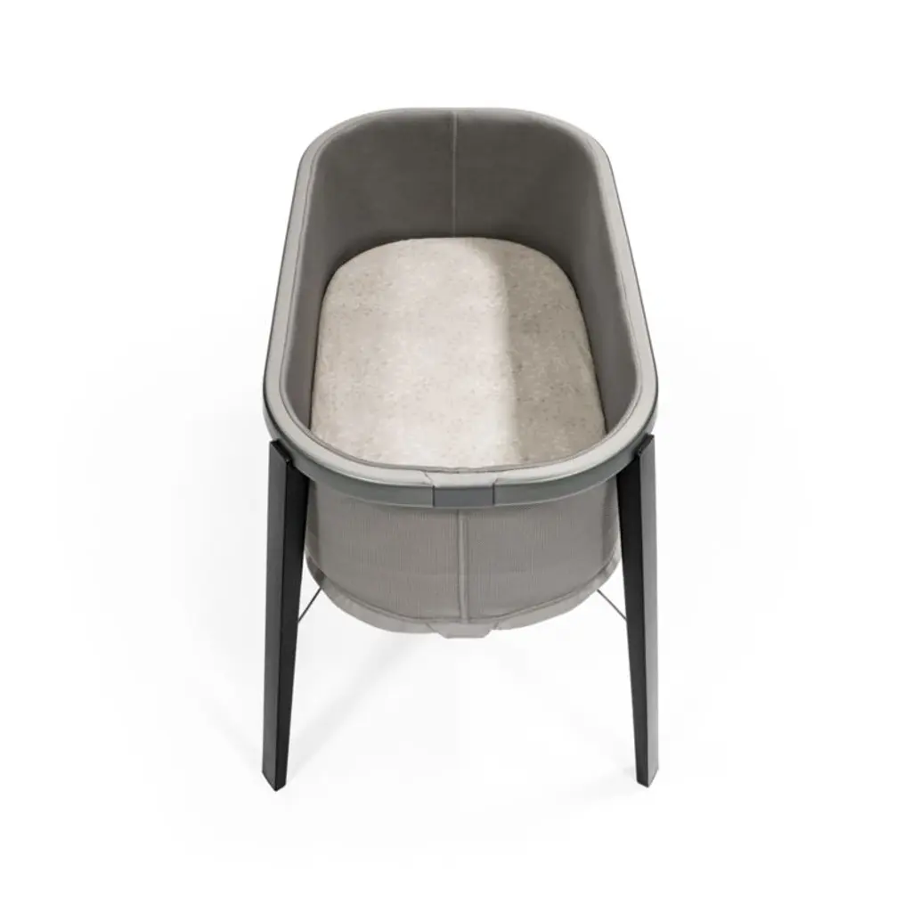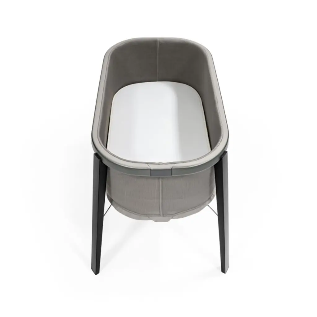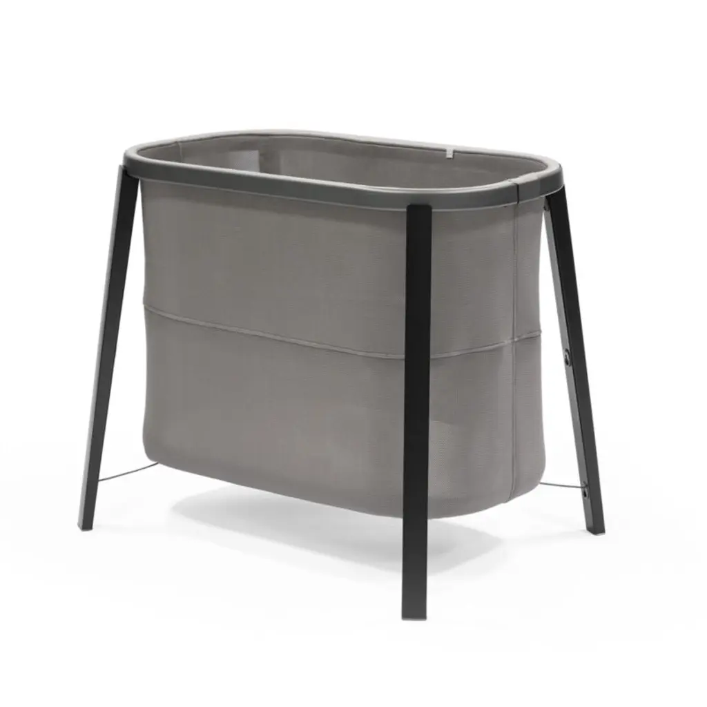 Airy and light with a design-forward oval shape, the graphite grey Stokke® Snoozi bassinet is a beautiful first sleeping space for babies, whether in the nursery or placed near a parent's bed. The firm, comfortable mattress and breathable 3D mesh fabrics make it the perfect place for your newborn to rest, sleep and nap in every room in your home. It adjusts as your little one growsuse the high newborn position for the first 6 months, then lower the mattress when your baby can pull themselves up for use up to 9 months. When it's time for an overnight trip, fold the bassinet flat and carry it in the included travel bagthen easily reassemble it to create a cozy sanctuary wherever your baby may be.
