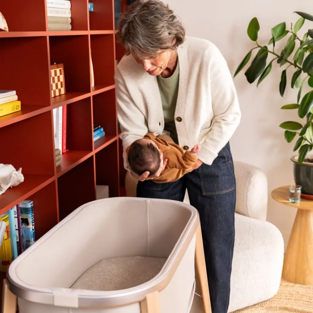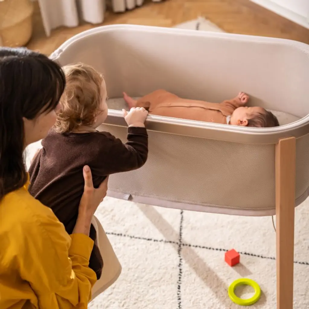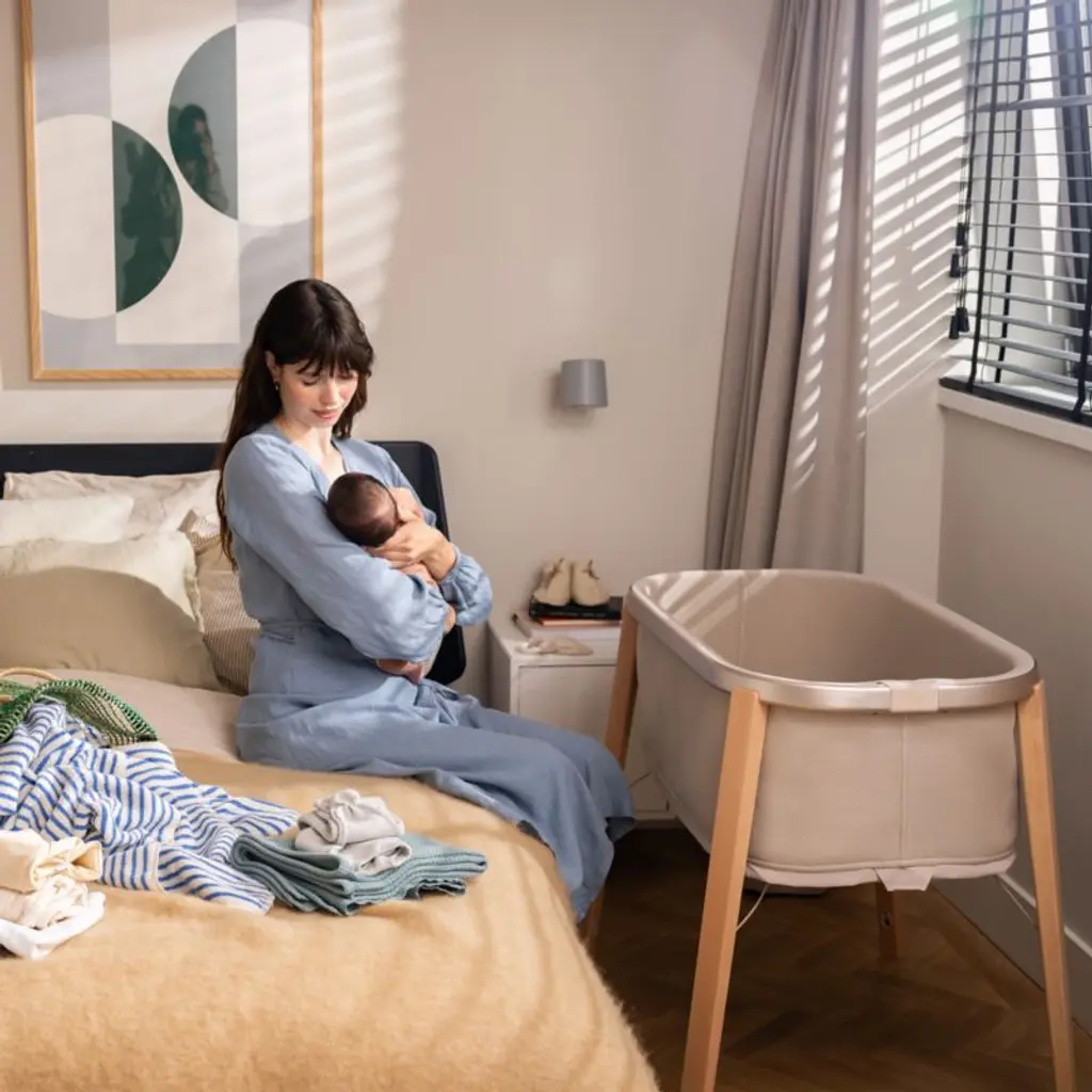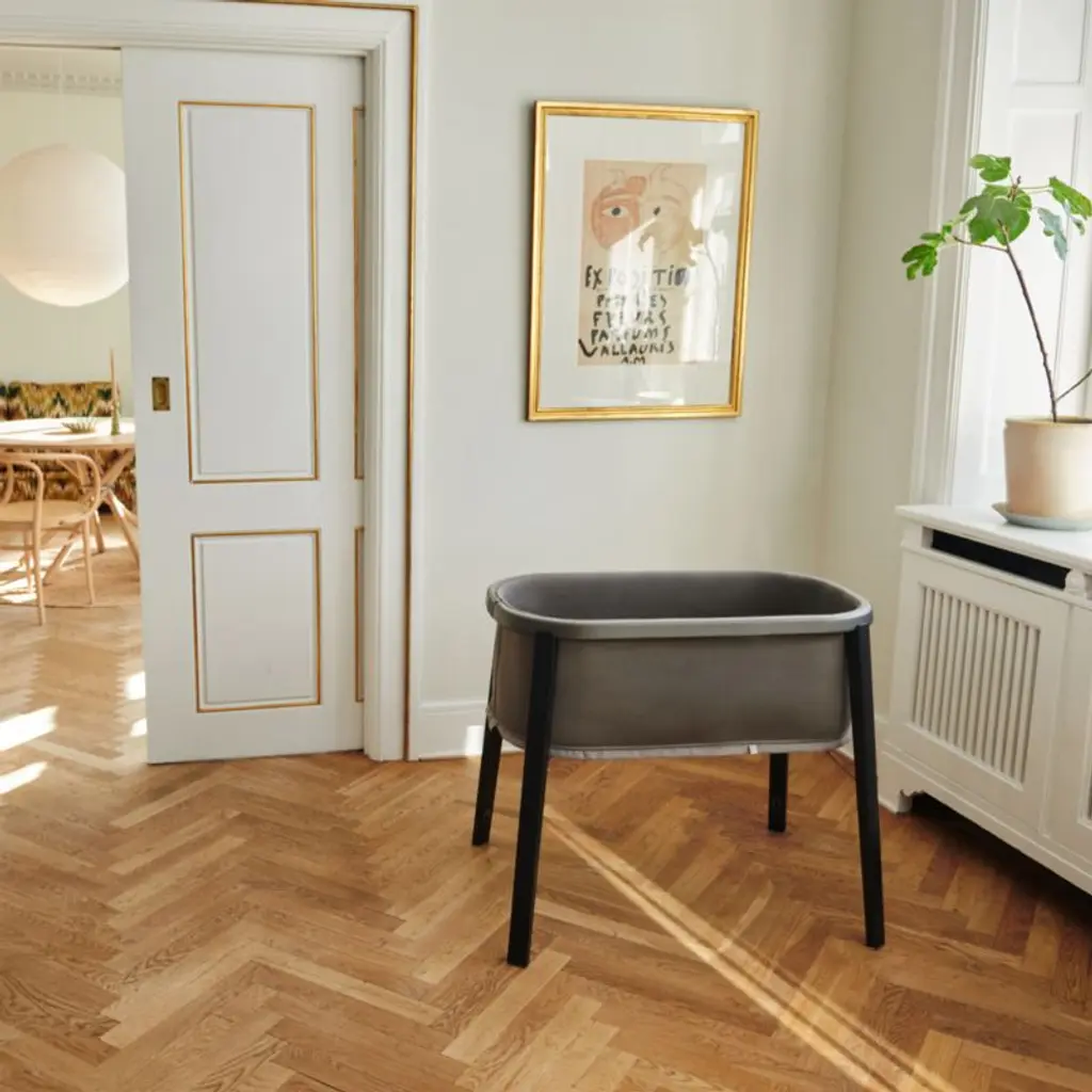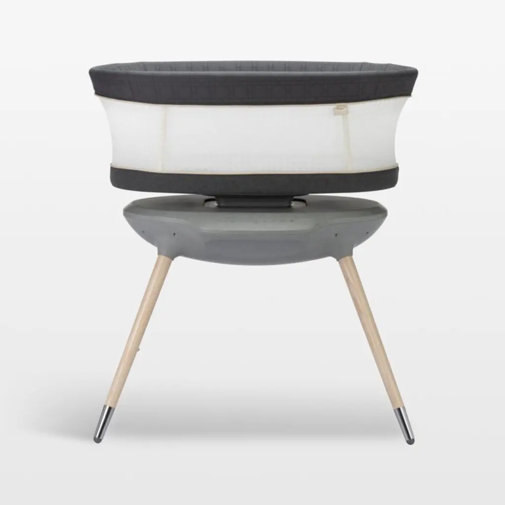 Airy and light with a design-forward oval shape, the graphite grey Stokke® Snoozi bassinet is a beautiful first sleeping space for babies, whether in the nursery or placed near a parent's bed. The firm, comfortable mattress and breathable 3D mesh fabrics make it the perfect place for your newborn to rest, sleep and nap in every room in your home. It adjusts as your little one growsuse the high newborn position for the first 6 months, then lower the mattress when your baby can pull themselves up for use up to 9 months. When it's time for an overnight trip, fold the bassinet flat and carry it in the included travel bagthen easily reassemble it to create a cozy sanctuary wherever your baby may be.