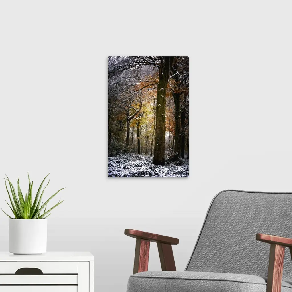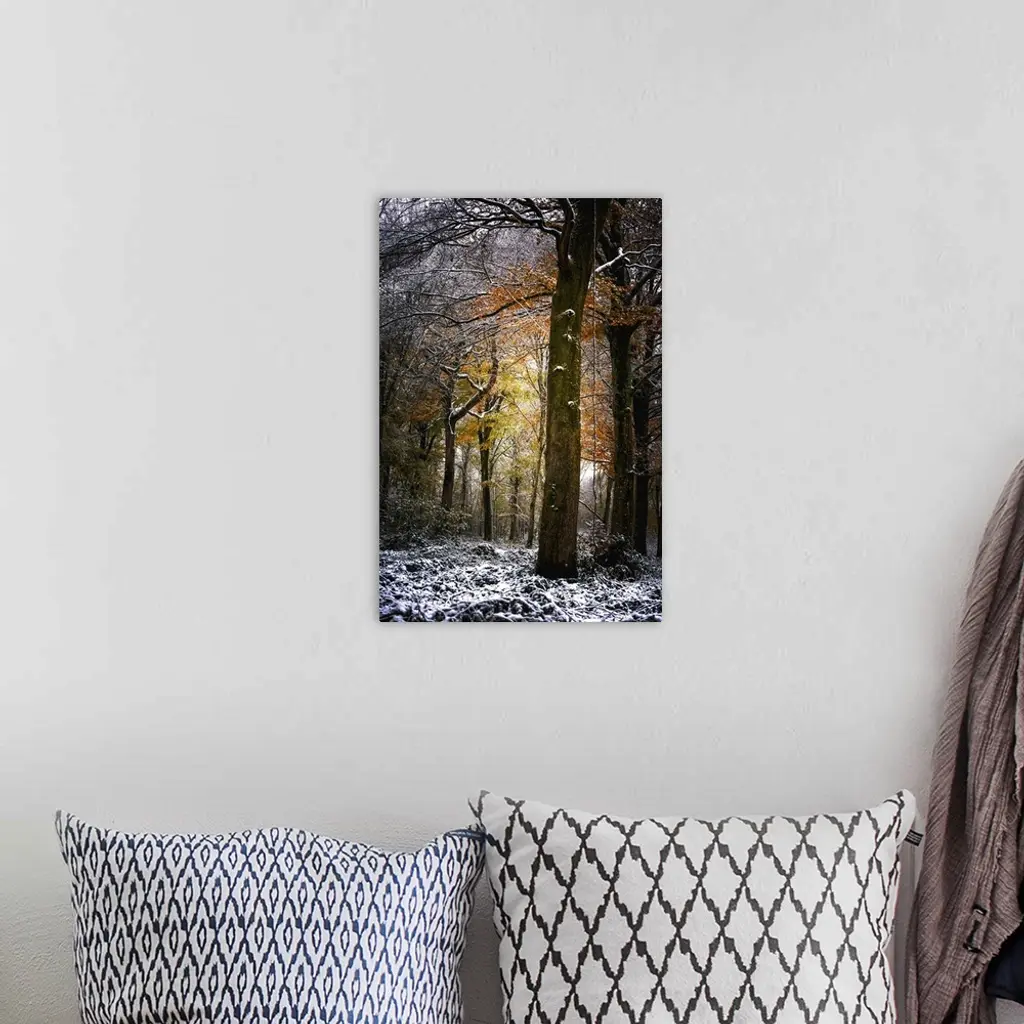 A serene forest scene showcases tall trees with a mix of autumn leaves and freshly fallen snow covering the ground. Sunlight filters through the canopy, highlighting the contrast between the warm leaf colors and the cold snow.