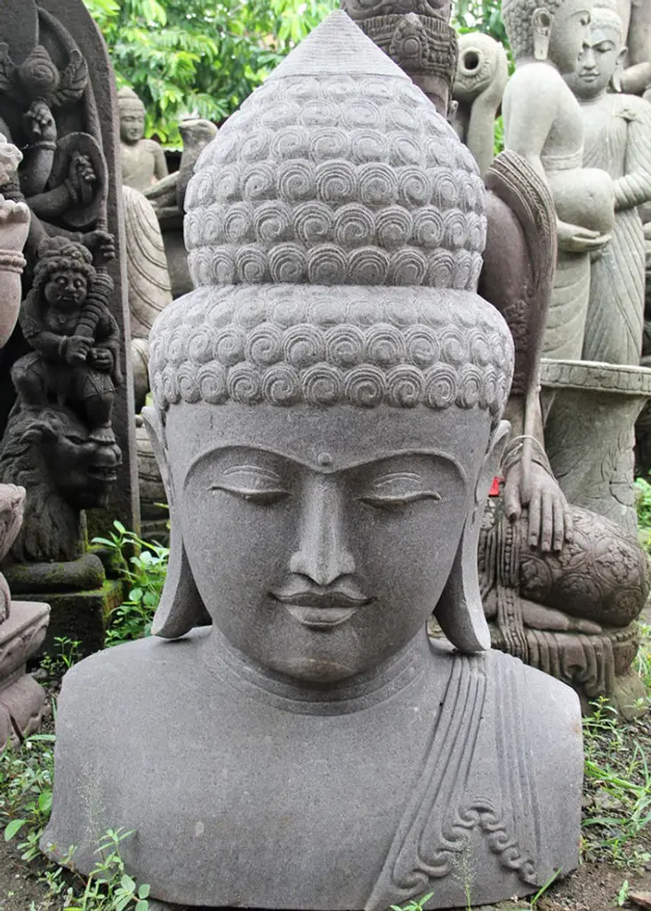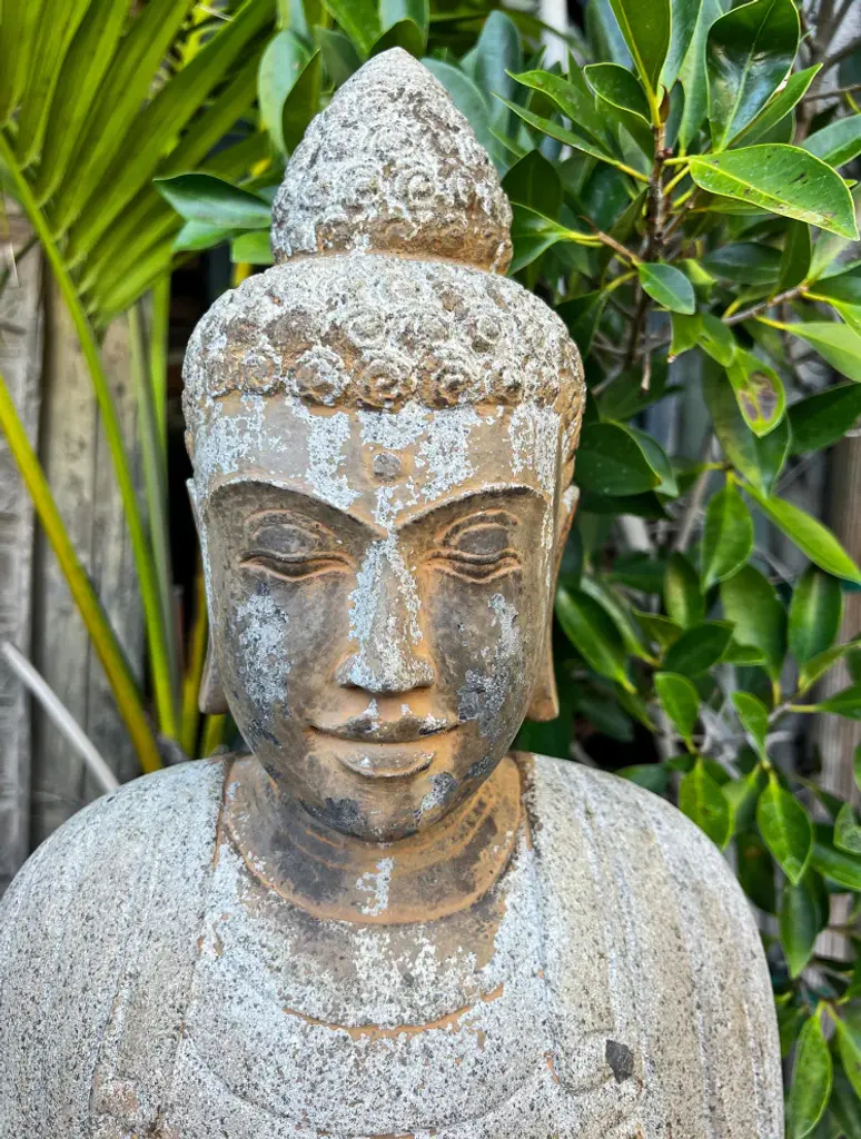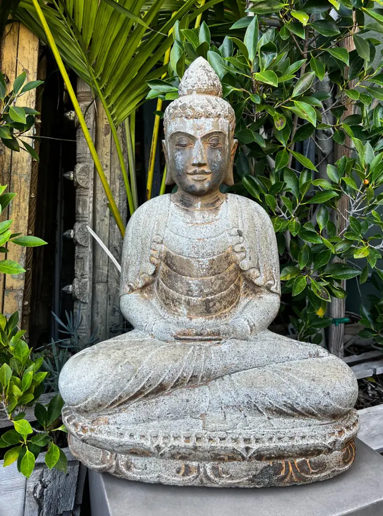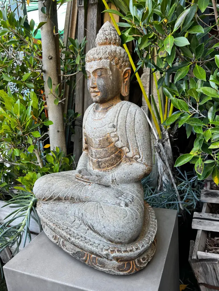 Hand carved stone sitting garden Buddha statue. Beautiful intricate details. Buddha sitting in cross legged position with palms facing upwards in meditation and peaceful facial expression. Great for outdoors in the garden or interior space. Natural stone finish and weathering.