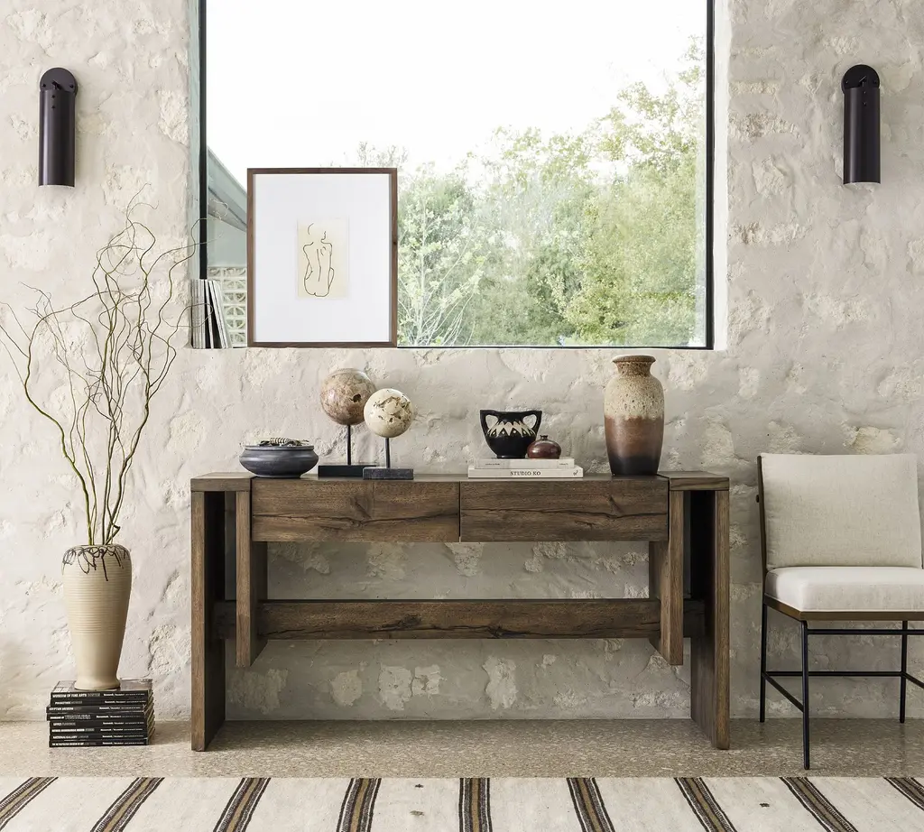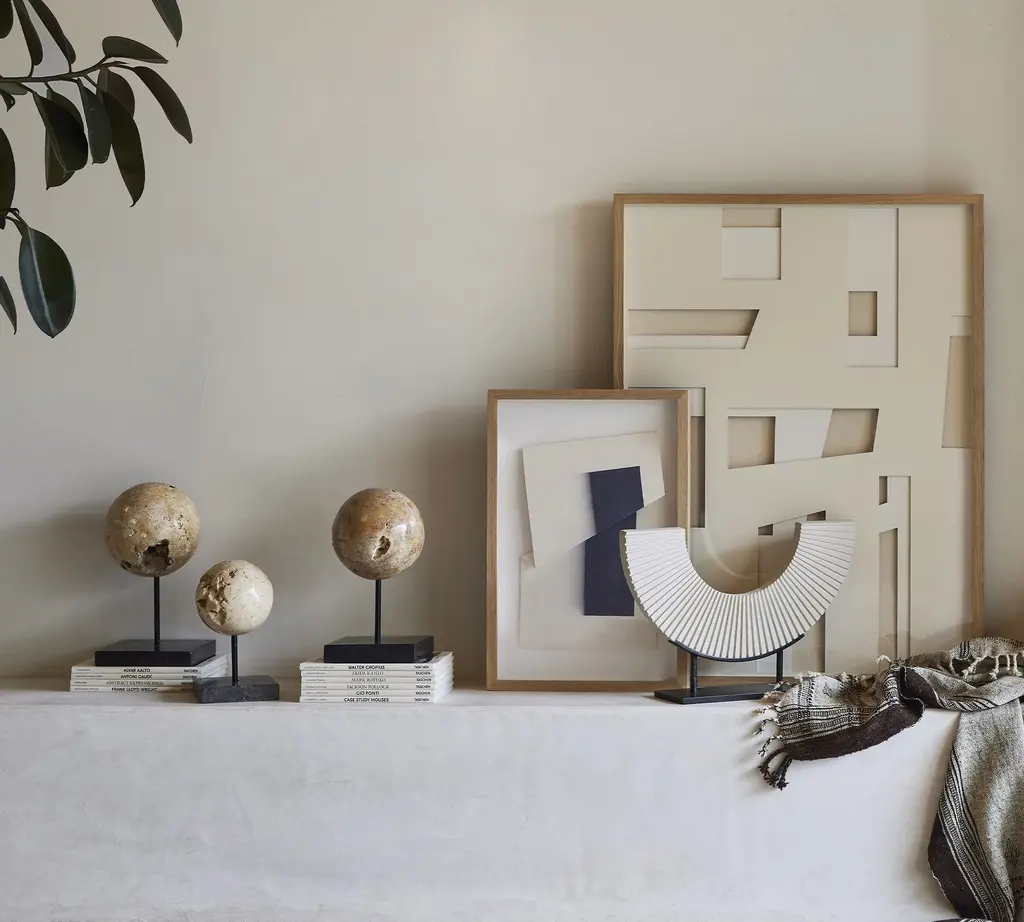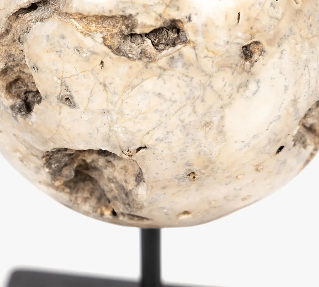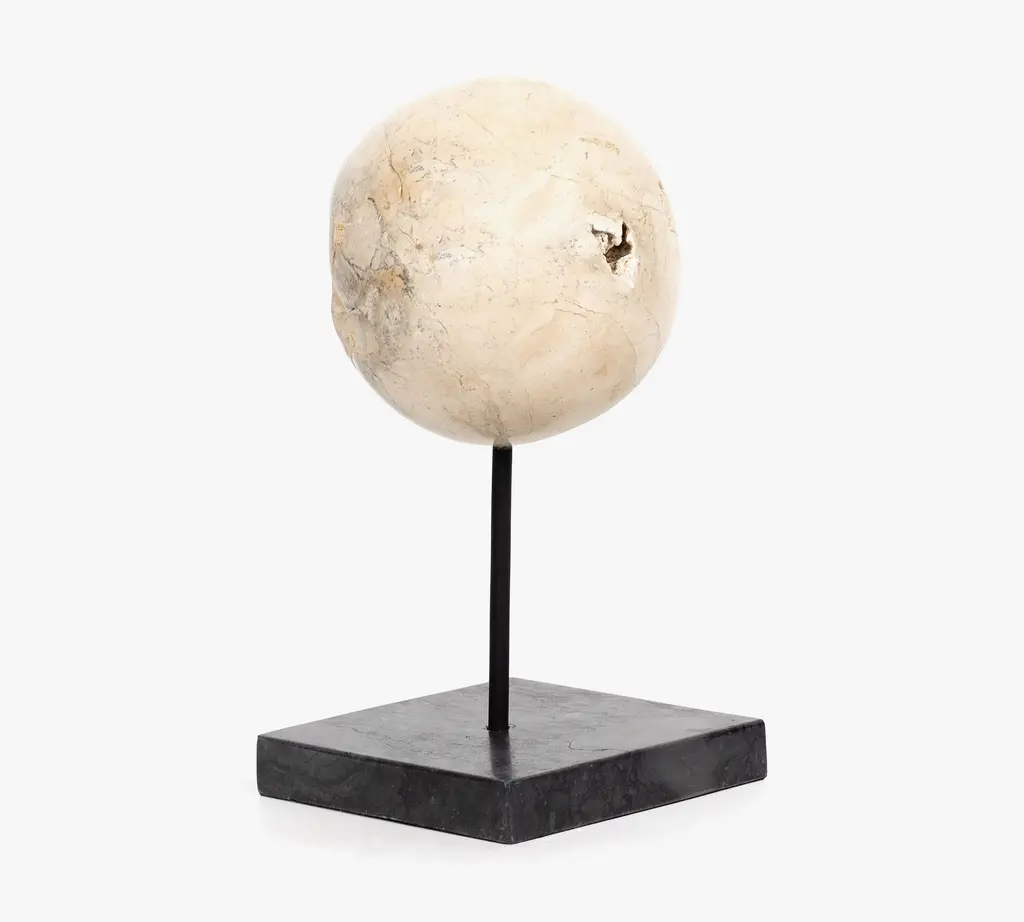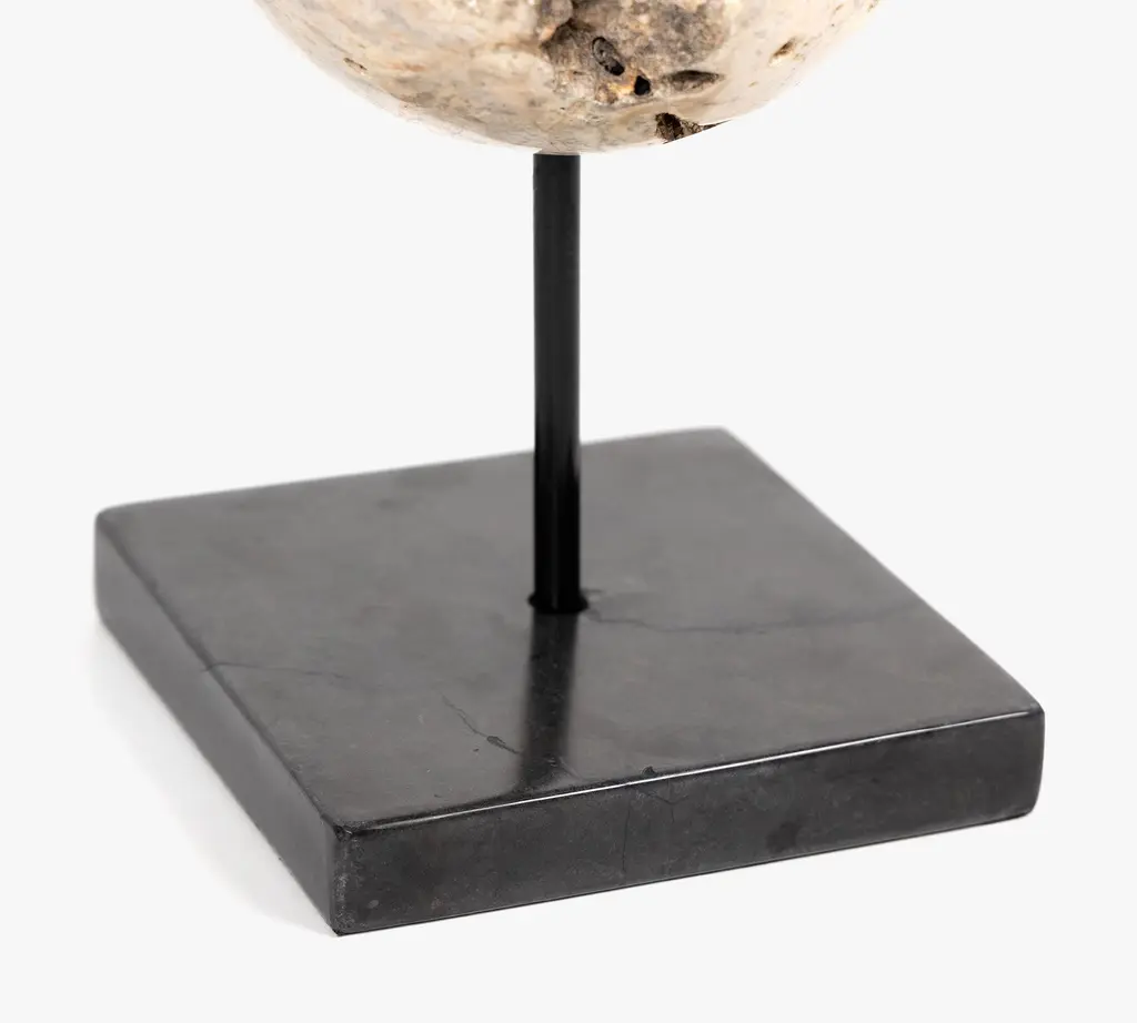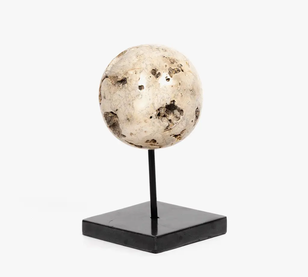 Solid travertine and black-finished iron fuse in this striking set of sculptures. The ancient stone is formed into spheres atop an iron base, its craggy surface offering dimension and enhancing the material’s aged aesthetic. With its varied heights, the pieces can be styled alone or together for added impact.