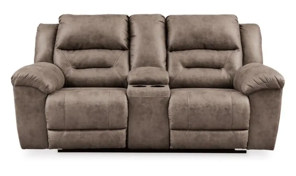 The Stoneland Power Reclining Leather Loveseat with Console is a stylish and comfortable addition to any living area. Designed for individuals who value the sophisticated charm of leather combined with the comfortable feel of fabric, this loveseat skillfully combines robustness and simplicity of upkeep. Its long-lasting, high-performance padded faux leather makes it perfect for busy family settings. The one-touch power control puts relaxation at your fingertips by making it simple to change to the ideal position. Enjoy the utmost in seated comfort with plush lumbar support from channel-stitched back cushions. This loveseat's dual-sided recliner, corner-blocked frame, and metal-reinforced seats for stability and durability are all practical design elements. Long-lasting comfort is ensured by the linked cushions and high-resiliency foam encased in thick poly fiber. Improving performance, the central console