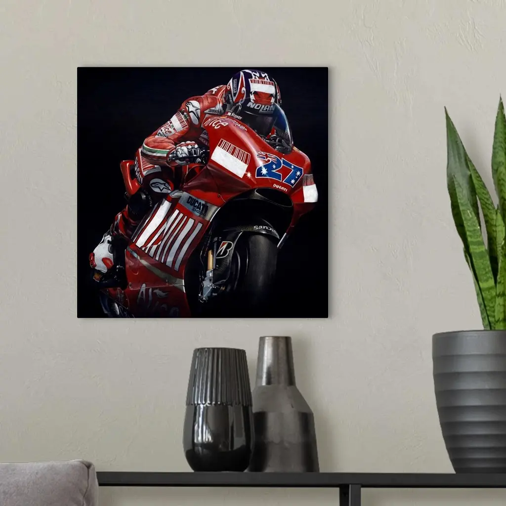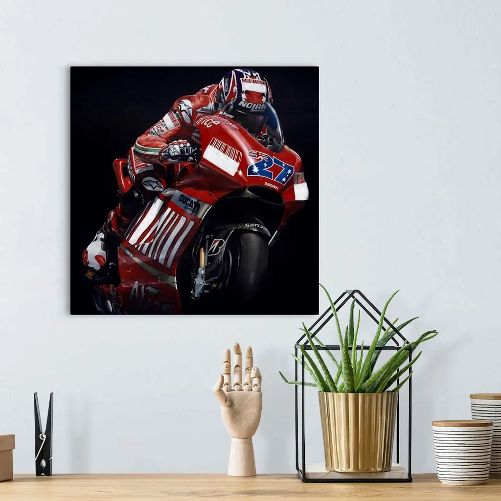Square illustration of a red, white, and blue Ducati racing bike in action, on a black background.