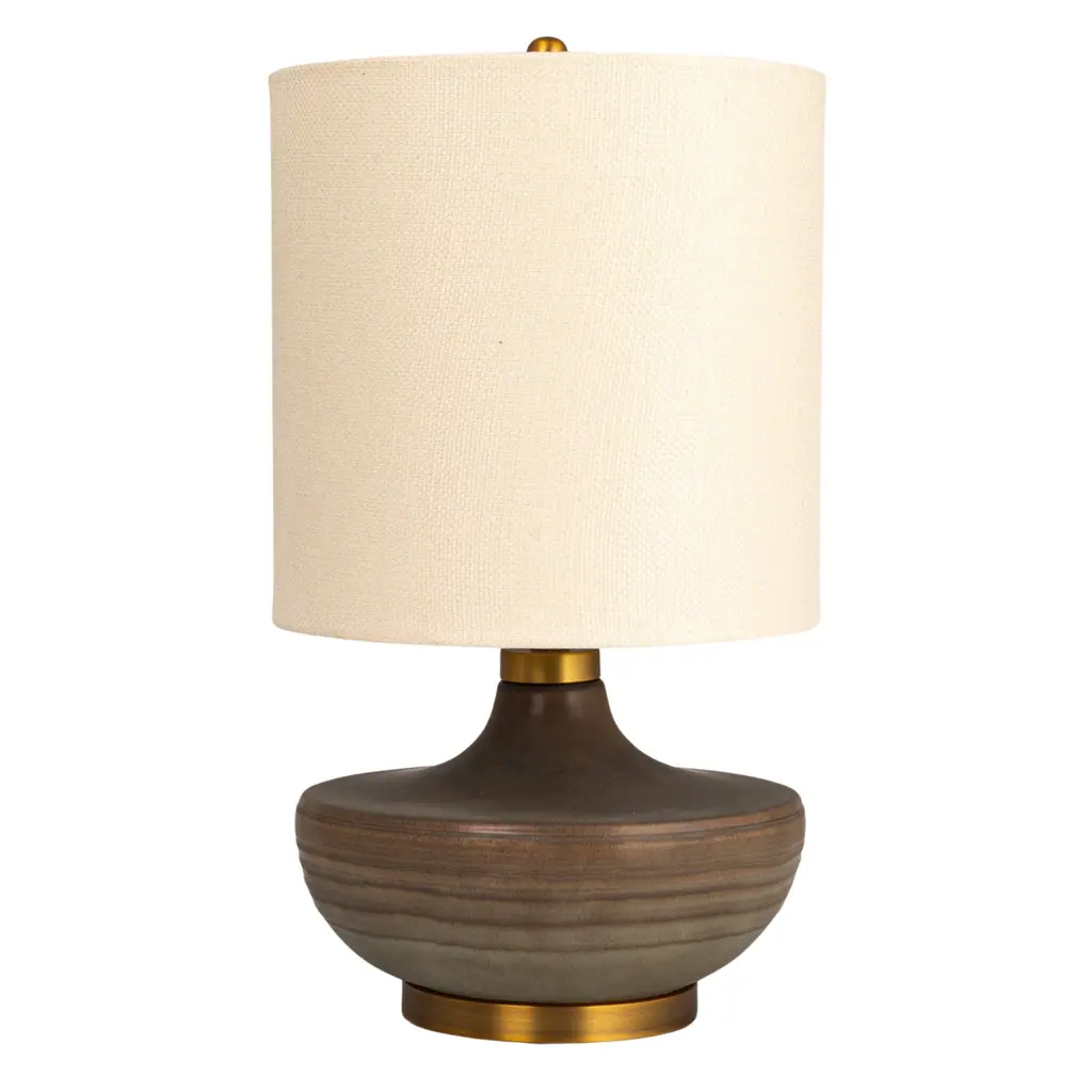 This Round Stoneware Table Lamp is a symphony of design elements, blending the rustic appeal of stoneware with the softness of a classic drum shade. The stone glaze finish in brown hues adds a touch of earthy sophistication, making it a versatile piece for various decor styles. Its generous dimensions ensure it stands out as a focal point, while the round shape softens spaces typically filled with hard lines. Made for both style and utility, this table features a well-proportioned silhouette. Its spacious 20-inch diameter top sits atop a sturdy base, reaching a height of 30.5 inches. Crafted to be more than just a light source, this lamp is a testament to timeless style and enduring craftsmanship.Features: