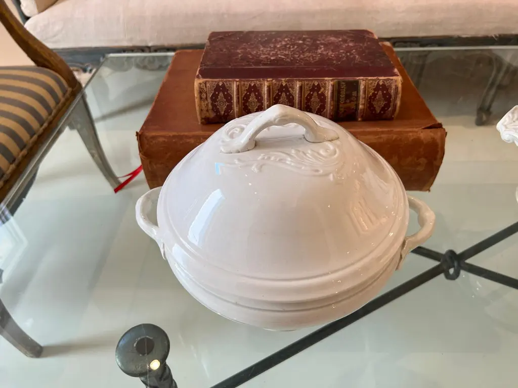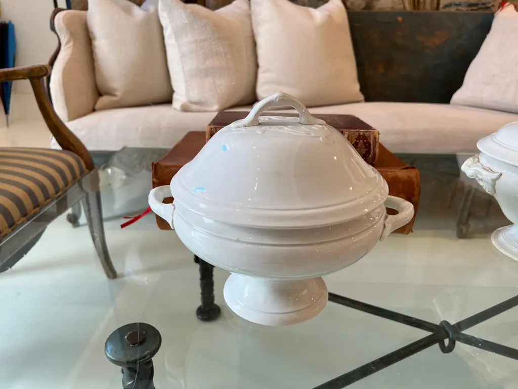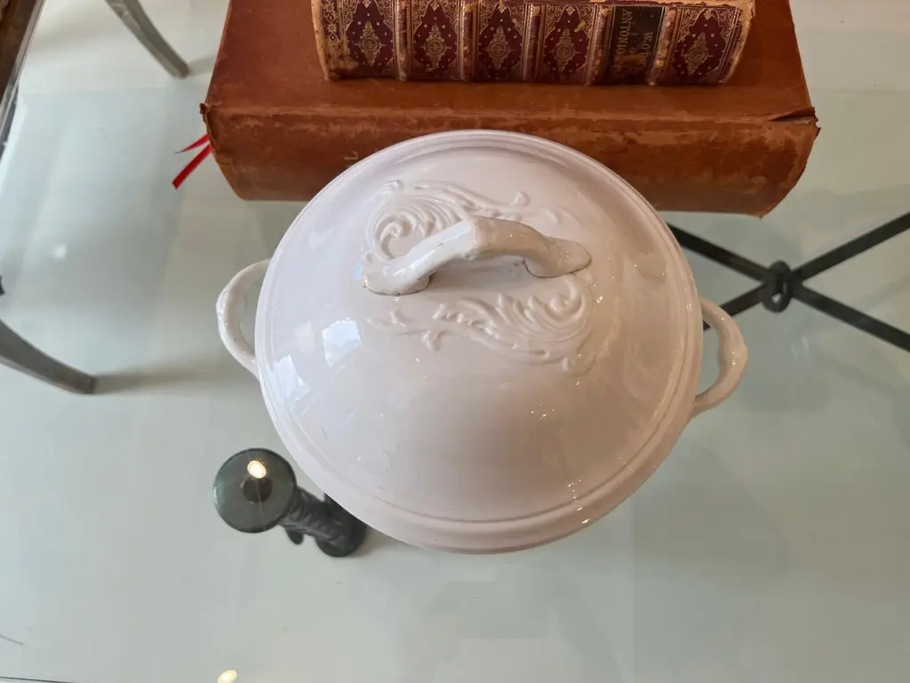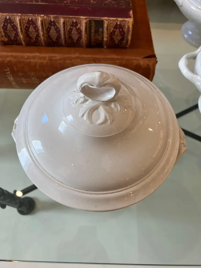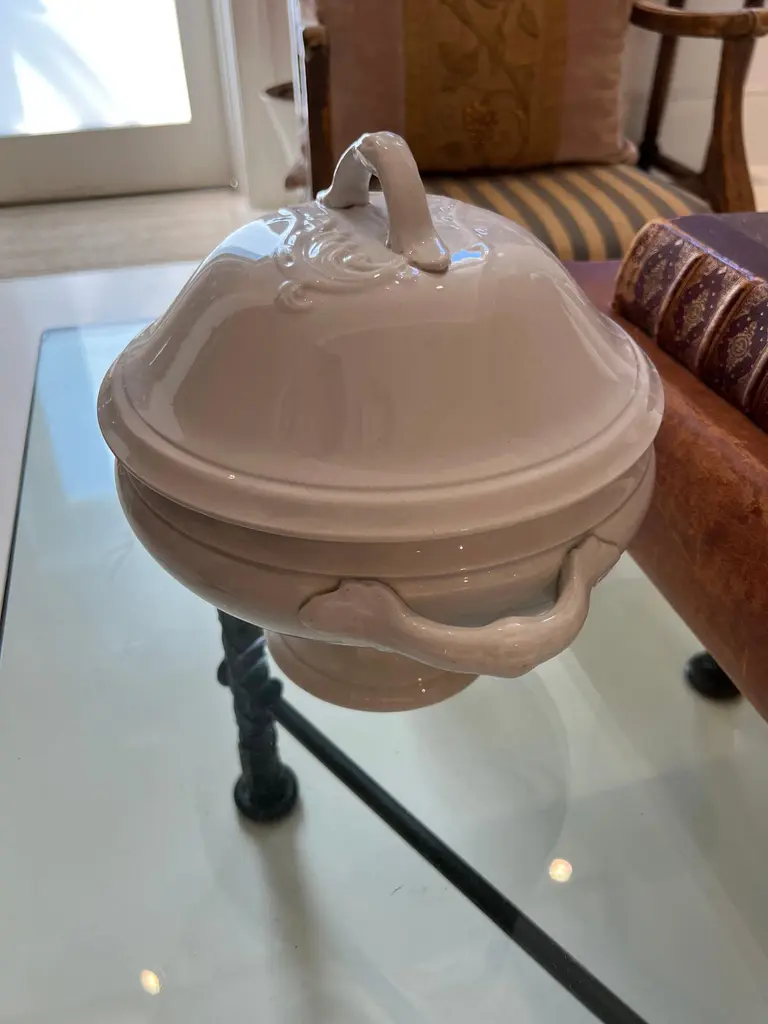 Pretty and practical, creamy white stoneware footed terrine with lid.