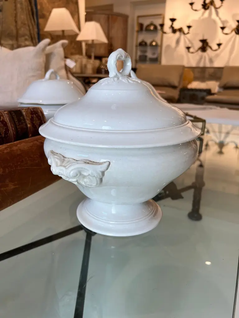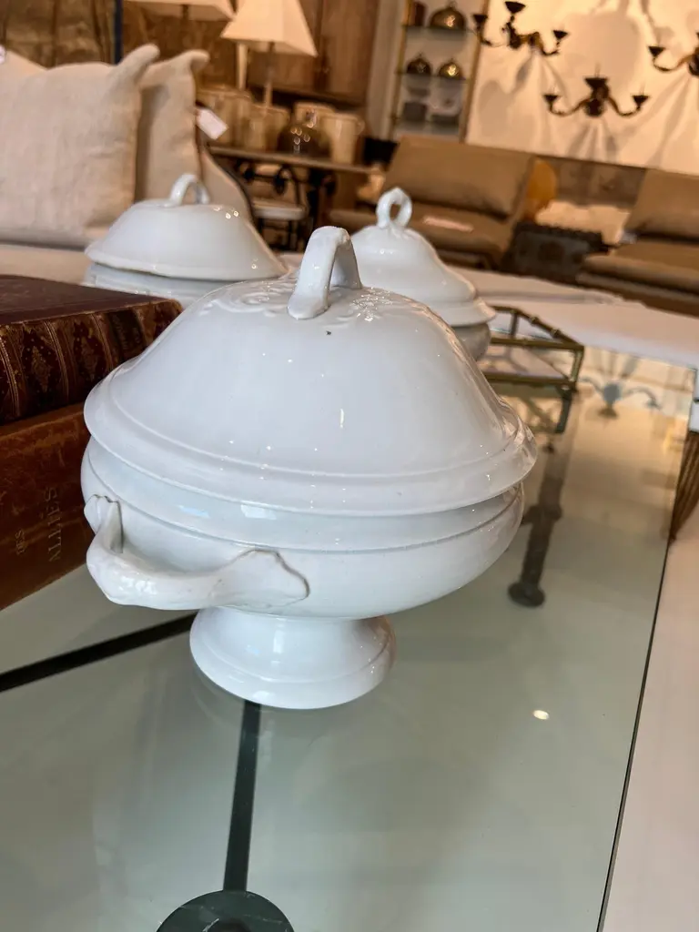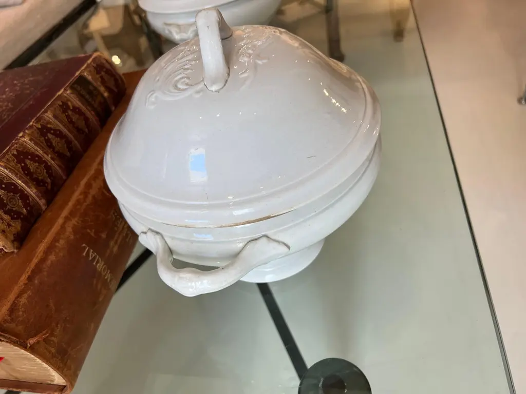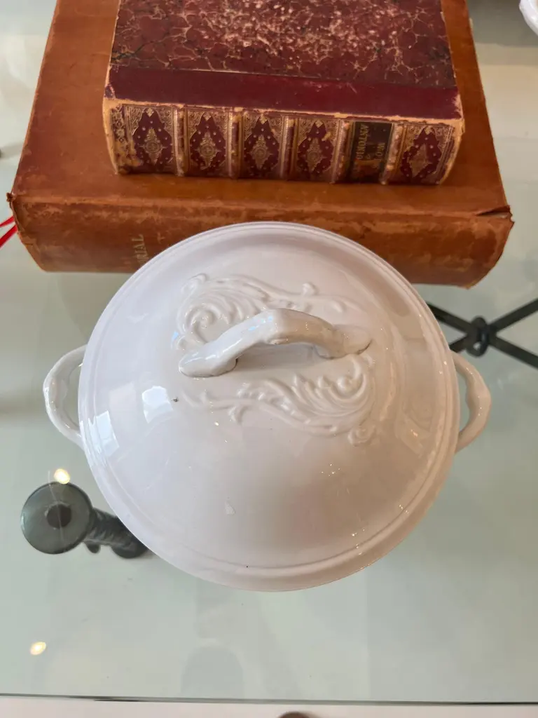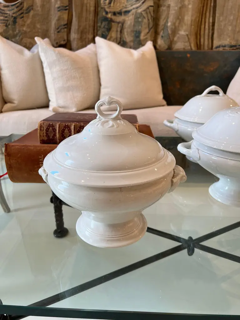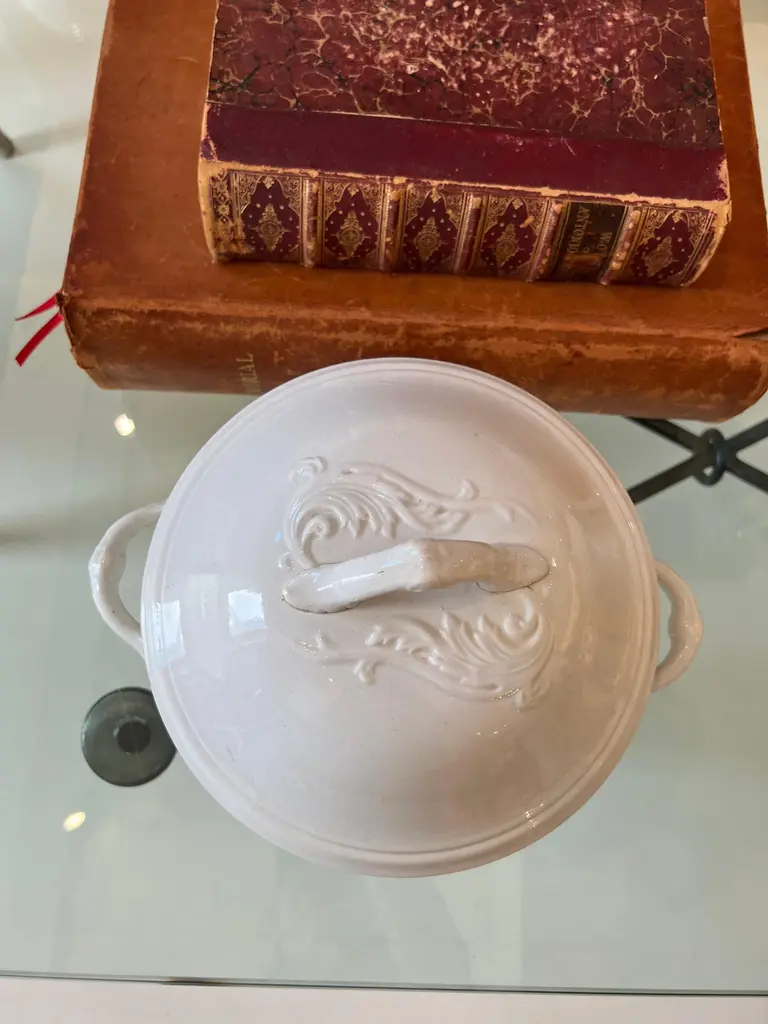 Pretty and practical, creamy white stoneware footed terrine with lid.