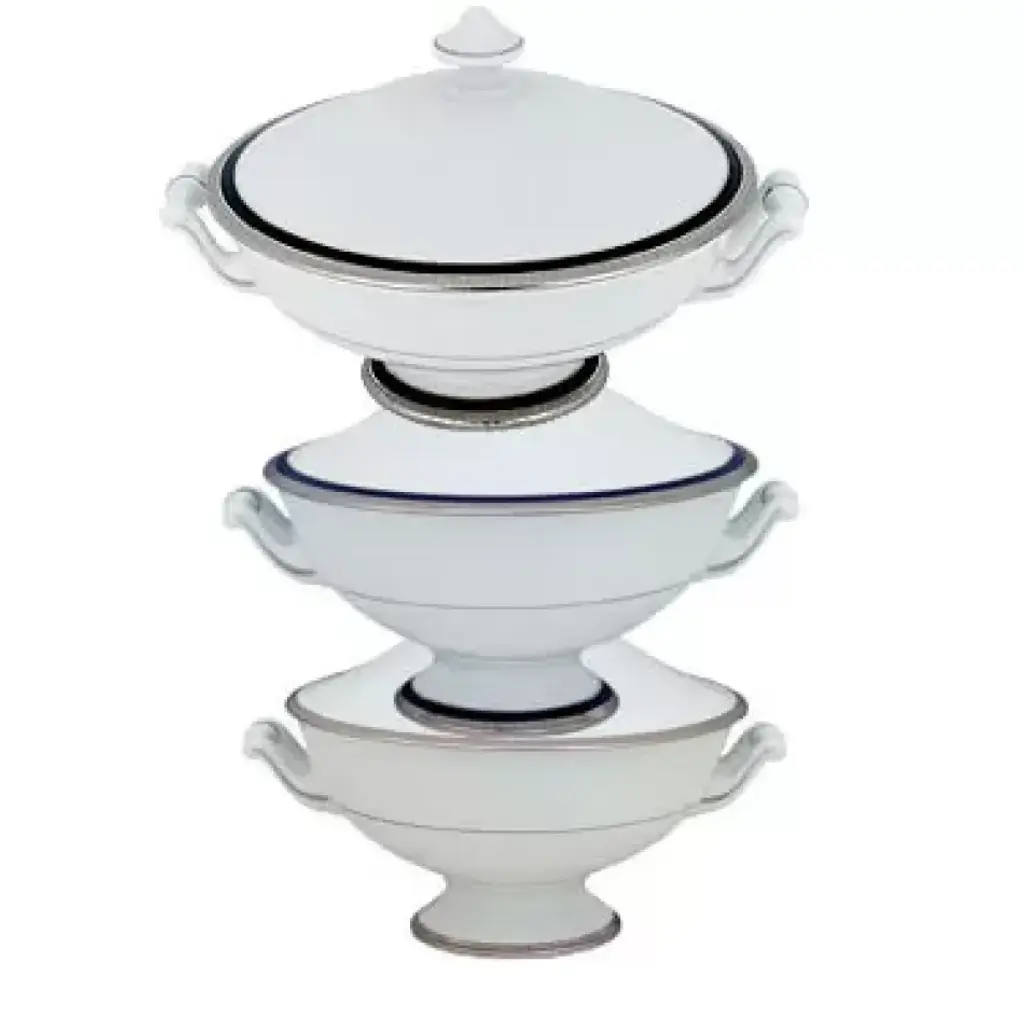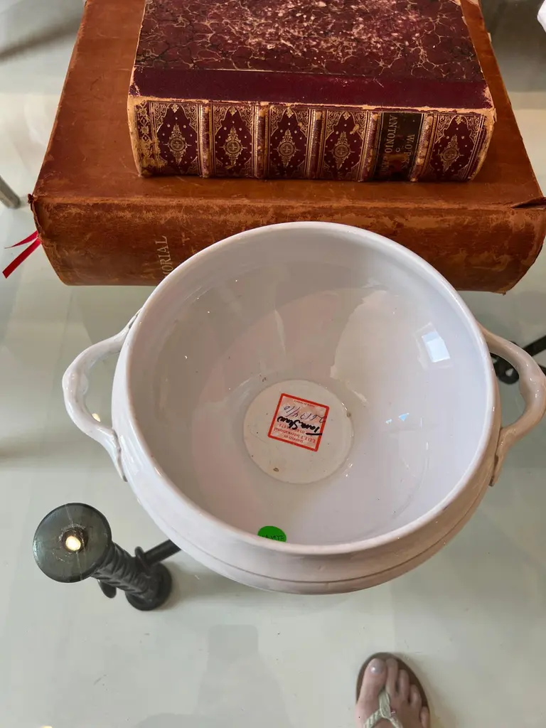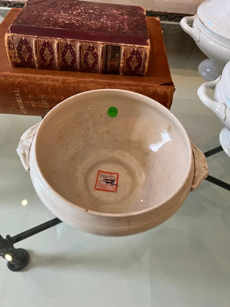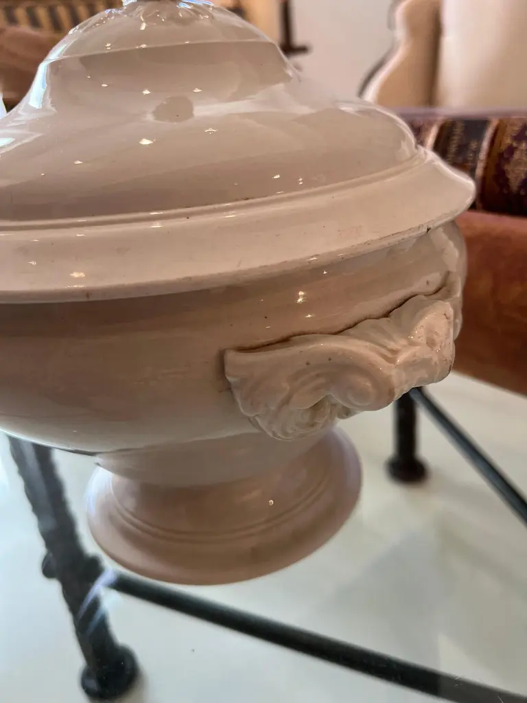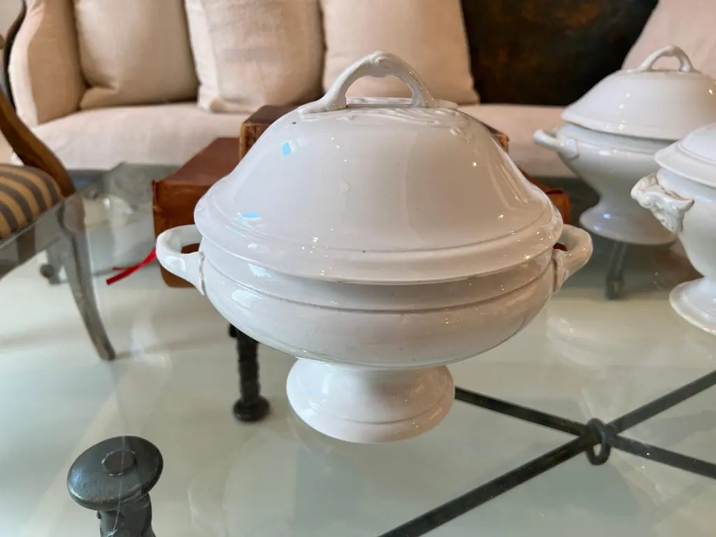 Pretty and practical, creamy white stoneware footed terrine with lid.