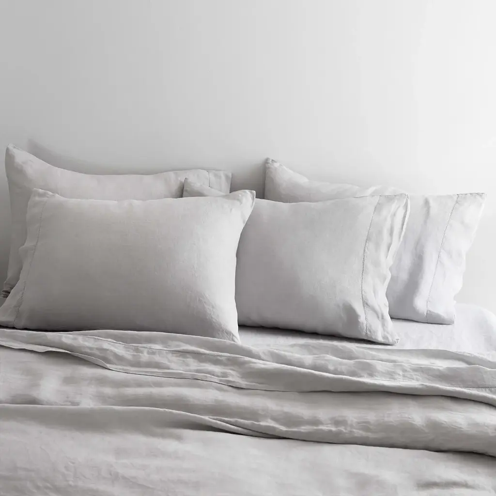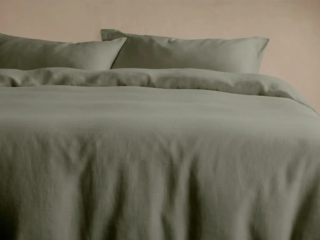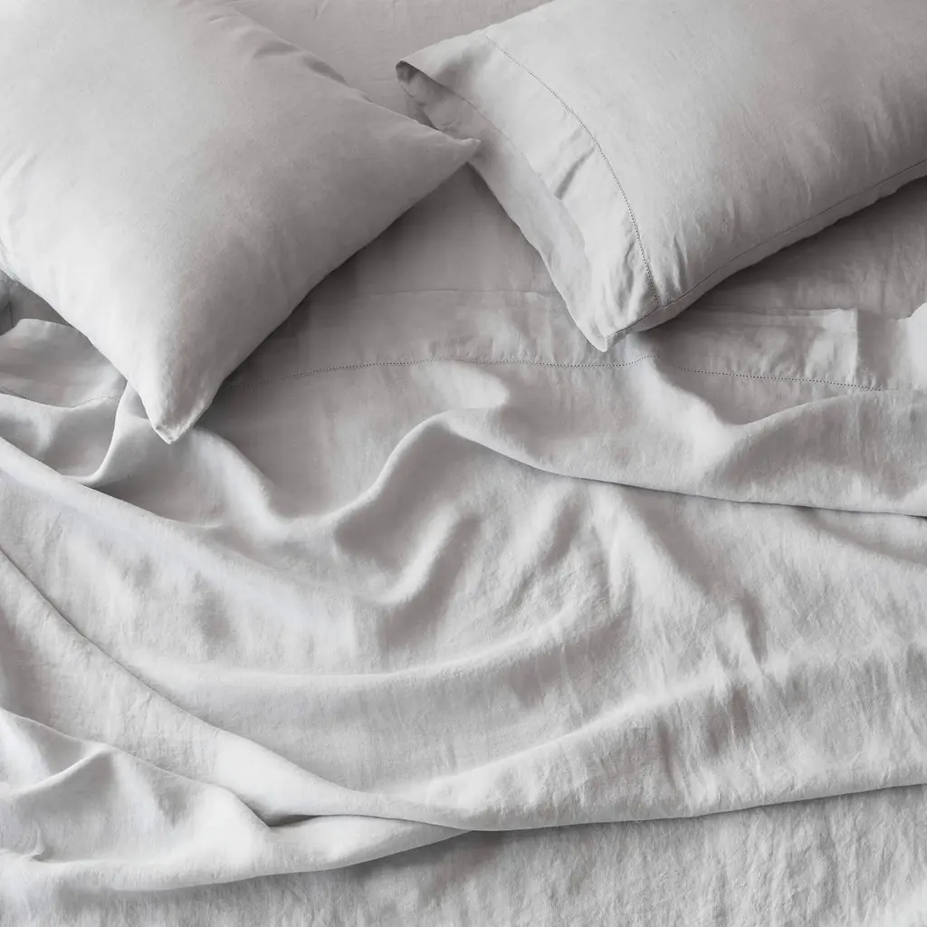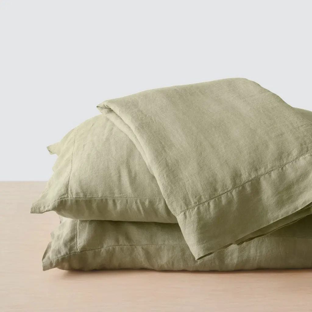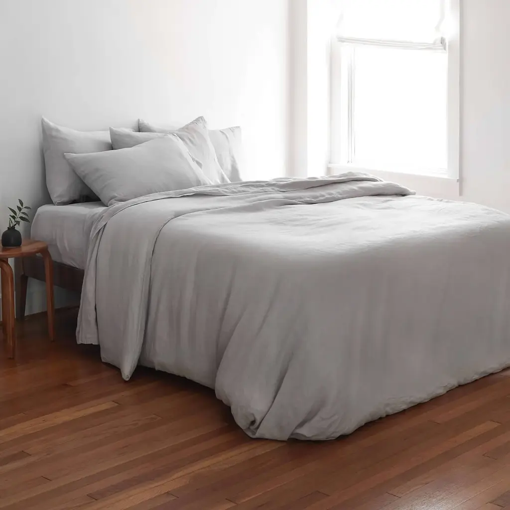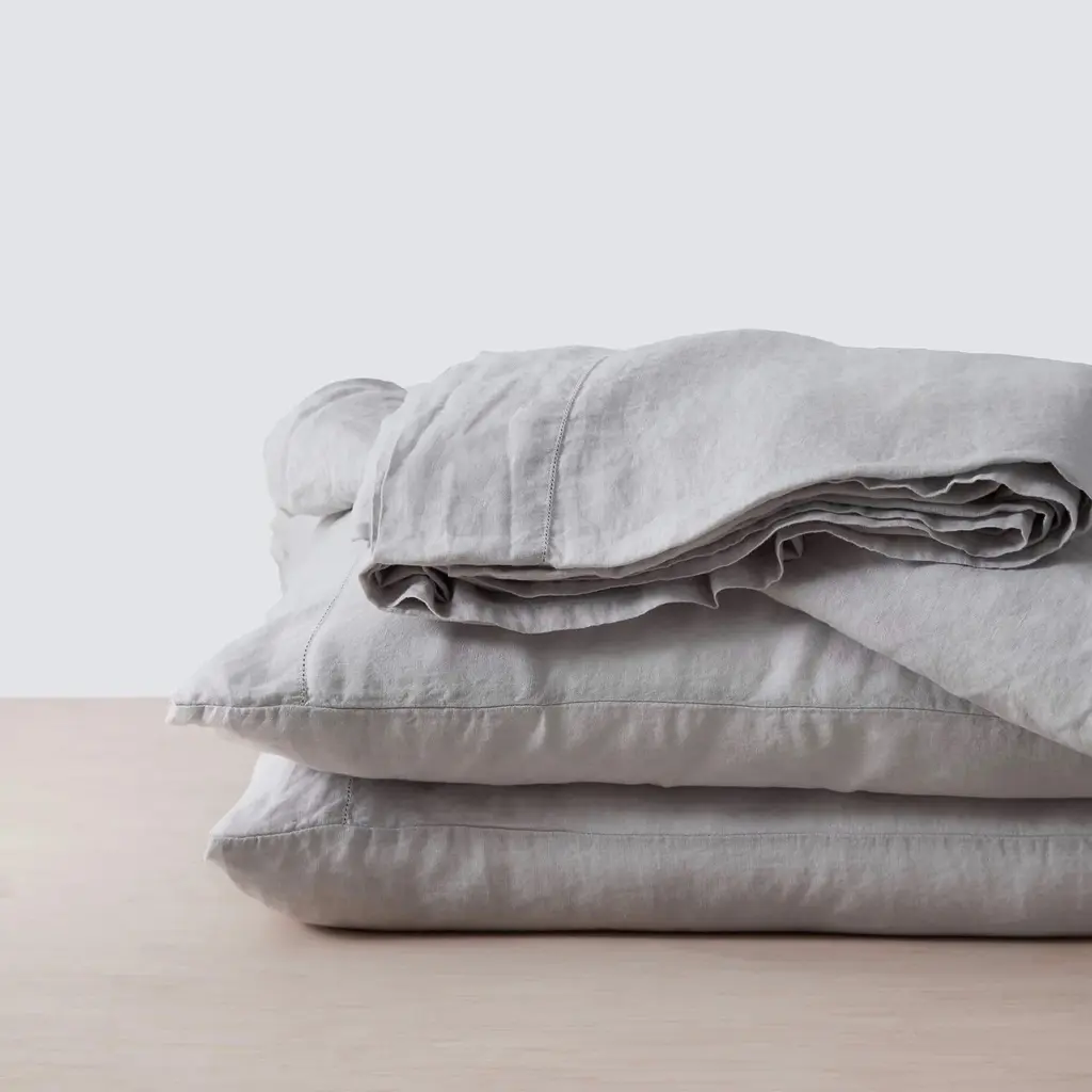 Create a laid-back oasis with our complete bed set. Organic textures. Laid-back appeal. Effortlessly luxurious. Our linen bedding is, in a word, heavenly. And it’s the softest we’ve ever felt– each piece is garment washed to ensure it’s the softest you’ll ever touch. And the best part? It only gets softer with time (that is, every single time you wash it). Set includes: - 1 sheet set (1 flat sheet, 1 fitted sheet, 2 pillowcases) - 1 duvet cover- 2 extra pillowcases Made using only the finest French flax and woven in the oldest, family-run linen mill in Portugal, each piece is Oeko-Tex® certified and made sustainably in a fair trade environment. Want to see our bedding for yourself? Go on and test out our linen fabric swatches.