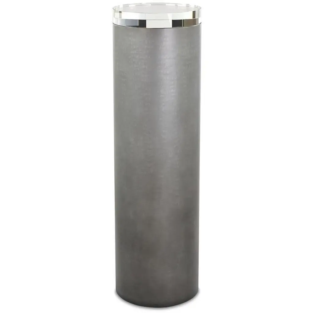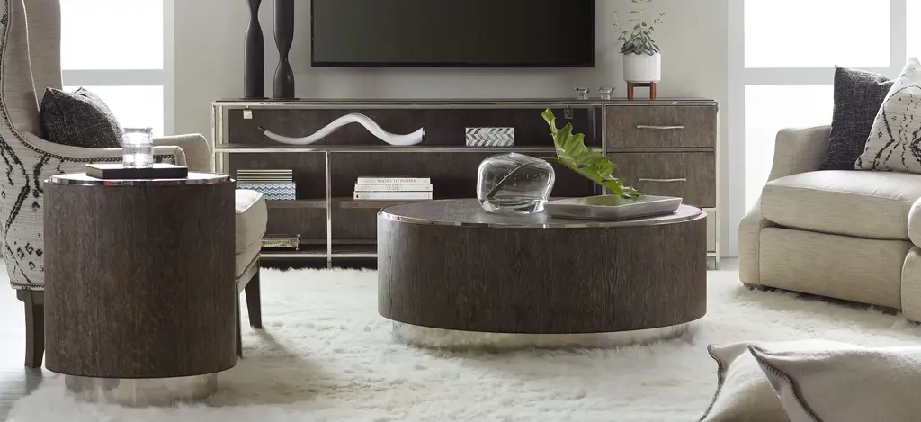 The Storia Round End Table is a warm modern group that fits perfectly into today's casual transitional interiors. Storia is crafted of sand-blasted Oak in a greige color with the wood grain revealed. The Oak is mixed eclectically with sophisticated materials like plated nickel and nail heads.