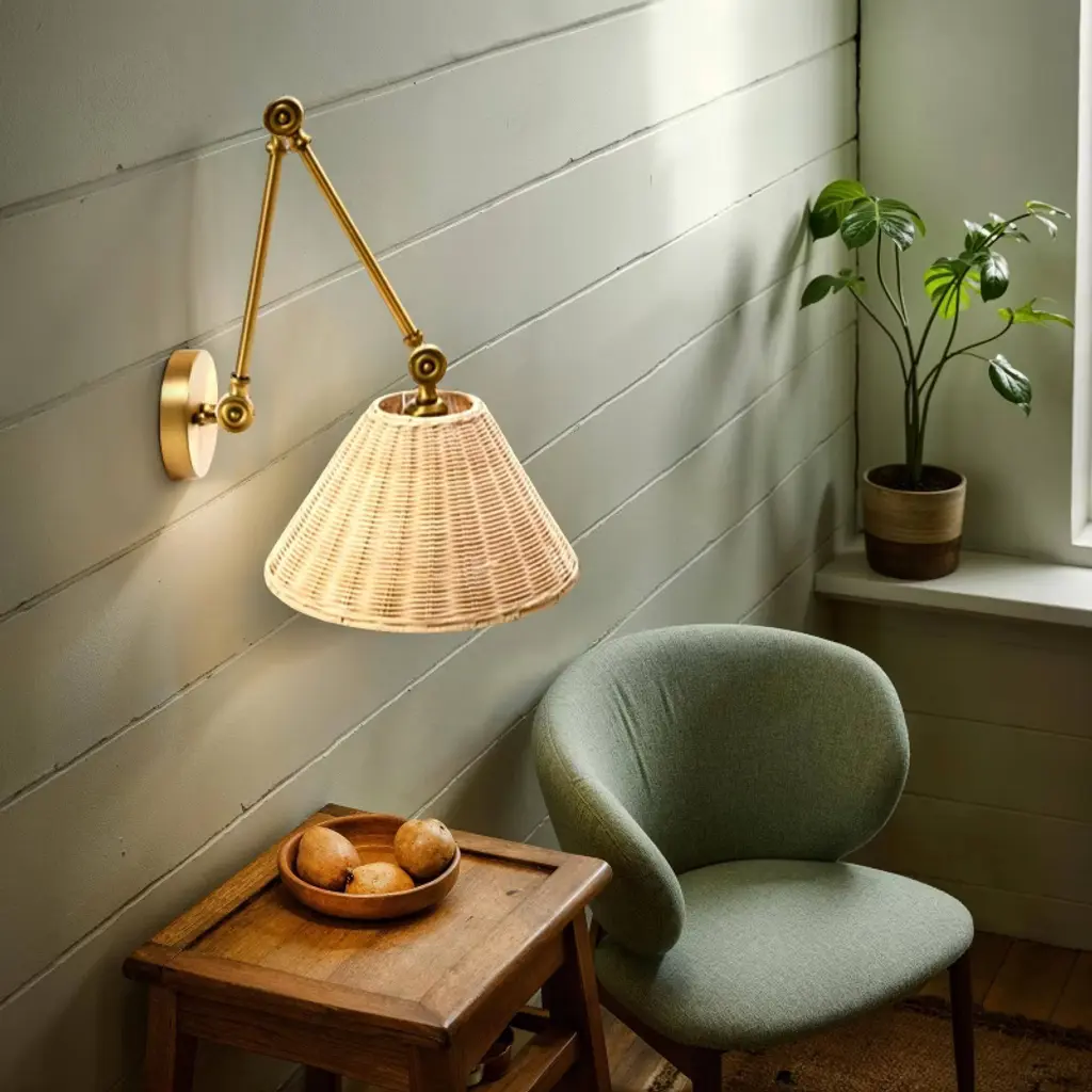 Storied Home Adjustable Wall Sconce With Shade Neutral Beige Rattan/antique Metal Brass Finish: Wall Mounted, Etl Listed