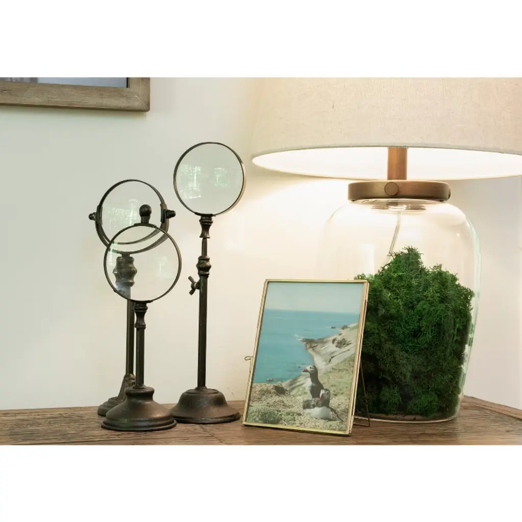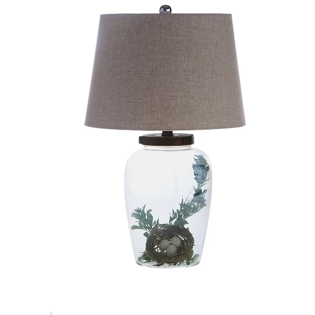 Add some style and charm to the space with this fillable glass table lamp. This table lamp showcases a clear glass base that can be filled with decorative items, such as seasonal flora, shells, stones, or ornaments. The glass base adds a touch of transparency and contrast to the table lamp. The lamp is topped with a linen shade that creates a cozy and inviting atmosphere. This table lamp is suitable for enhancing any style of home décor, from rustic to modern. Use it in the living room, bedroom, office, or any other area that needs some extra creativity and brightness. This table lamp requires one 100-watt bulb (not included) and is equipped with a rotary switch for easy operation. It measures 15 inches round x 23.25 inches in height, and the cord length is 7 feet. Add this fillable glass table lamp to the home and enjoy its beauty and functionality.