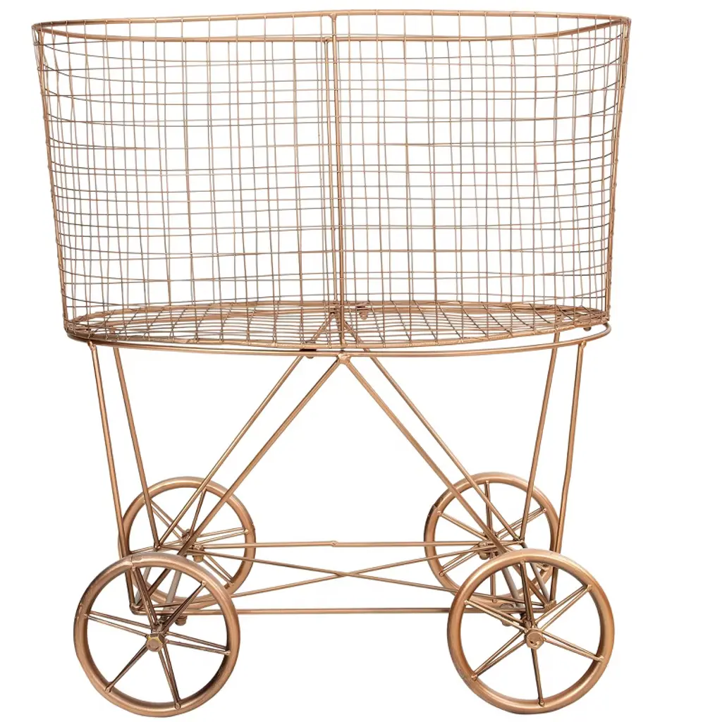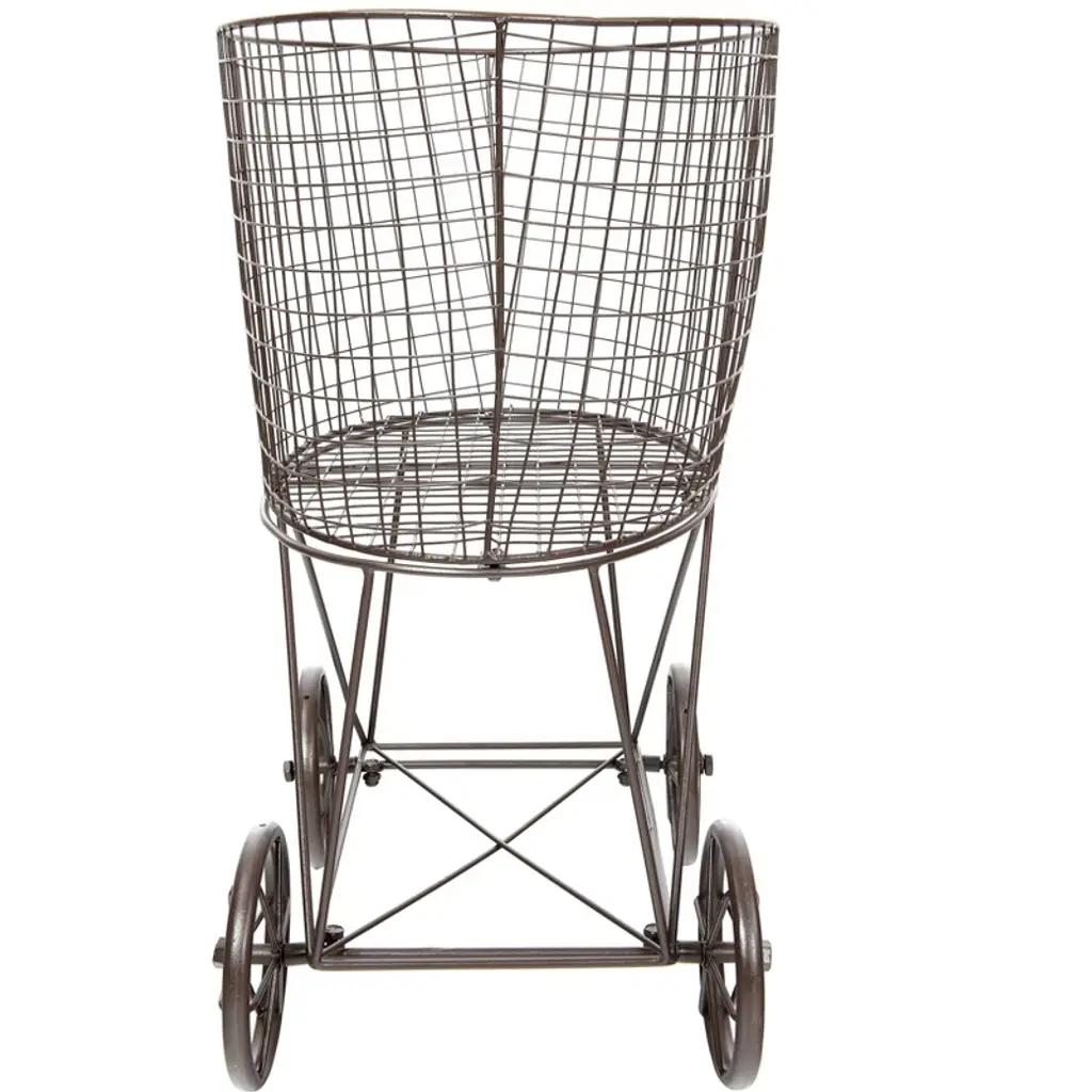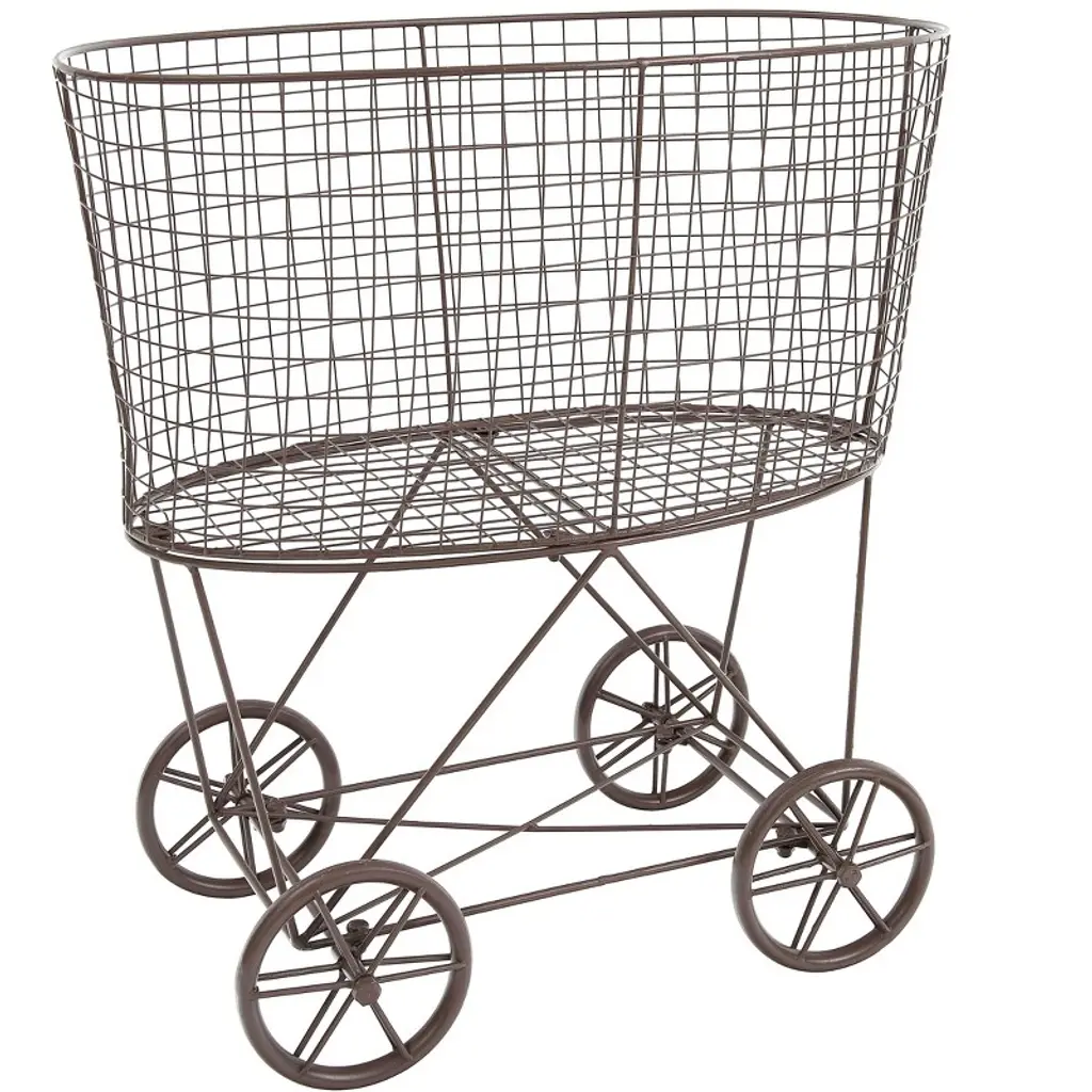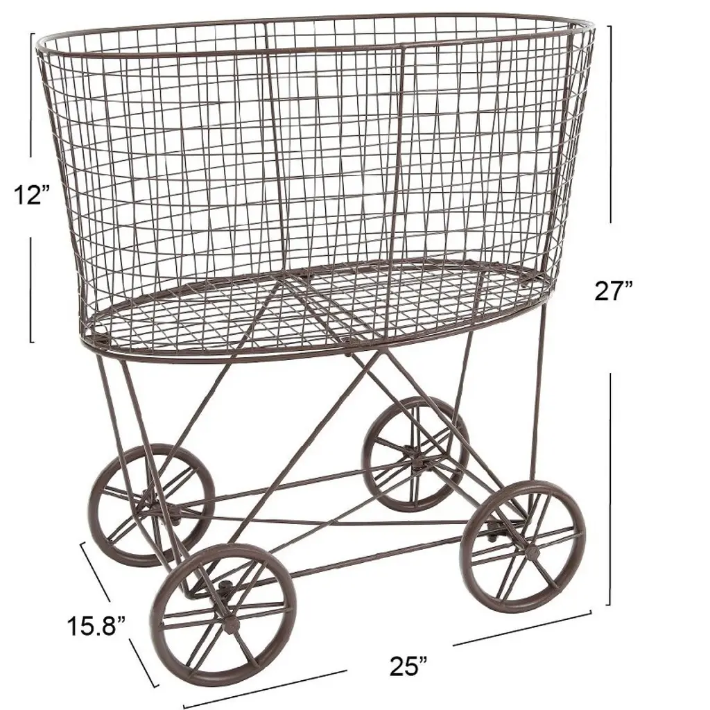 Add functionality and style to the laundry room with this bronze metal rolling laundry cart with a rack. This cart is made of durable metal with a powder-coated finish that resists rust and scratches. It has four smooth-rolling wheels that allow for easy movement around the home. The cart features a spacious basket that can hold a large load of laundry, linens, towels, or blankets. The lower rack provides extra storage space for smaller items or accessories. The cart also has two handles for easy lifting and carrying. The cart requires some assembly, but the hardware and tools are included. This metal rolling laundry cart with rack is a versatile, practical storage solution that complements home décor. It measures 25 inches long, 15.75 inches wide, and 27 inches high; the rack is 22.5 inches long, 12.5 inches wide, and 10.75 inches high. Order this today and enjoy a stylish and practical addition to any home.