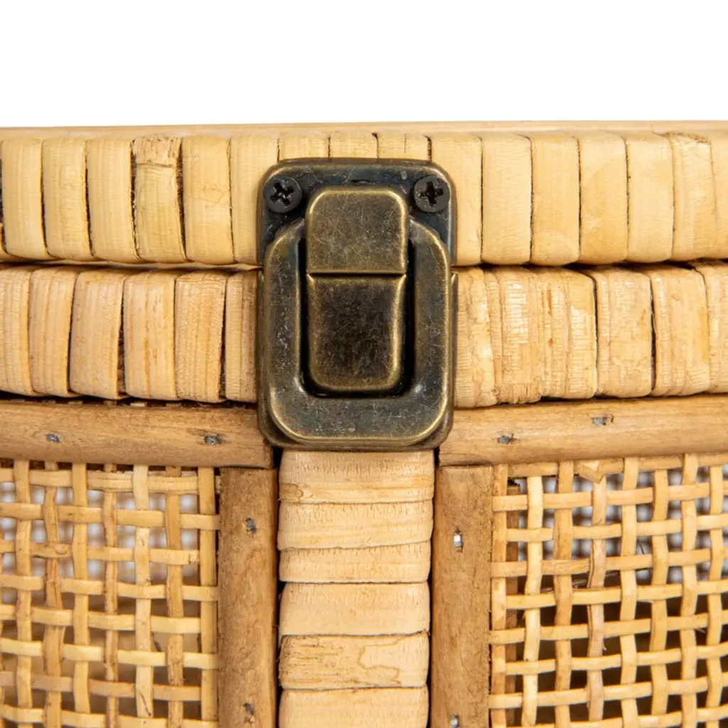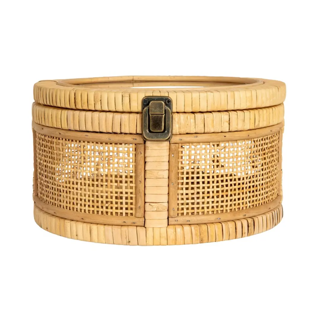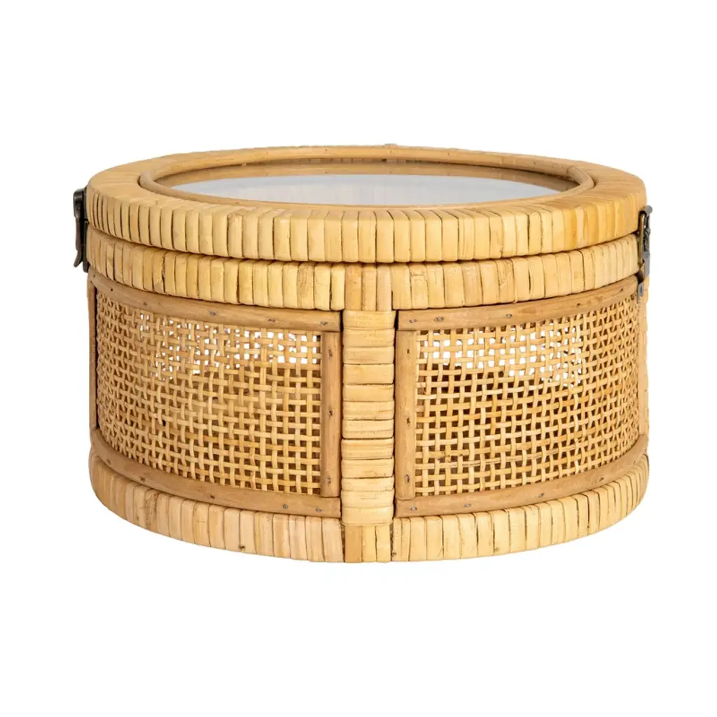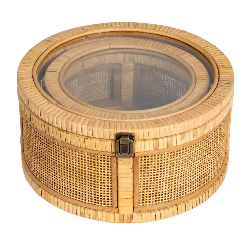 Add these alluring Round Storage Boxes to the home for a blend of functionality and natural beauty. The rattan and bamboo construction offers a lightweight yet sturdy option for storing various items, while the glass lids make it easy to identify contents at a glance. These nestable boxes are perfect for saving space and can be used to store anything from jewelry to spices, making them a versatile addition to any room. The main storage measures 11.75 inches in diameter and 6 inches in height, providing ample and stylish storage solutions. Their natural finish and round shape bring a touch of organic elegance to any decor, harmonizing with multiple design aesthetics.