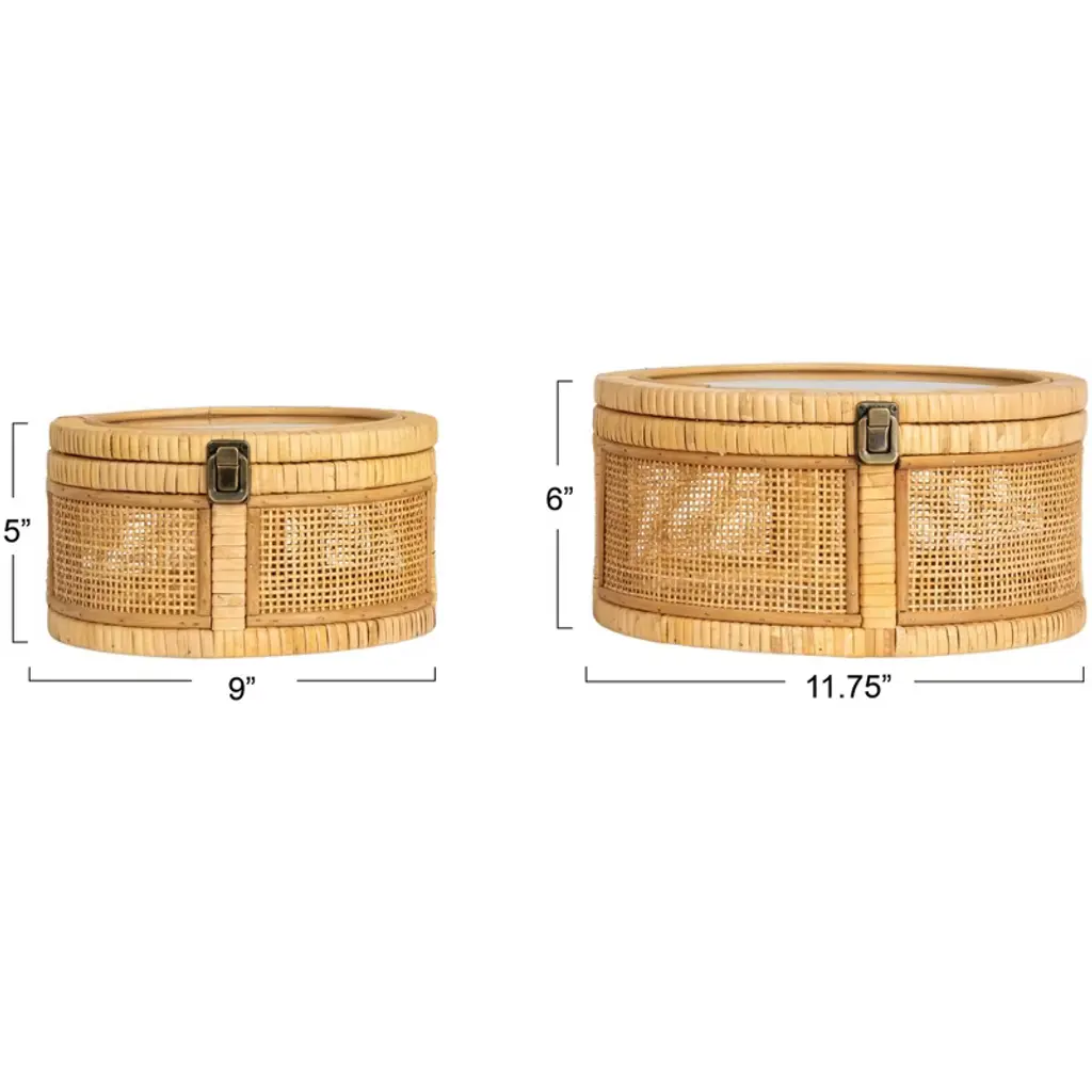 Storied Home Rattan And Bamboo Nestable Round Storage With Glass Lids, Natural, Set Of 2