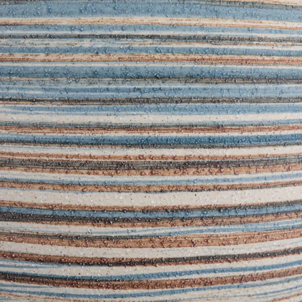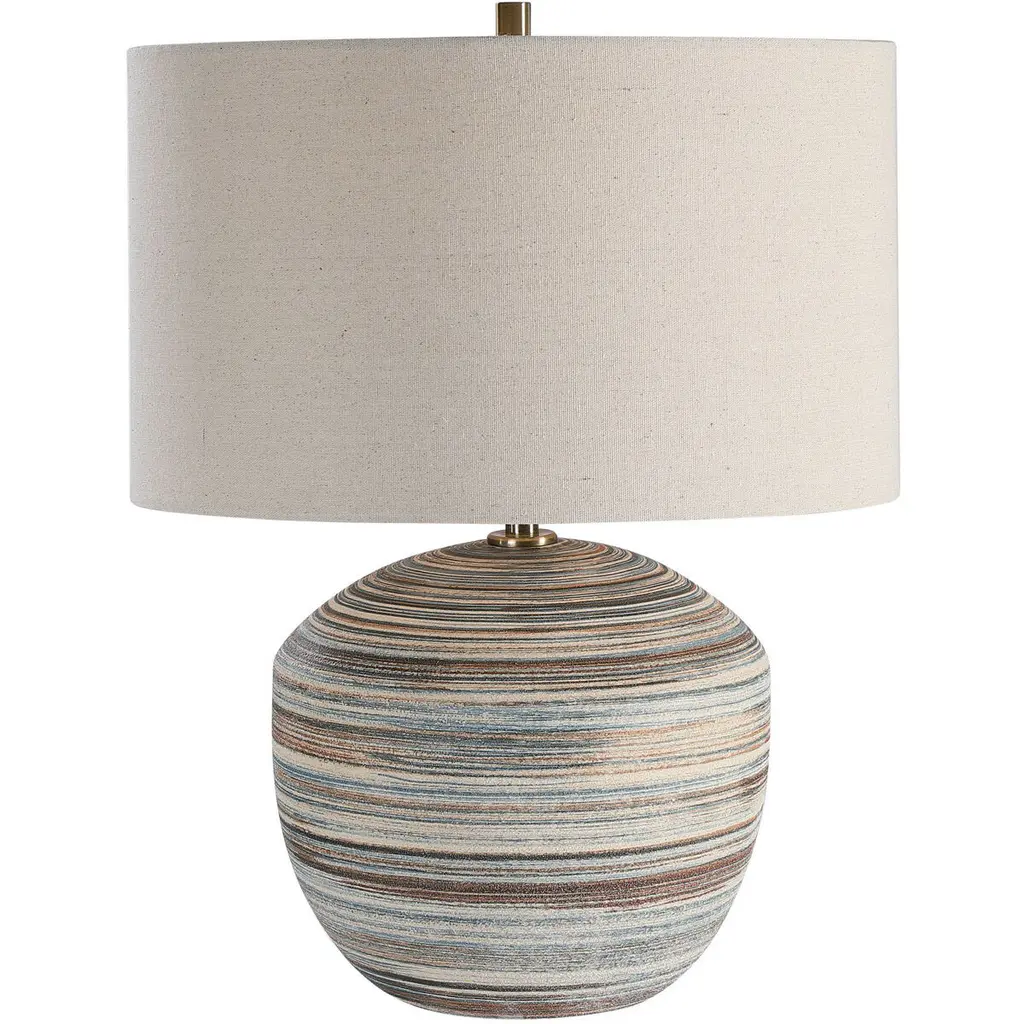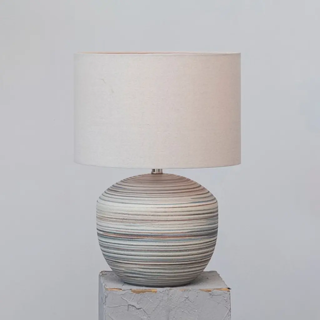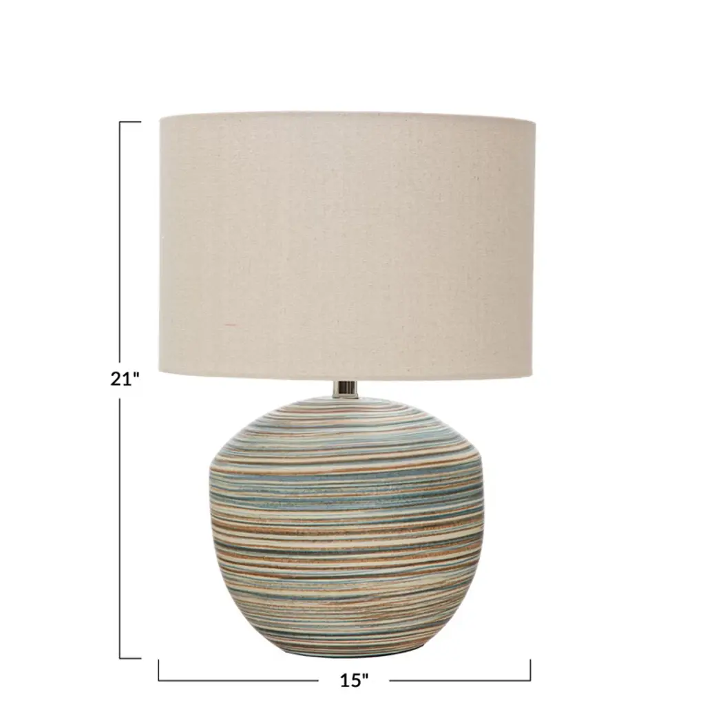 Illuminate the space with this striped stoneware table lamp that features a coastal-inspired design. This table lamp showcases a stoneware base with a sand finish and a textured surface, creating a natural and cozy look. The base is adorned with delicate stripes in multiple colors that add a touch of charm and personality to the lamp, while the linen drum shade creates a soft and cozy light that complements the base. The shade is made of linen, which is a natural and durable fabric. This table lamp is suitable for any living space that needs natural beauty and elegance, such as the living room, bedroom, office, or any other area. It can also be an excellent gift for anyone who loves transitional, coastal, or bohemian design. This table lamp requires one 100W bulb (not included) and is conveniently equipped with an in-line switch. It measures 15 inches in diameter and 21 inches in height, and the cord length is 8 feet. Add this striped stoneware table lamp to the home and enjoy its beauty and functionality.