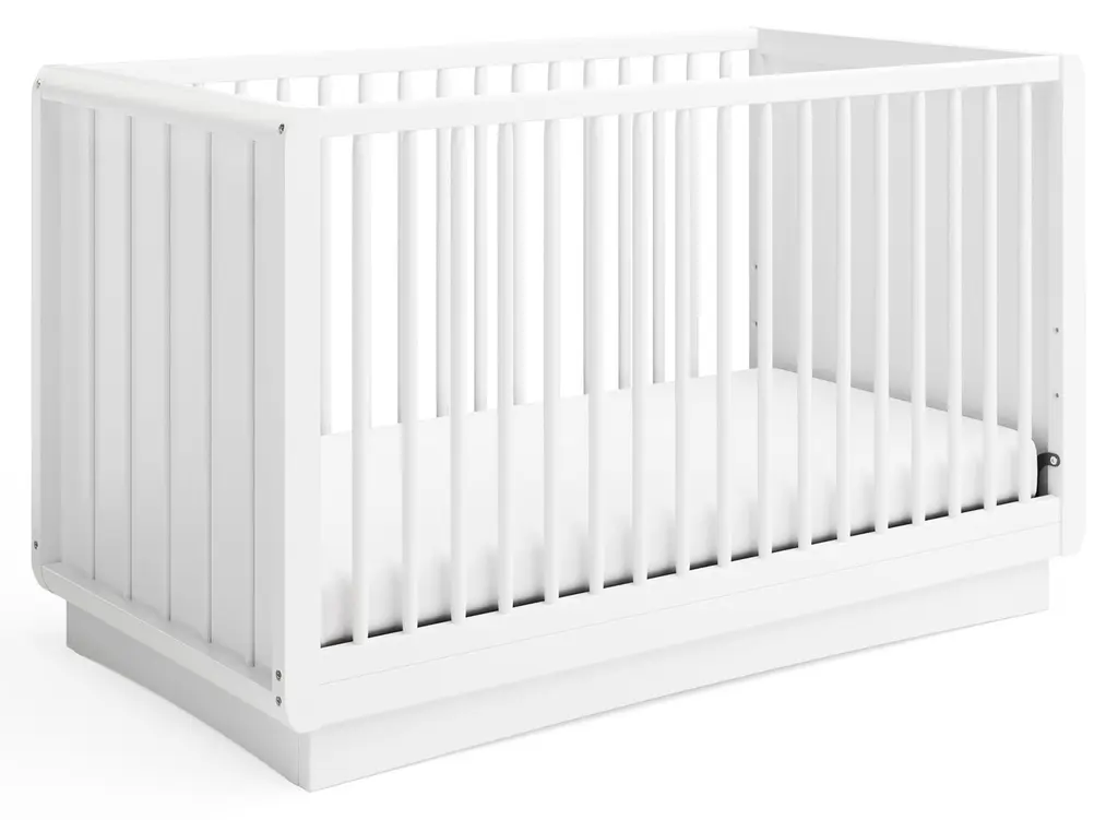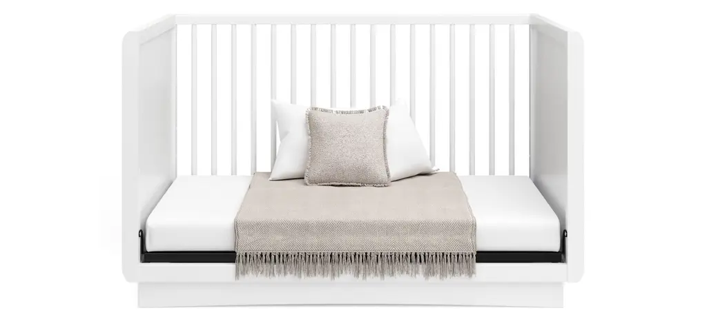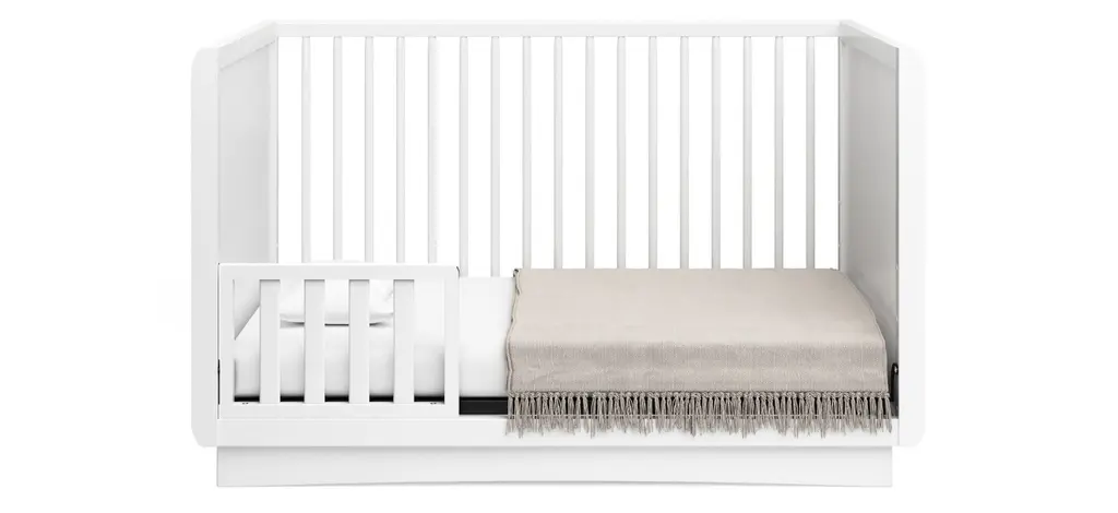 A stunning mid-century modern style, clean lines, and over 75 years of quality craftsmanship are combined in the Storkcraft Skye 3-in-1 Convertible Crib. Designed to accompany your child -from babyhood through toddlerhood, the Skye easily converts from a stylish crib into a toddler bed (Storkcraft Toddler Safety Guardrail with dowels or slats sold separately), and daybed. The Storkcraft Skye 3-in-1 Convertible Crib is also equipped with a 3-position adjustable mattress support base to accommodate your growing baby, and is able to fit any standard full-size crib and toddler mattress. For a safer sleep, the Storkcraft Skye is JPMA Certified, meaning it has been expert tested by independent laboratories to guarantee that it meets the highest standards for your child’s safety. Assembly required, mattress sold separately, toddler safety guardrail sold separately.