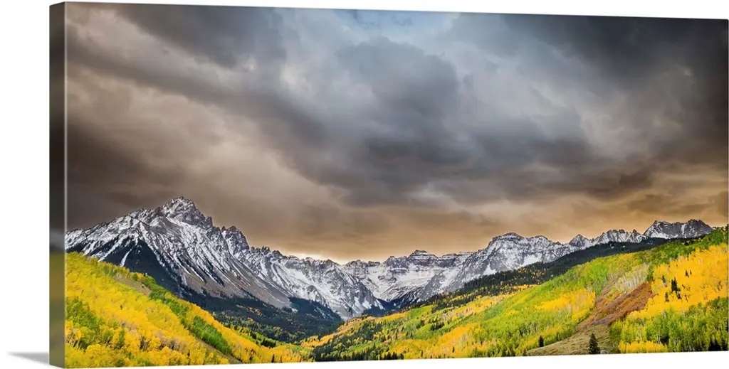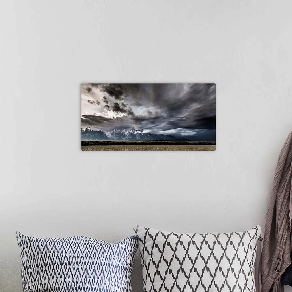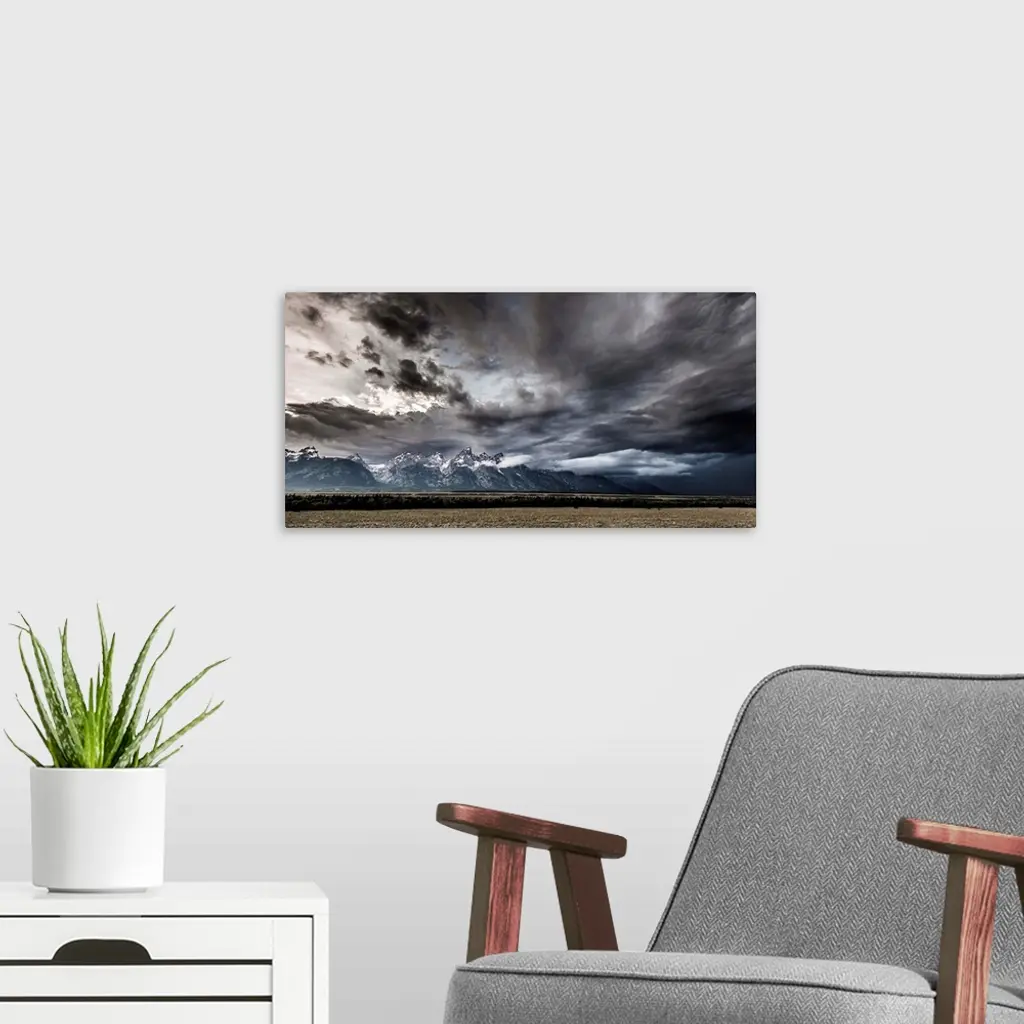 Landscape photograph of a field in front of snow capped mountains with a dramatic stormy sky above.