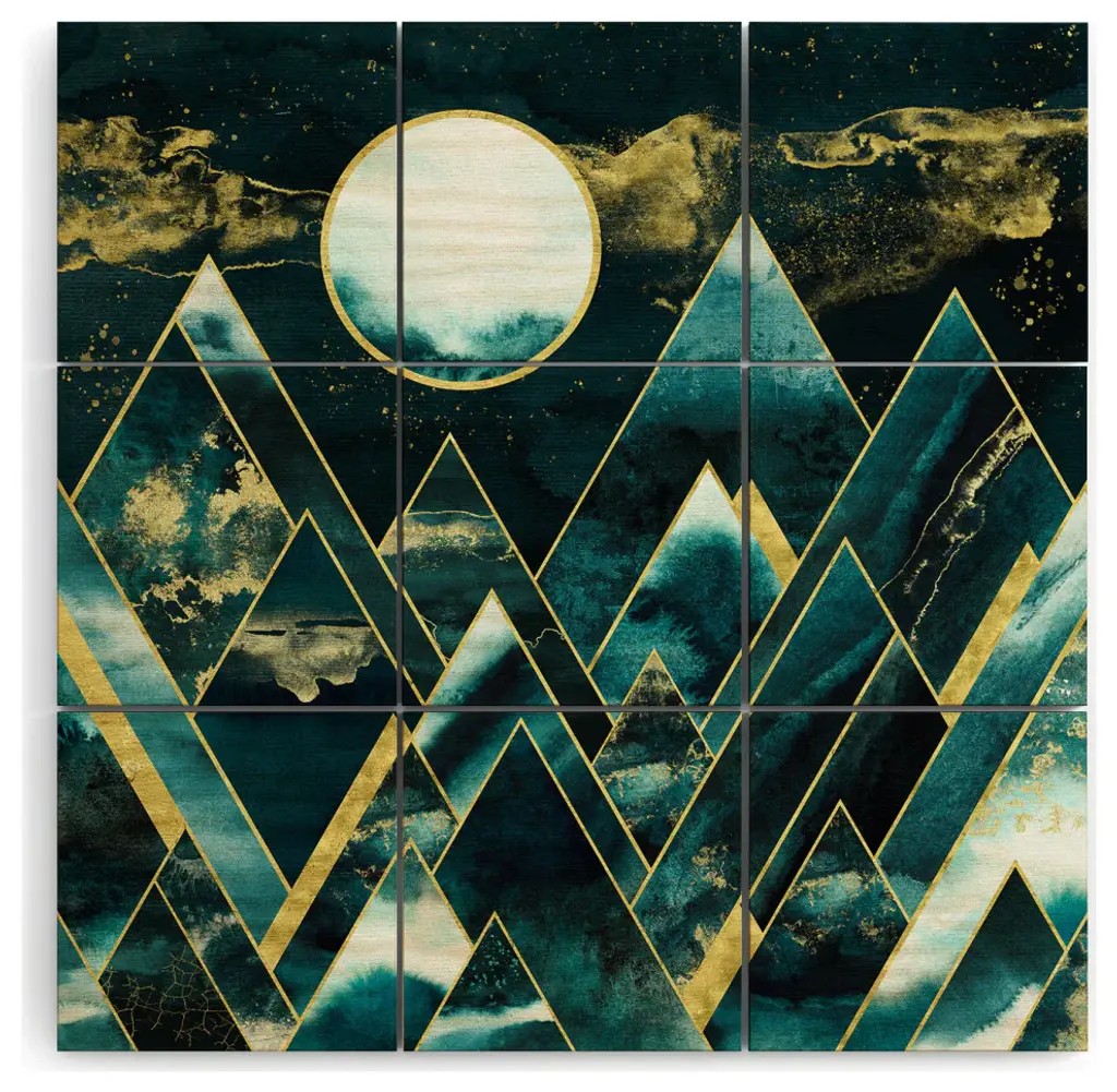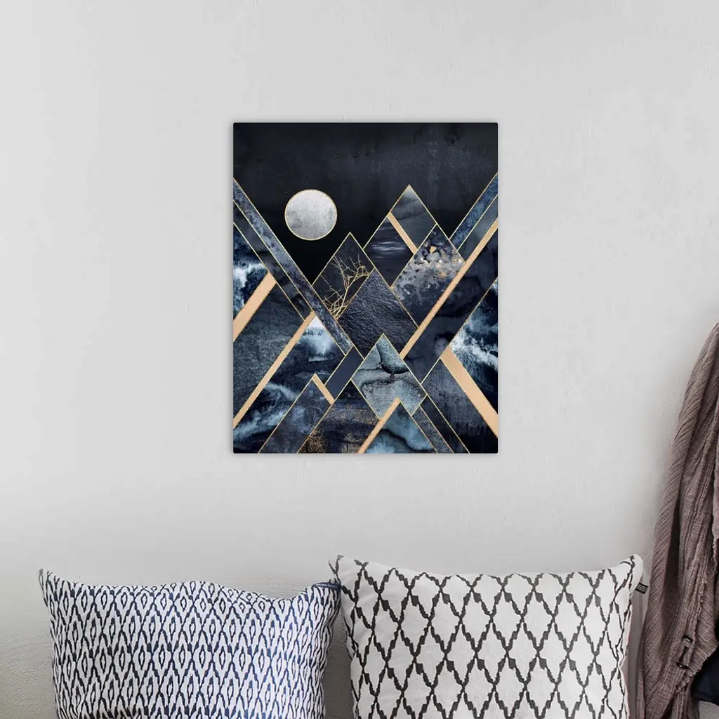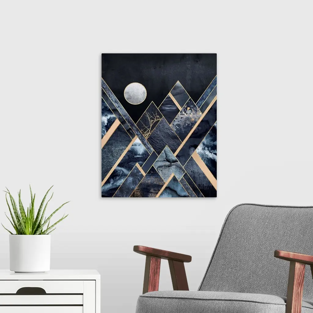 A simple geometric interpretation of triangular mountains in shades of steel blue, gold and grey beneath a white moon.