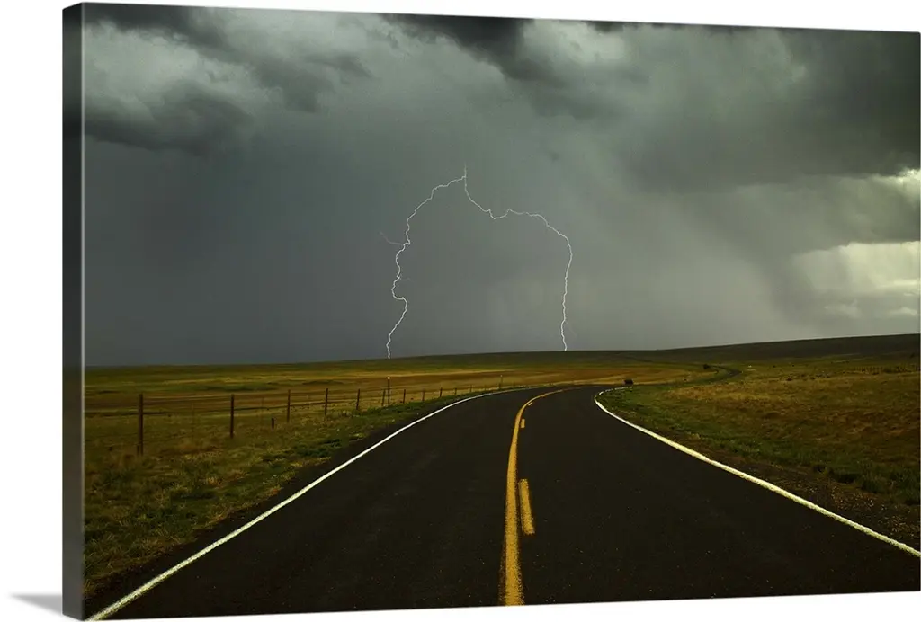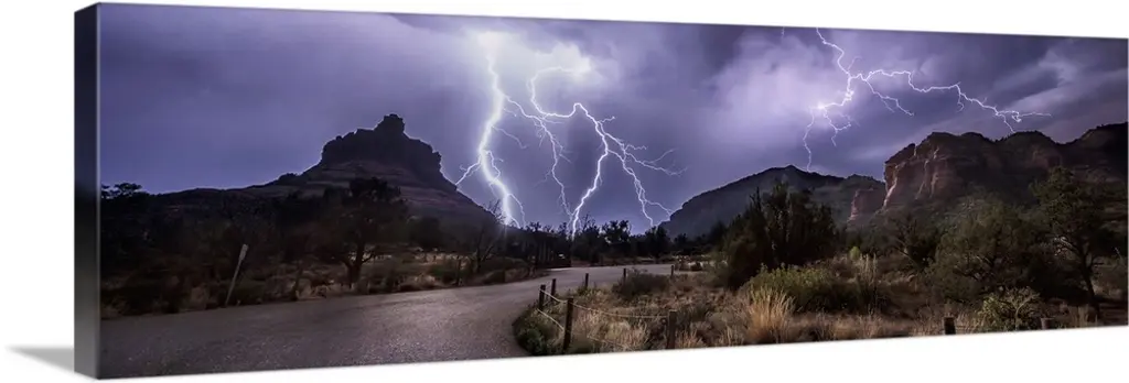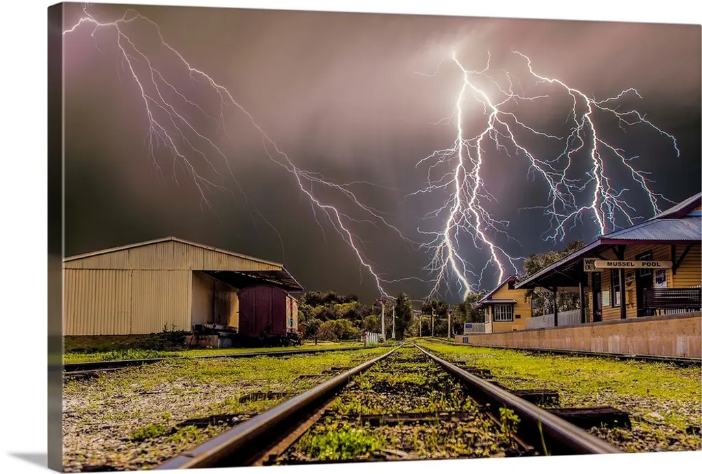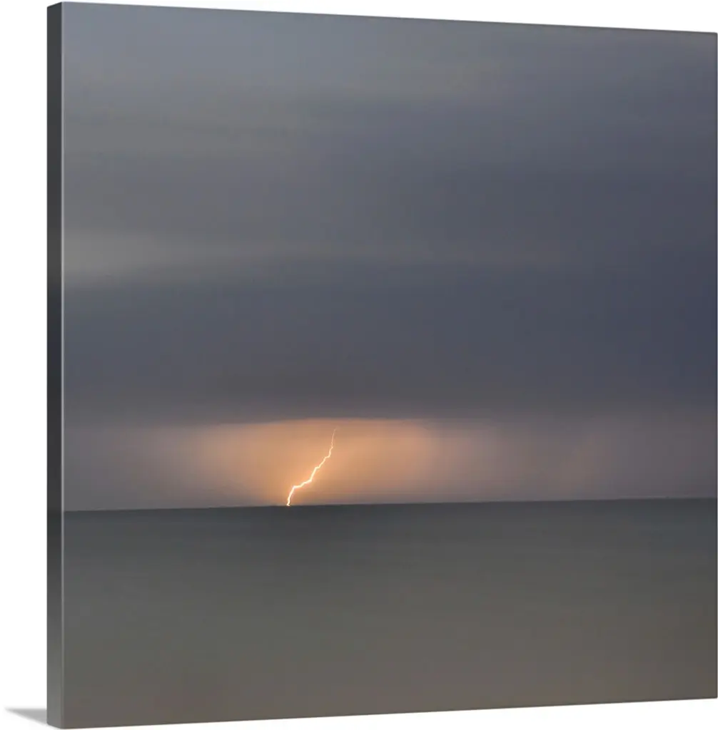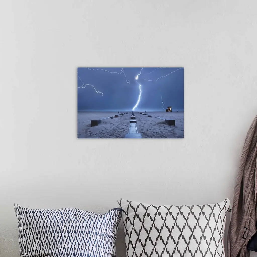 Bolts of lightening light up a dreary sky as rows of benches sit on the sandy beach.