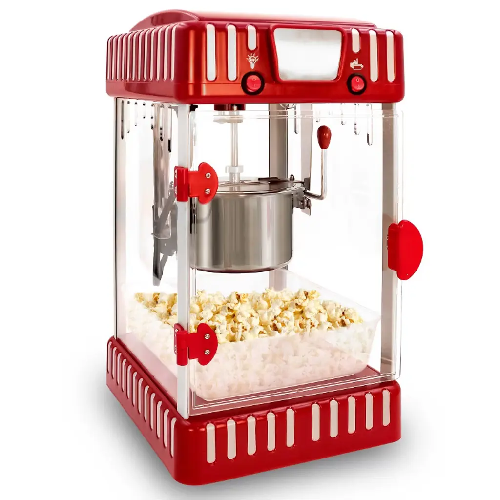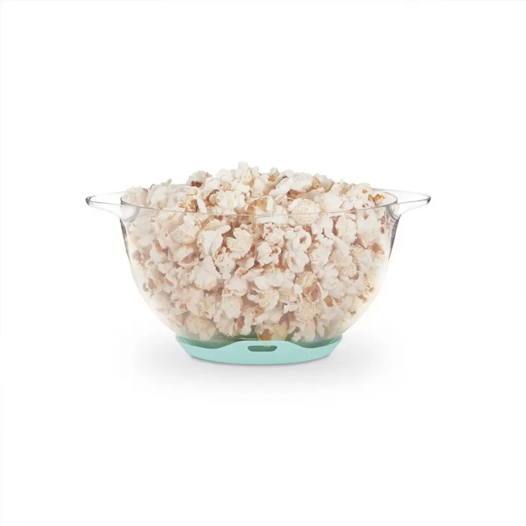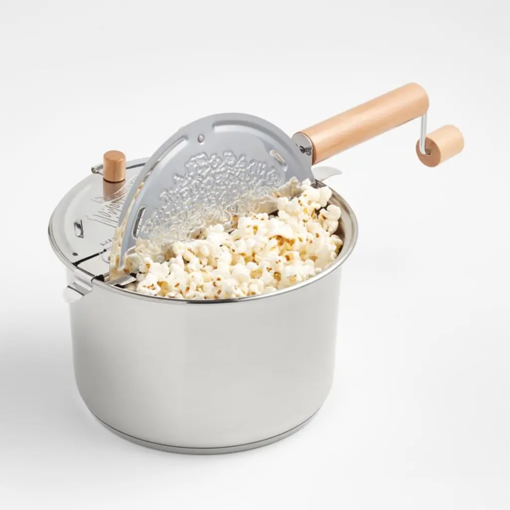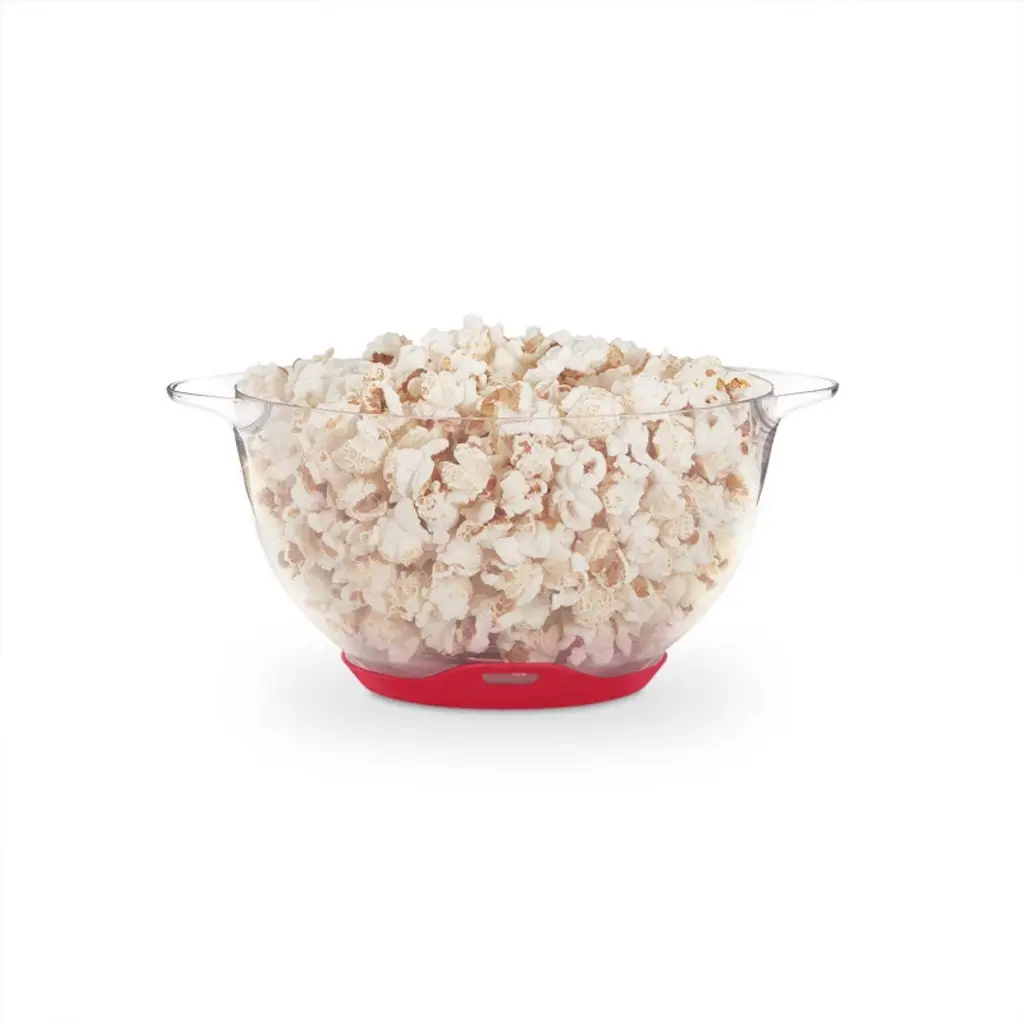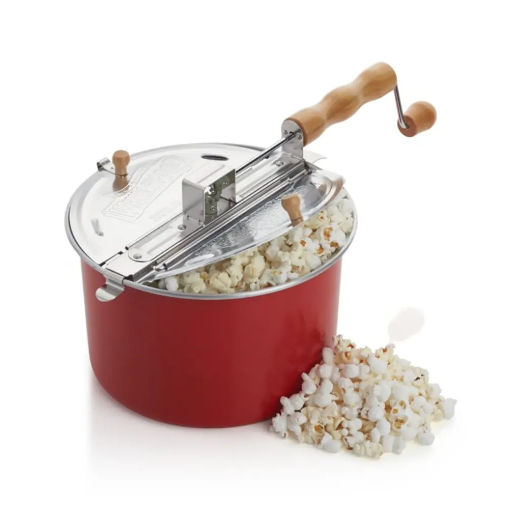 Pop up to six quarts of perfect popcorn with this easy-to-use red popcorn maker. Fill with your choice of popcorn then add as little as one teaspoon of oil. Heat on the stovetop and in less than three minutes you'll have lots of tasty popcorn. Four vents allow steam to escape so popcorn stays tender yet crispy. The patented stirring mechanism is designed like a commercial popper, preventing sticking and burning, and making sure each kernel is popped to perfection. Kit includes instructions and a recipe guide.