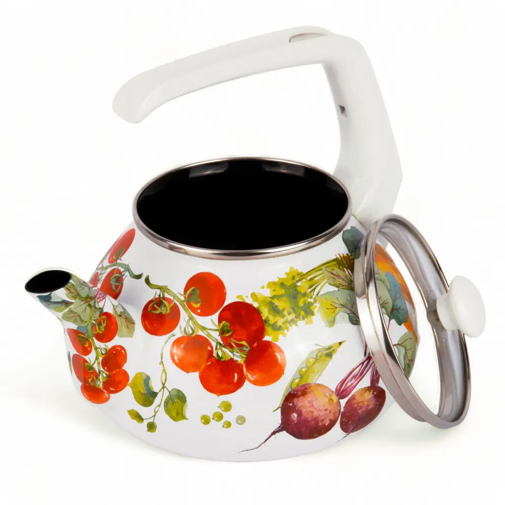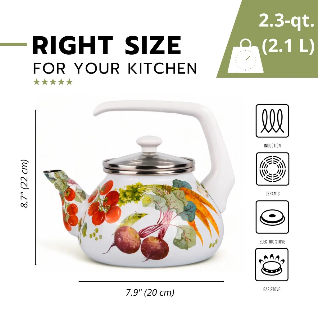 An attractive and high-quality enamel 2.3-qt kettle will beautify any kitchen and help you find a new reason to invite your friends to a cup of tea!Safe Coating: Enameled cookware is safe for human health. The coating does not react with food and retains its nutritional properties. The enamel layer resists the growth of bacteria and is hypoallergenic. Eco-friendly.Versatility: Suitable for all stove tops: gas, electric, ceramic, and induction.Good investment: Crafted for longevity, the kettle is made of thick 0.7mm aluminum and covered with high-quality enamel. Don't heat an empty kettle, and do not cool it abruptly so that the enamel does not crack or change color, and the kettle will serve you for many years. Care: Does not need special care. Try to avoid chips and deep scratches. Do not use metal sponges or abrasive cleaners. Dishwasher safe.The design of the "Veggie Galore" collection is crafted for STP Goods in Italy.Not suitable for microwave.The kettle will be sent with a safety white plastic cup on his nose, kindly remove it before using. Specs: Capacity: 2.3-qt. (2.2 L)Fill / Material: enameled aluminum 1 mmDimensions: 7.9 х 7.9" (20 х 20 cm); H: 8.7" (22 cm)Weight: 2.53 lb (1.15 kg)Care & Use: Dishwasher safe, Not microwave safe
