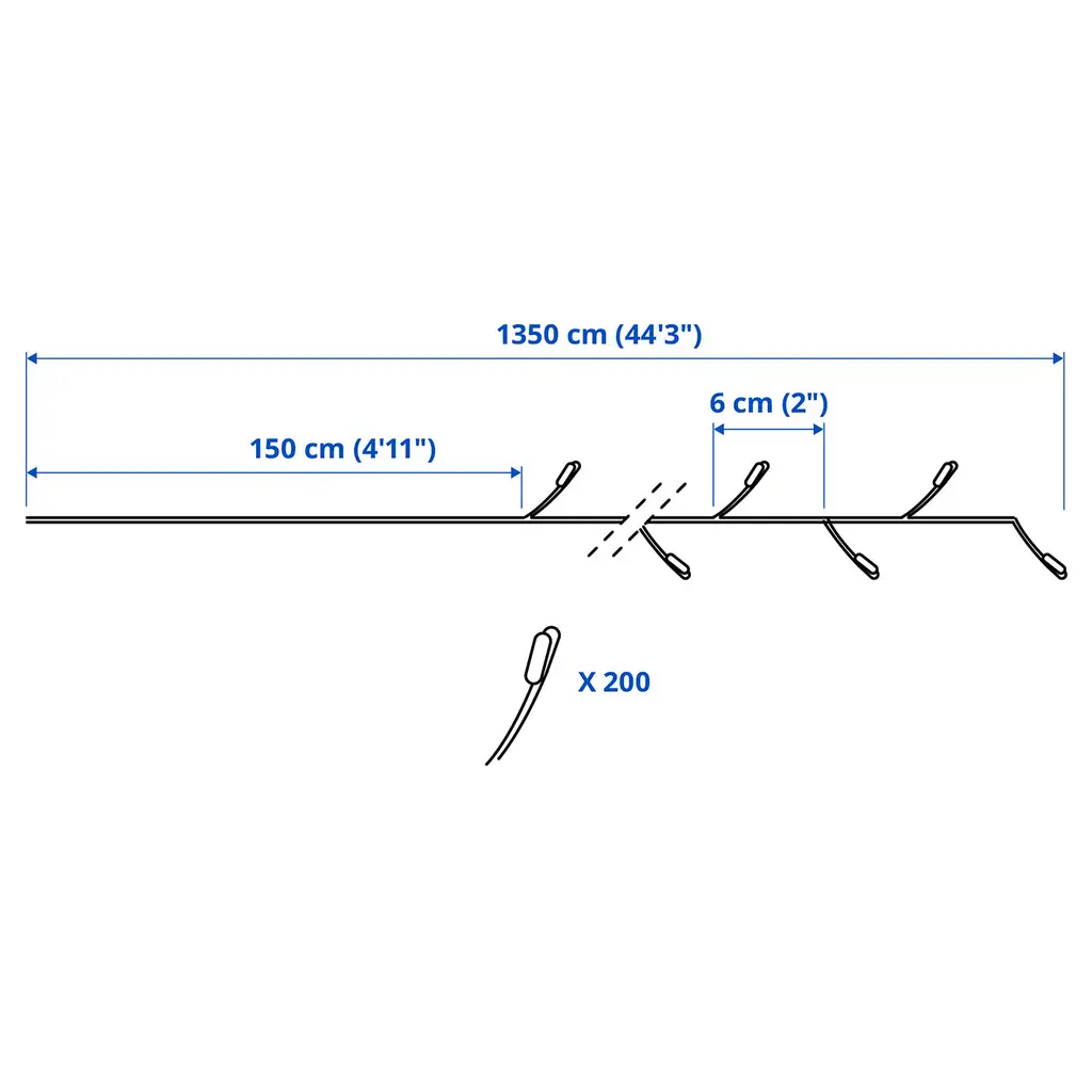 STRÅLA LED lighting chain with 200 lights - black. The lighting chain can be illuminated in three different ways: with a fixed light, a flashing light, or an alternating light that slowly turns on/off. Choose the light that best suits the moment. Built-in LED light source. Only for indoor use.