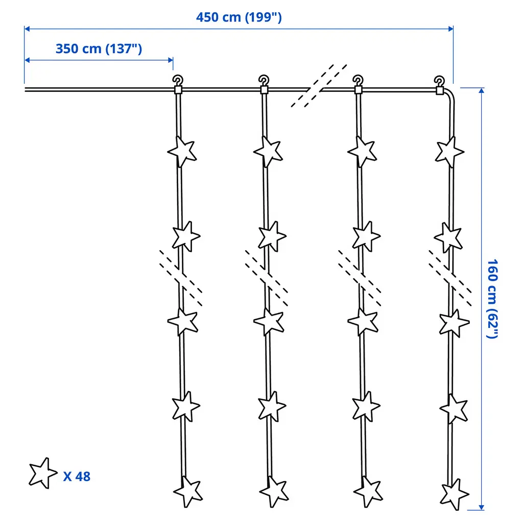 STRÅLA LED string light curtain/48 lights - outdoor star. Gives a warm, cozy glow and spreads the holiday atmosphere outdoors, around your patio, terrace or balcony. For indoor or outdoor use. Built-in LED light source. LED life approx. 20,000 hours. This product bears the CE mark.