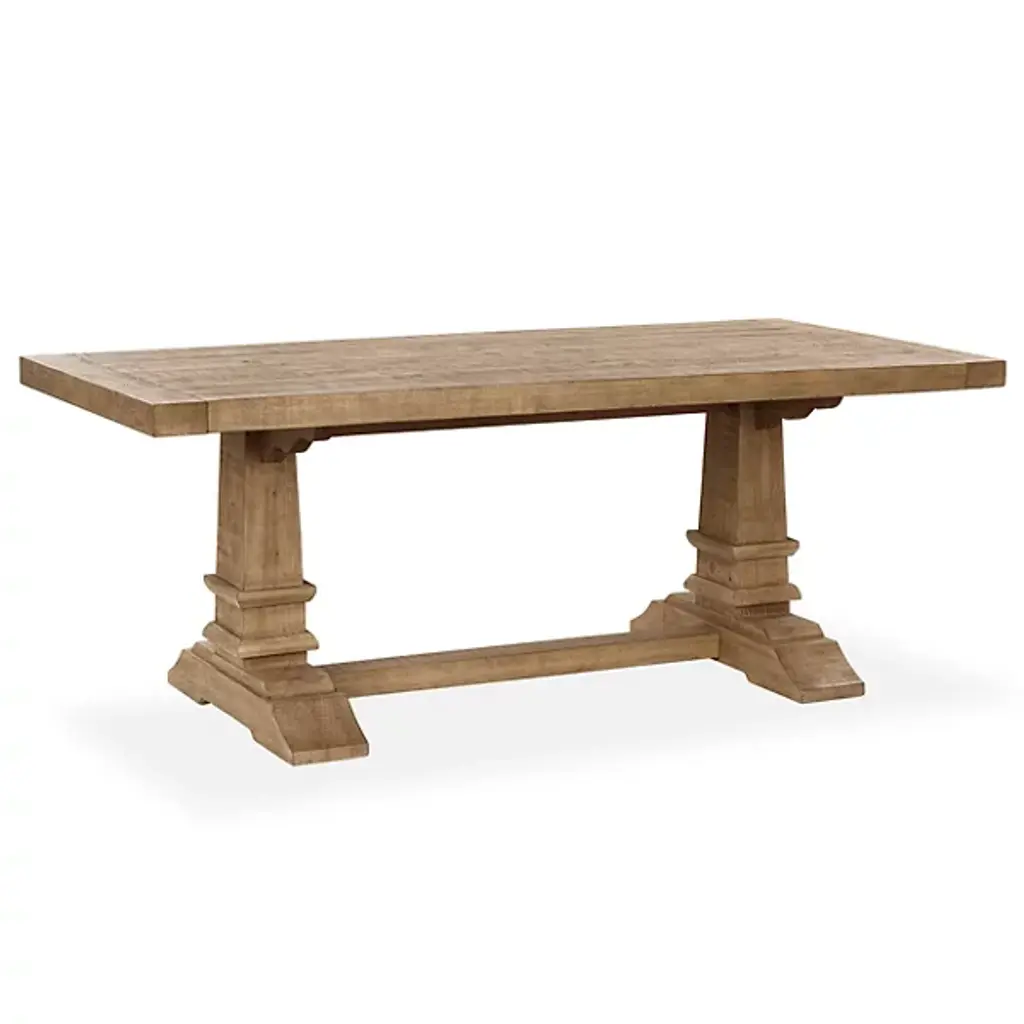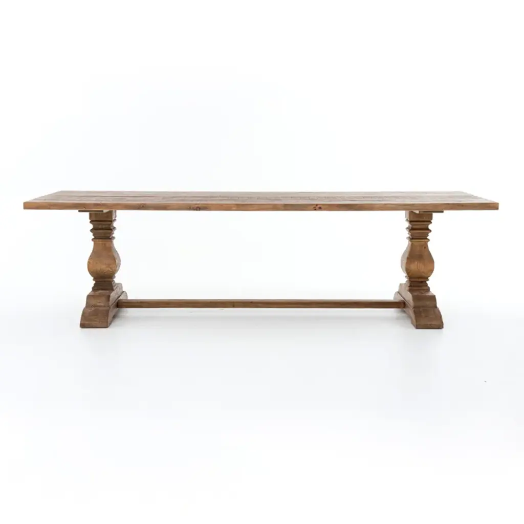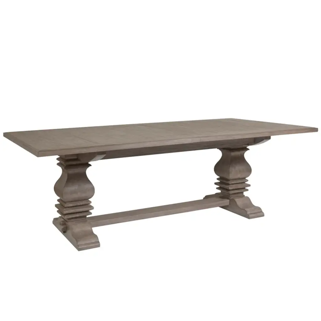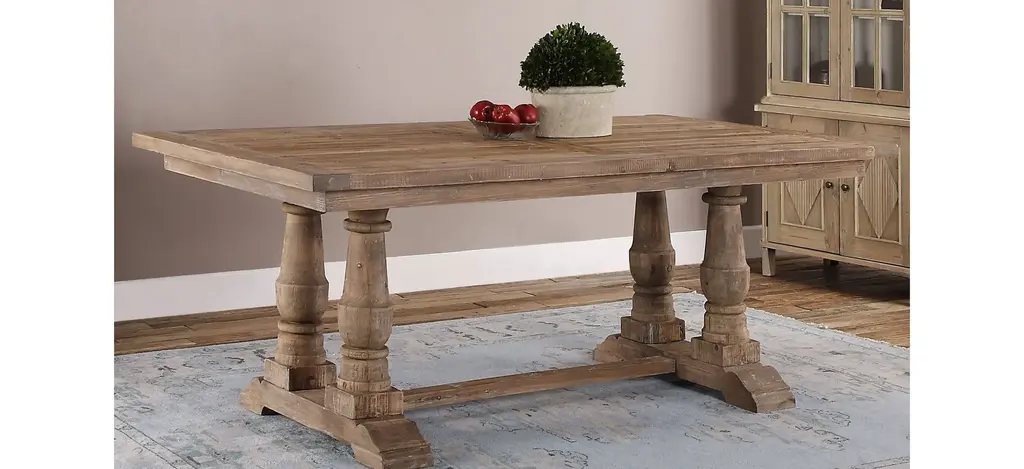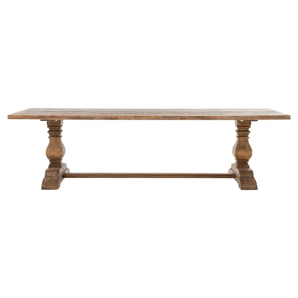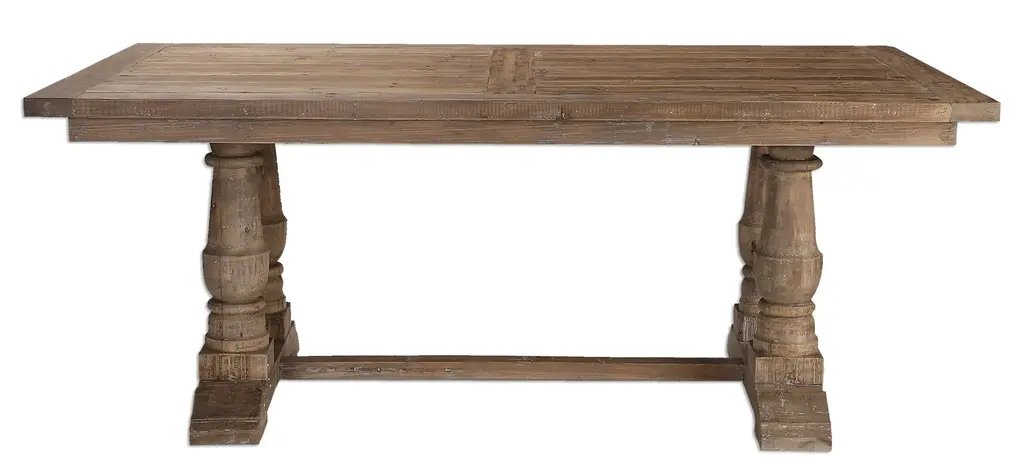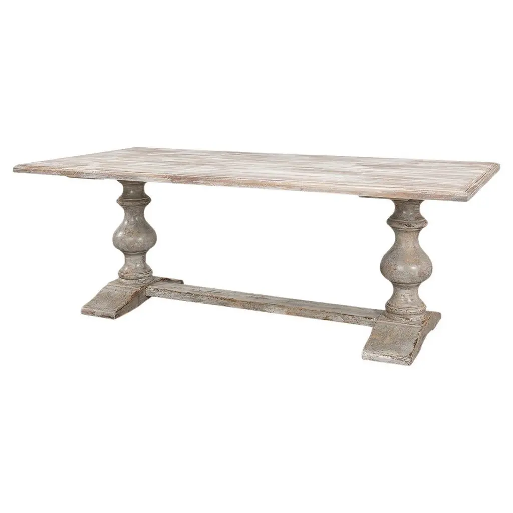 Solidly constructed of salvaged fir lumber and hand turned balusters. Sun faded and distressed patina is finished with a stony gray wash. Distance between legs is 42.5".