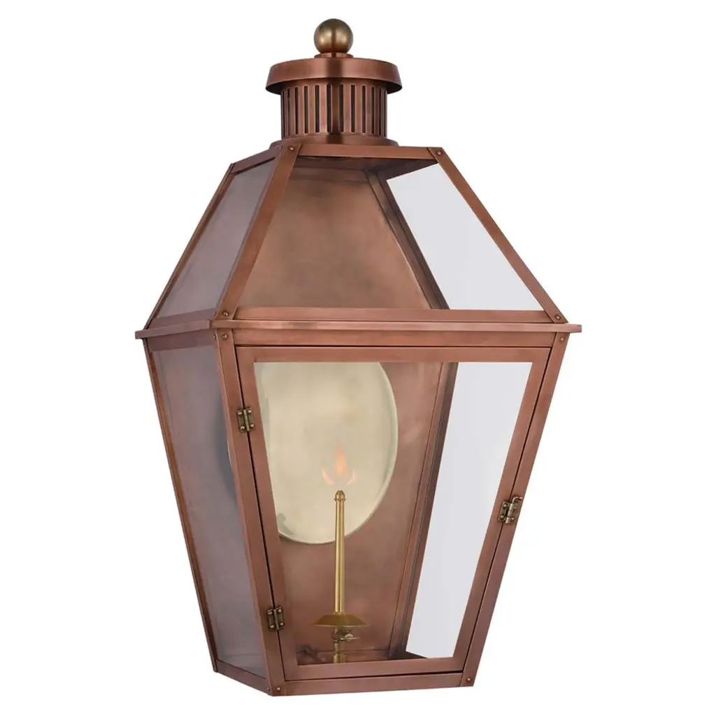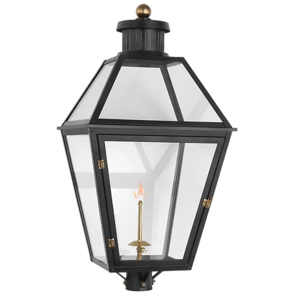Visual Comfort Signature presents the Stratford Outdoor Gas Post Light, designed by Chapman & Myers. It boasts a traditional lantern shape at the top. A dainty metallic finial adds a subtle touch of sophistication. Meant for professional installation, this outdoor light operates on natural gas, casting a warm and inviting glow that transforms the surrounding area. With its captivating design and superior functionality, the Stratford Outdoor Gas Post Light makes a statement among your outdoor spaces.