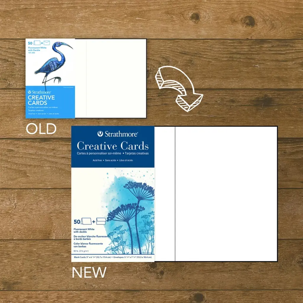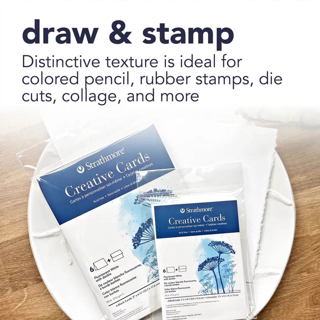 Strathmore Creative Cards & Envelopes, Fluorescent White with Deckle Edge, Full Size, 5x6.875 inch, Pack of 50 | Introducing Strathmore Creative Cards, the perfect solution for all your special event & stationary needs. Whether you're announcing a wedding, gifting for a birthday, or inviting guests to a party, these versatile cards offer endless possibilities. Available in various styles, including fluorescent white, ivory, & the vibrant "Palm Beach" colors, as well as options for plain or deckle edges, & both full size & announcement size, there's a perfect fit for every occasion. Each set of Strathmore Creative Cards includes envelopes, ensuring a complete & polished presentation. Artists choose Strathmore to help them tackle their creative projects with confidence.