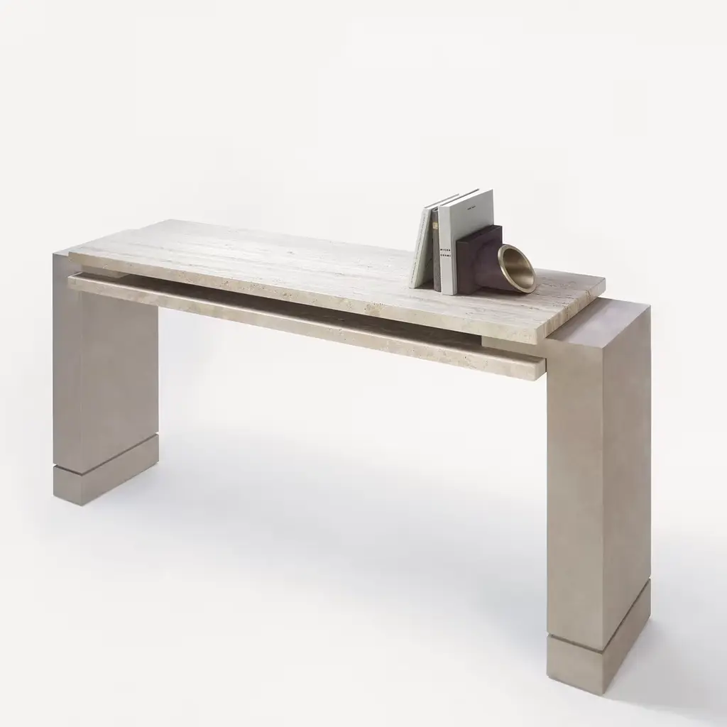 Exceptional craftsmanship and eye-catching design that places a strong focus on minimal shapes are the hallmarks of the Stratos Collection designed by Stéphane Parmentier exclusively for Giobagnara. Seemingly suspended between the imposing L-shaped legs covered in ivory suede, the top of this architectural console showcases two polished slats of travertine in an elegant silhouette of strong visual impact. Not customizable.