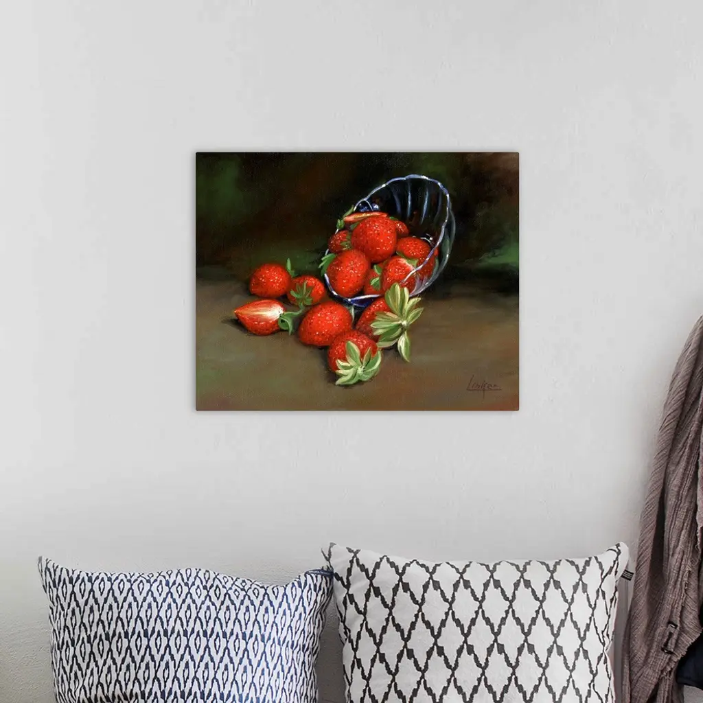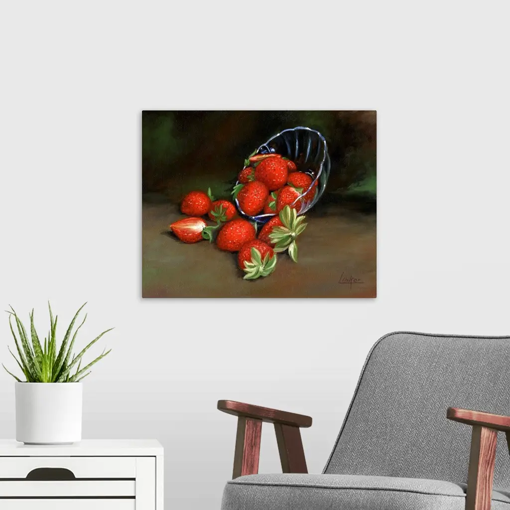 Contemporary still life of a spilled bowl of strawberries.