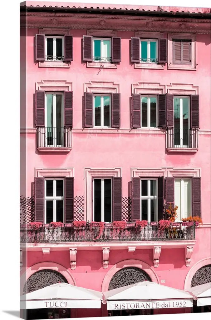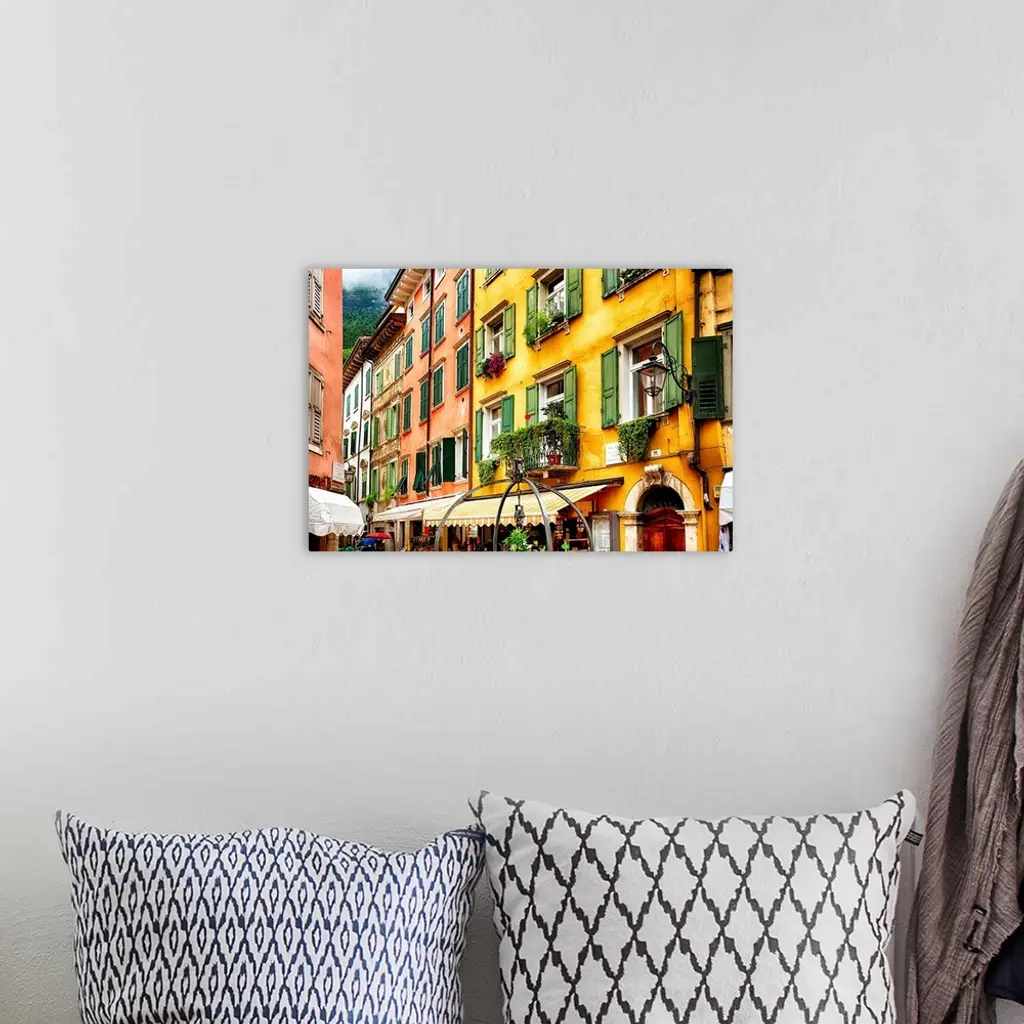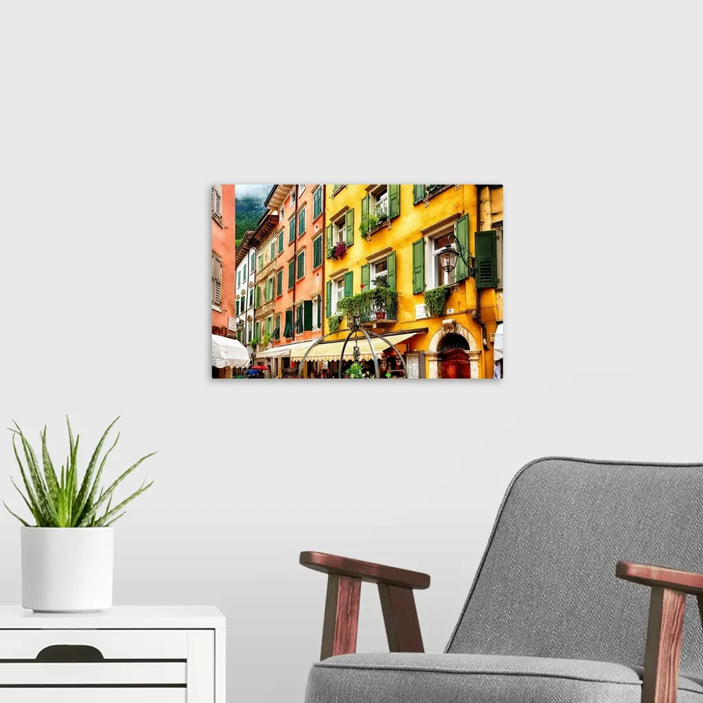 Fine art photo of the brightly colored buildings and window shutters of an Italian street.