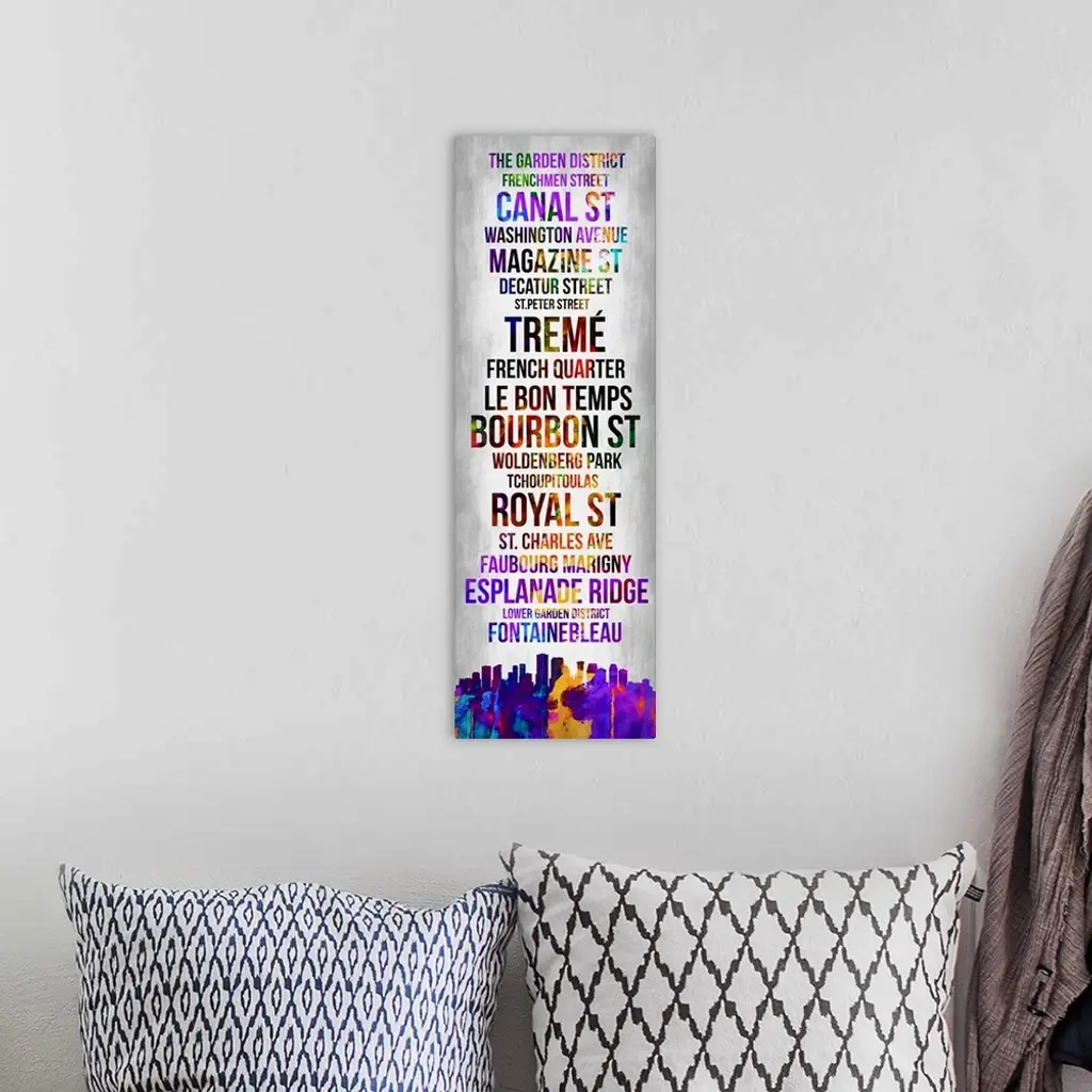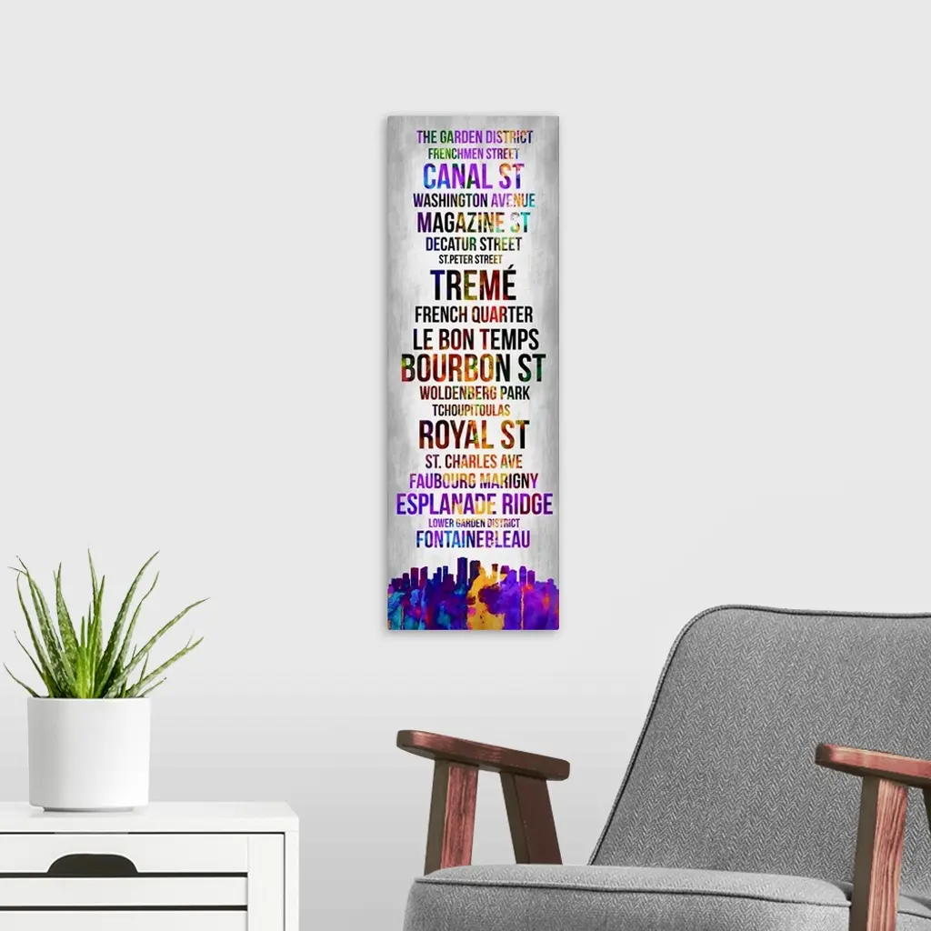 Contemporary watercolor bus roll art incorporating the New Orleans city skyline.