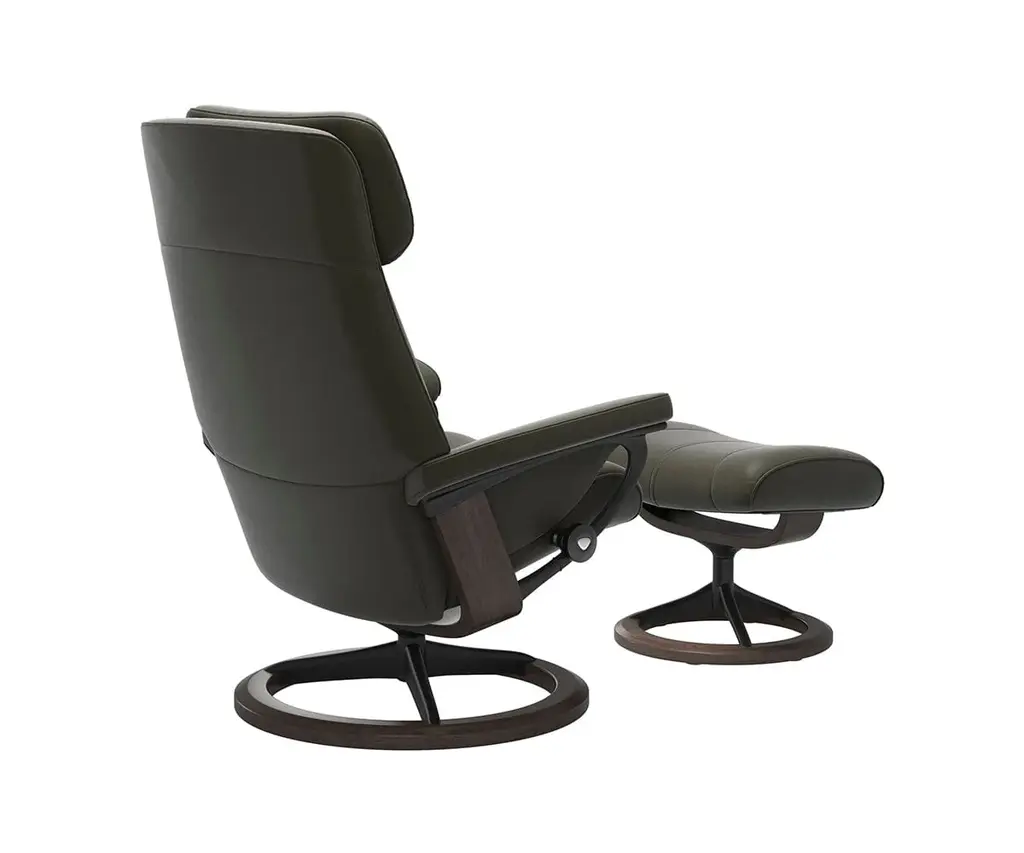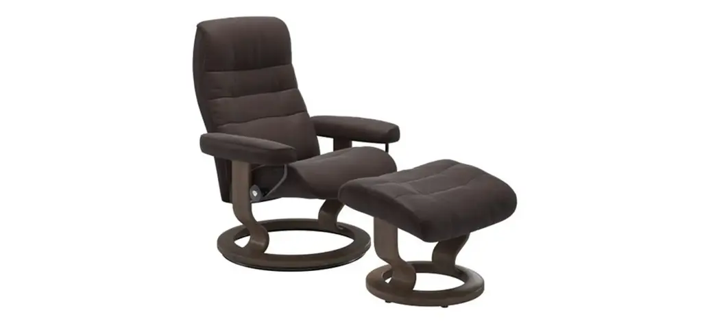 The Stressless Paul Recliner is all about personalized comfort, including a generously cushioned, height-adjustable headrest that extends up to 2.75 inches for a perfect fit. The winged back and extra side padding offer a cozy, hugged-in feel, while the plush seat lets you sink in and stay awhile. Finished with premium details like sleek piping, soft armrests and an elegant wenge or walnut base, it's as comfortable as it is stylish. Available for custom order in an assortment of leather, fabrics and wood finishes.