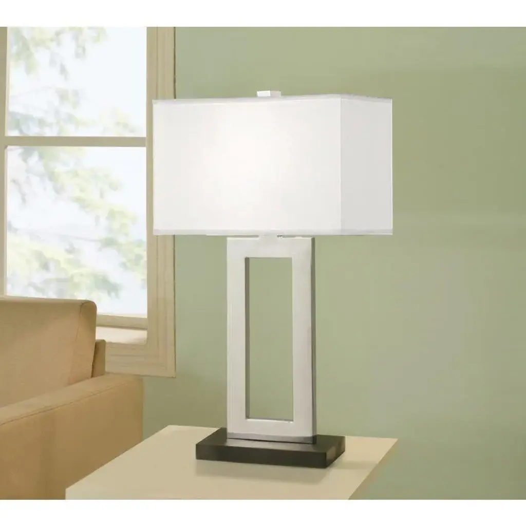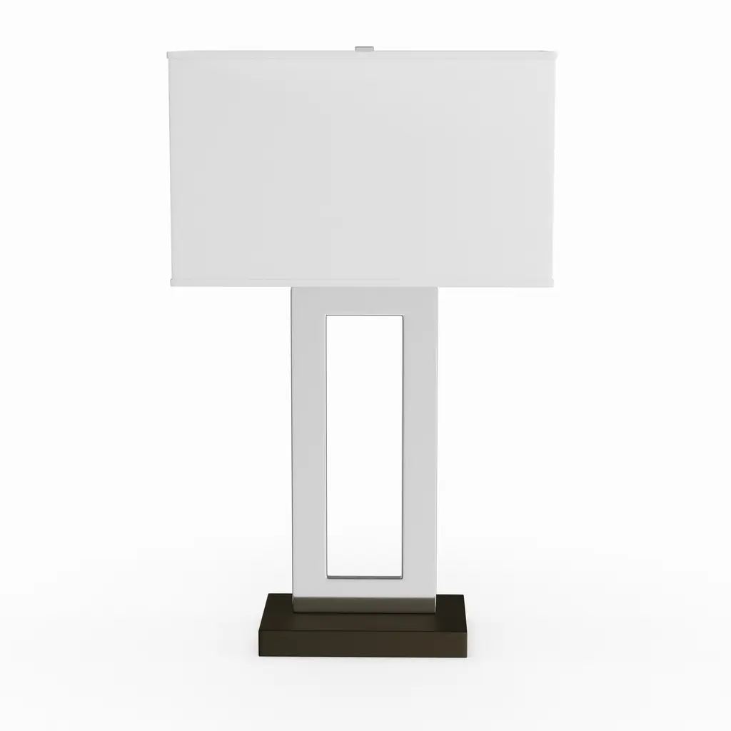 Add a modern accent to your living room or office with this table lamp by Strick & Bolton. The silver rectangular design is finished with a matte black base for sturdiness and constrast. Adjust the lamp for movie nights or reading with the convenient 3-way switch.Features:Made of metalModern, contemporary styleBlack and white colorSilver, chrome finish100-watt 3-way bulb or 23-watt CFL bulb3-way switchRequires assemblyDimensions:Shade: 16 inches wide x 9 inches deep x 10 inches tallOverall: 29.5 inches high x 16 inches wide x 9 inches deep