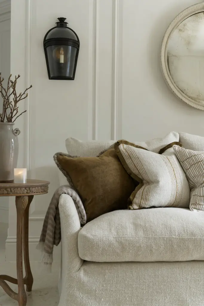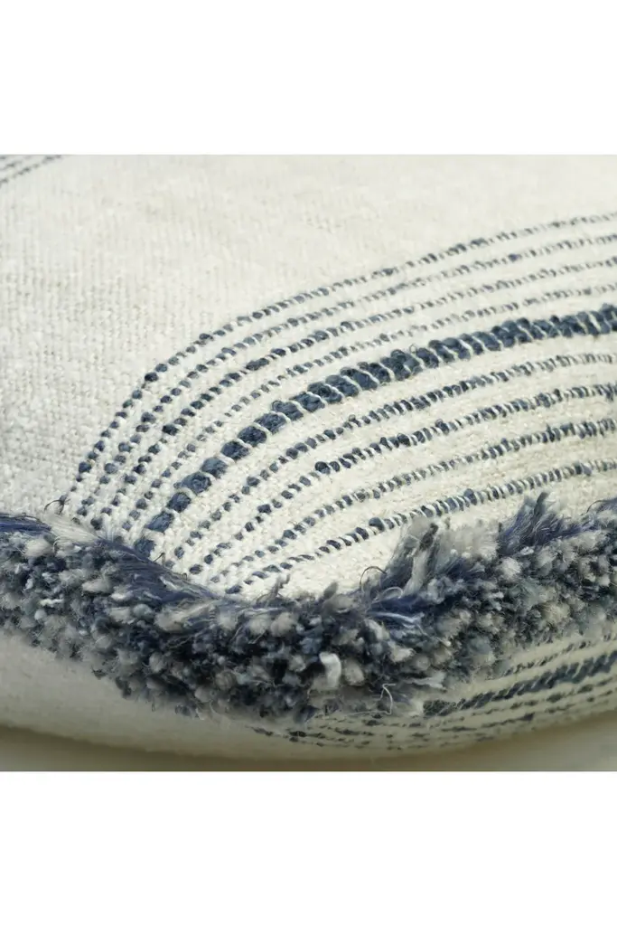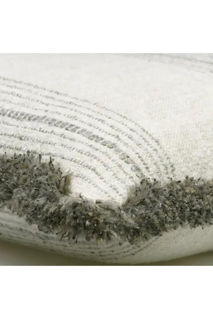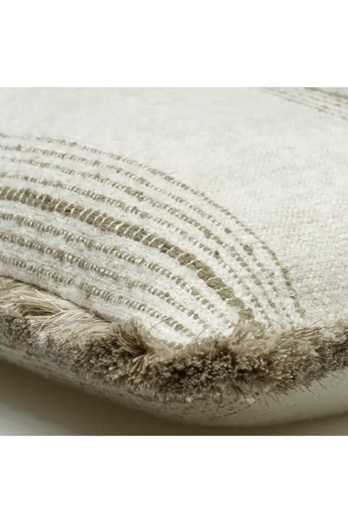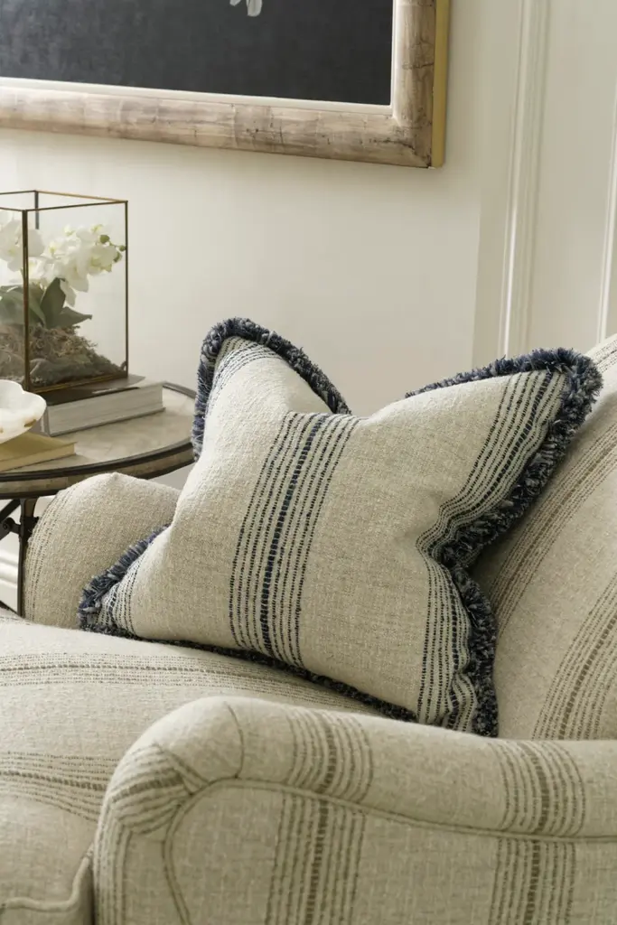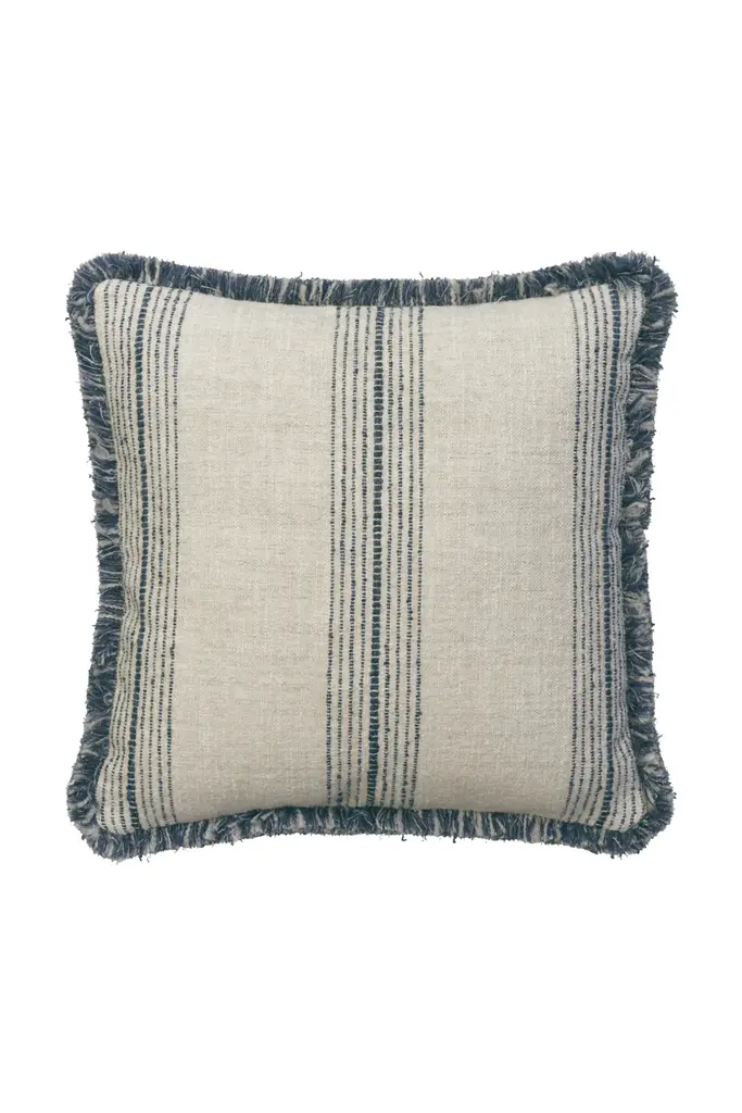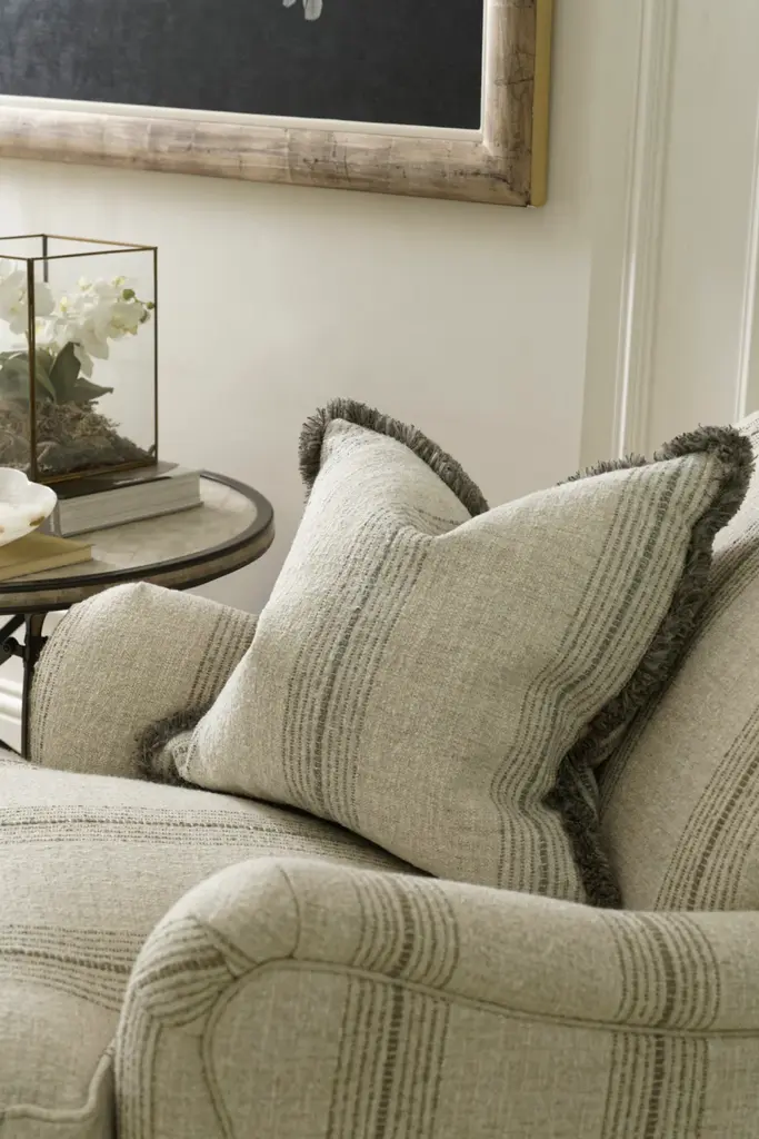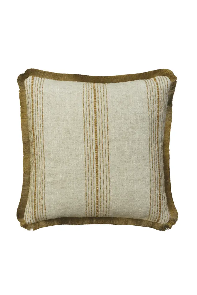 A glamorous linen cushion, made from Atrani Stripe Taupe and finished with luxurious Alezio Gold, Cocktail Stormy, Florentia Gold, and Moscow Mule trim. Atrani Stripe is inspired by the small coastal town of the same name in the southwest of Italy, which is built into the rugged cliffs of the Amalfi coast. A small town with a network of alleyways, courtyards and arches. This striped fabric has a beautiful irregular boucle yarn stitched into the surface of a rustic woven linen and viscose ground.This cushion is stuffed with our signature plush feather inners, sustainably sourced from Scandinavia, with 50% recycled feather from recycled duvets and jackets. - Gray, Dark gray, Brown, Blue