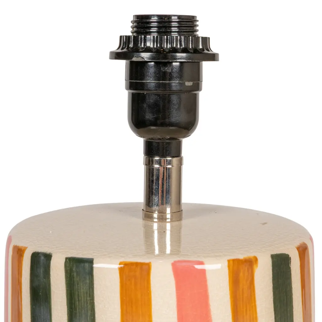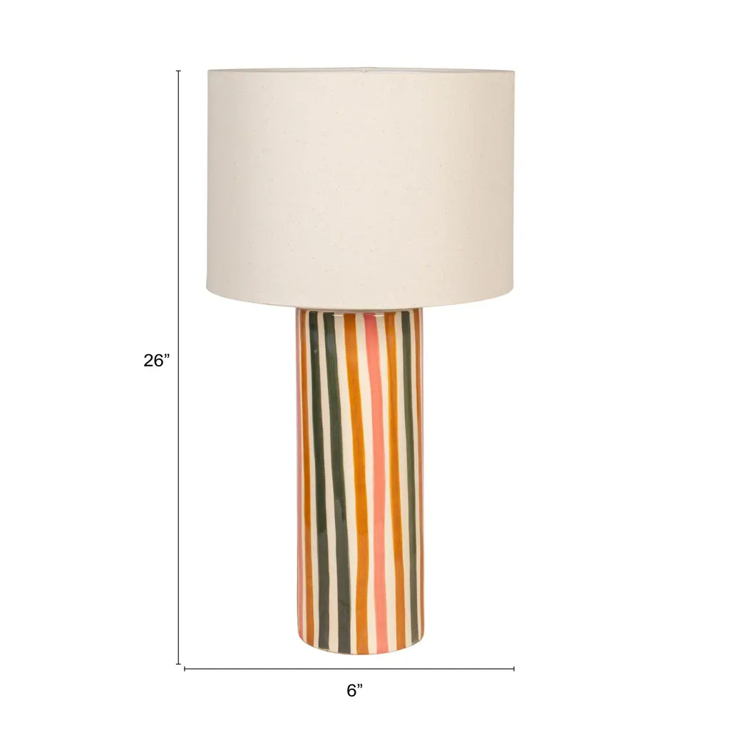 Add a playful yet sophisticated touch to your decor with the Multicolor Stripe Stoneware Table Lamp. Featuring a tall, cylindrical stoneware base adorned with bold vertical stripes in vibrant hues, this lamp is both a functional light source and an artistic statement. The neutral linen shade balances the colorful design, offering soft, diffused lighting for a cozy ambiance. Perfect for brightening bedside tables, living room consoles, or office desks, this lamp effortlessly combines modern style with practical functionality.Features: