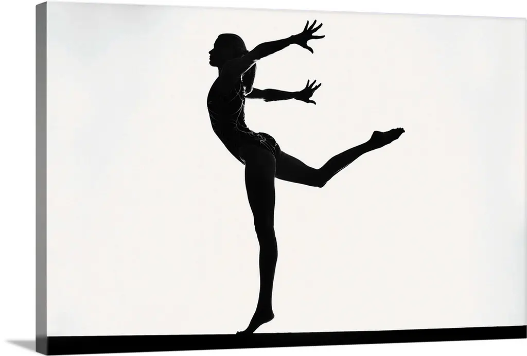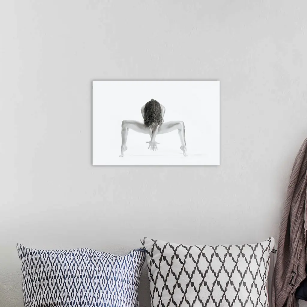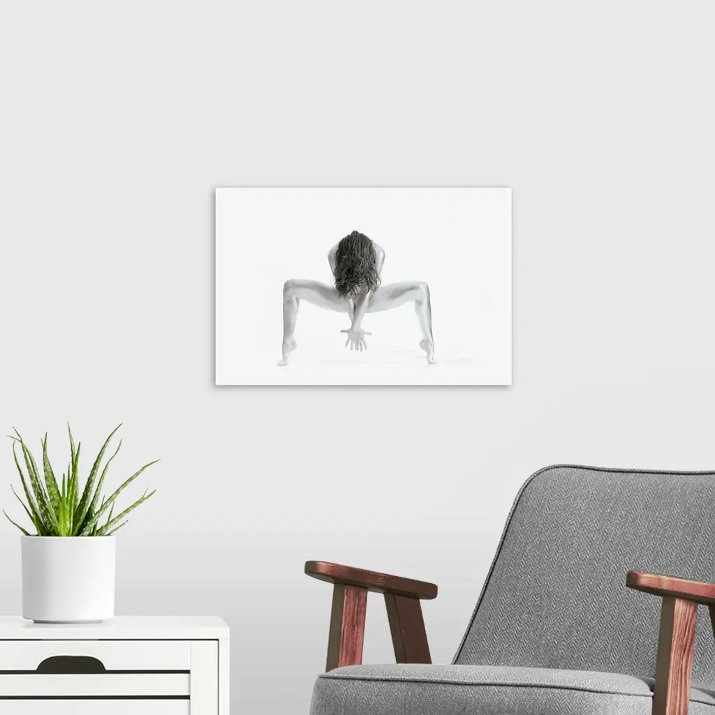 High key black and white portrait of a nude woman balancing and creating shapes with her body.