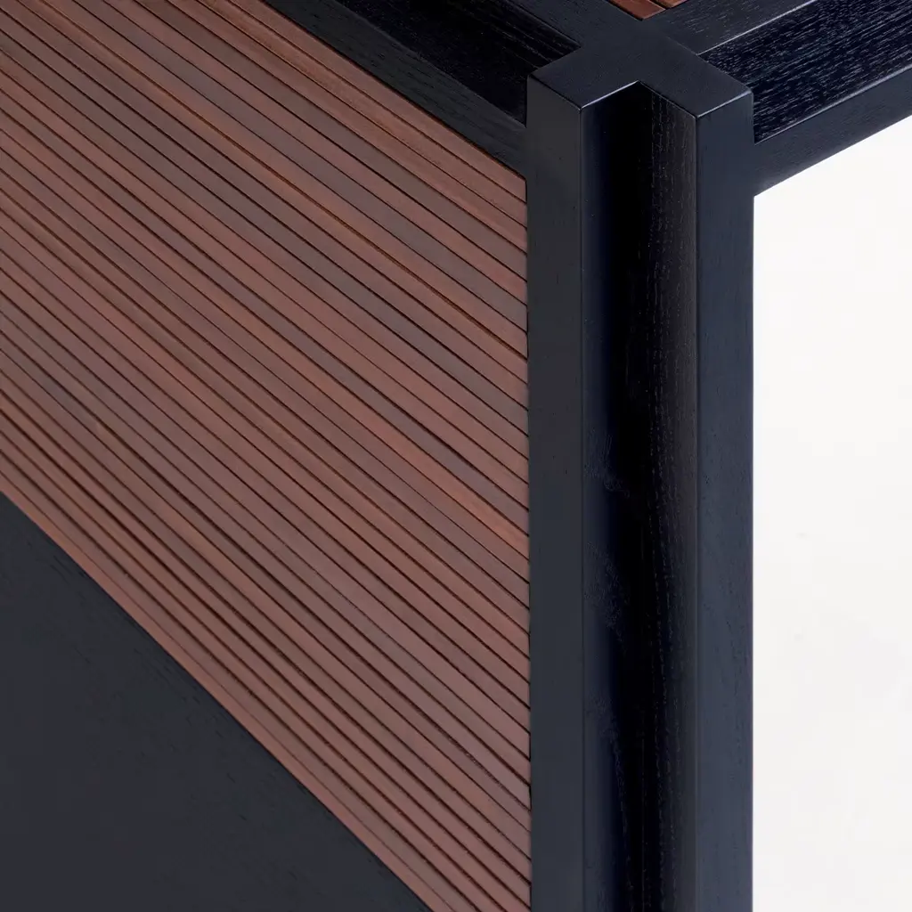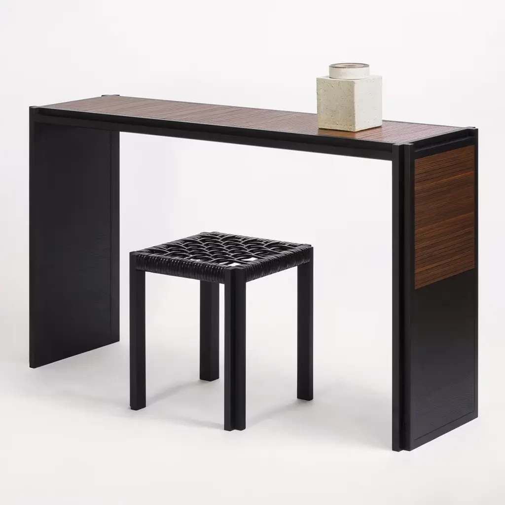 Merging mid-century sobriety and refined leather details, this elegant console will add function and style to any room, providing a place to display decorative objects, floral arrangements or lighting pieces. The simple, linear frame of wengé-finished wood boasts imposing legs supporting the narrow top, both covered with brown leather inserts with a crisscross pattern. This console is also available with black leather inserts and walnut finish for the wood.