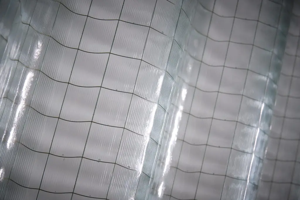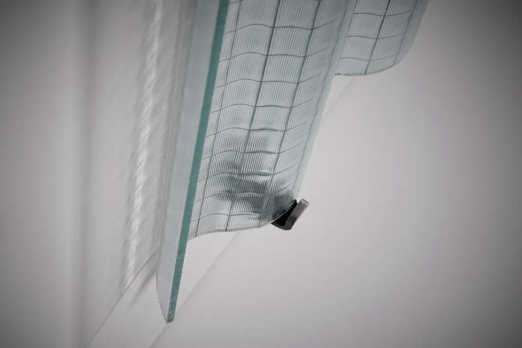 Exceptional corrugated glass panels by Saint-Gobain, France 1950s. Nice large panels from beautiful clear soft green tinted glass with metal wire inside, one smooth and one line structured side. The panels where produced in a small number for a short time by the well known French glass manufacturer Saint-Gobain. The panels would be beautiful as decorative wall panels, space dividers or any other architectural option. Unique opportunity to obtain these glass panels. We have a quantity of 16 panels available, all in very good condition.