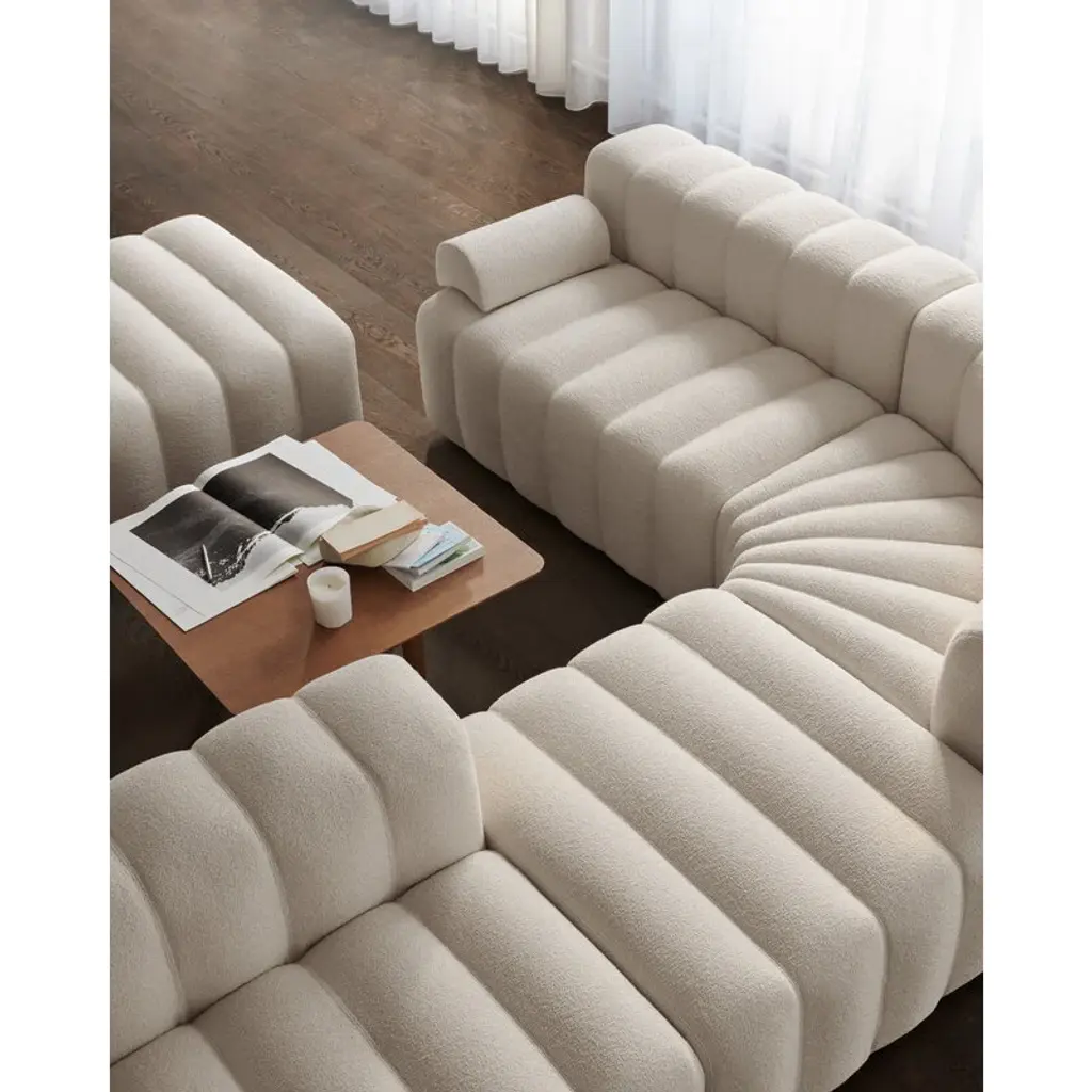 The Studio 1 modular sofa from Norr11 sweeps you off your feet with a uniquely sleek and sumptuous look, carrying groovy references to the unforgettable design era of the 1970s. However, you won’t be in a hurry to get back on your pins, as the plush sofa is not only visually pleasing but it’s also a treat to lounge on. A soft and supple bouclé upholstery completes the mood, adding a tactile touch to the space. The Studio sofa modules are elegantly finished throughout and are therefore quite perfect as stand-alone pieces as well. You can also add more parts for a spectacular ensemble, to make a statement in a larger space. The armrest can be moved as desired – or removed completely.
