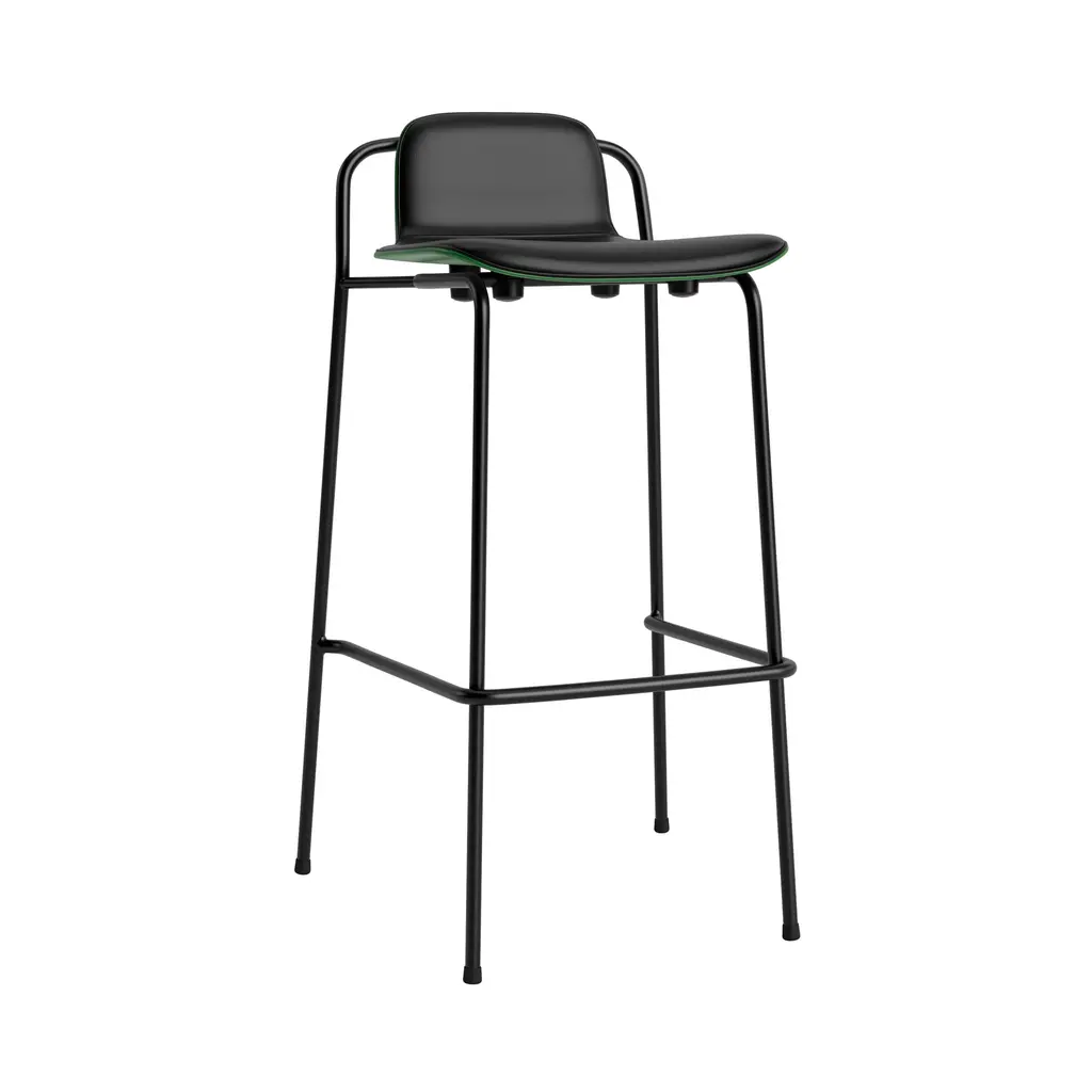 Front upholstery allows for a personalized version of designer Simon Legald's bar- and counter-height stool for Norman Copenhagen. With its oak plywood shell and black steel frame, Studio's padded front is sheathed in a choice of premium fabrics or naturally treated leather. The crisp profile of the frame lends an elegant counterpoint to the softer seat contours making it a standout for both private and public spaces.