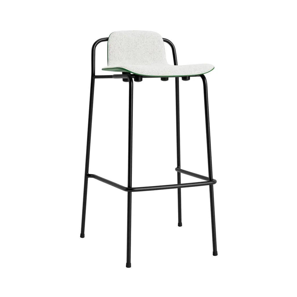Front upholstery allows for a personalized version of designer Simon Legald's bar- and counter-height stool for Norman Copenhagen. With its oak plywood shell and black steel frame, Studio's padded front is sheathed in a choice of premium fabrics or naturally treated leather. The crisp profile of the frame lends an elegant counterpoint to the softer seat contours making it a standout for both private and public spaces.