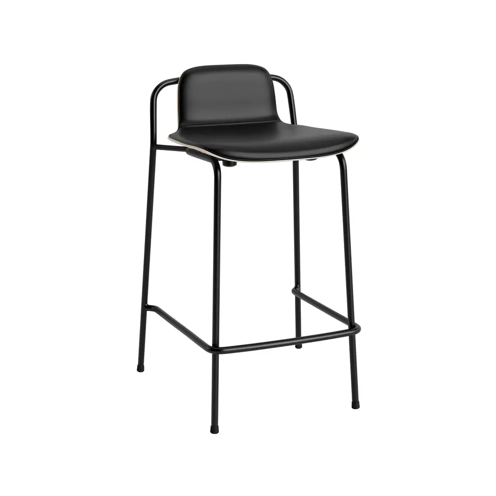 Front upholstery allows for a personalized version of designer Simon Legald's bar- and counter-height stool for Norman Copenhagen. With its oak plywood shell and black steel frame, Studio's padded front is sheathed in a choice of premium fabrics or naturally treated leather. The crisp profile of the frame lends an elegant counterpoint to the softer seat contours making it a standout for both private and public spaces.