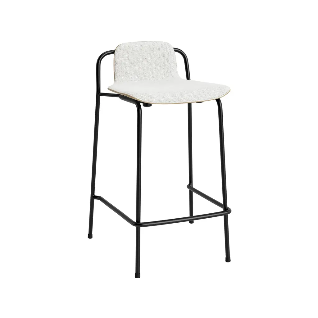 Front upholstery allows for a personalized version of designer Simon Legald's bar- and counter-height stool for Norman Copenhagen. With its oak plywood shell and black steel frame, Studio's padded front is sheathed in a choice of premium fabrics or naturally treated leather. The crisp profile of the frame lends an elegant counterpoint to the softer seat contours making it a standout for both private and public spaces.